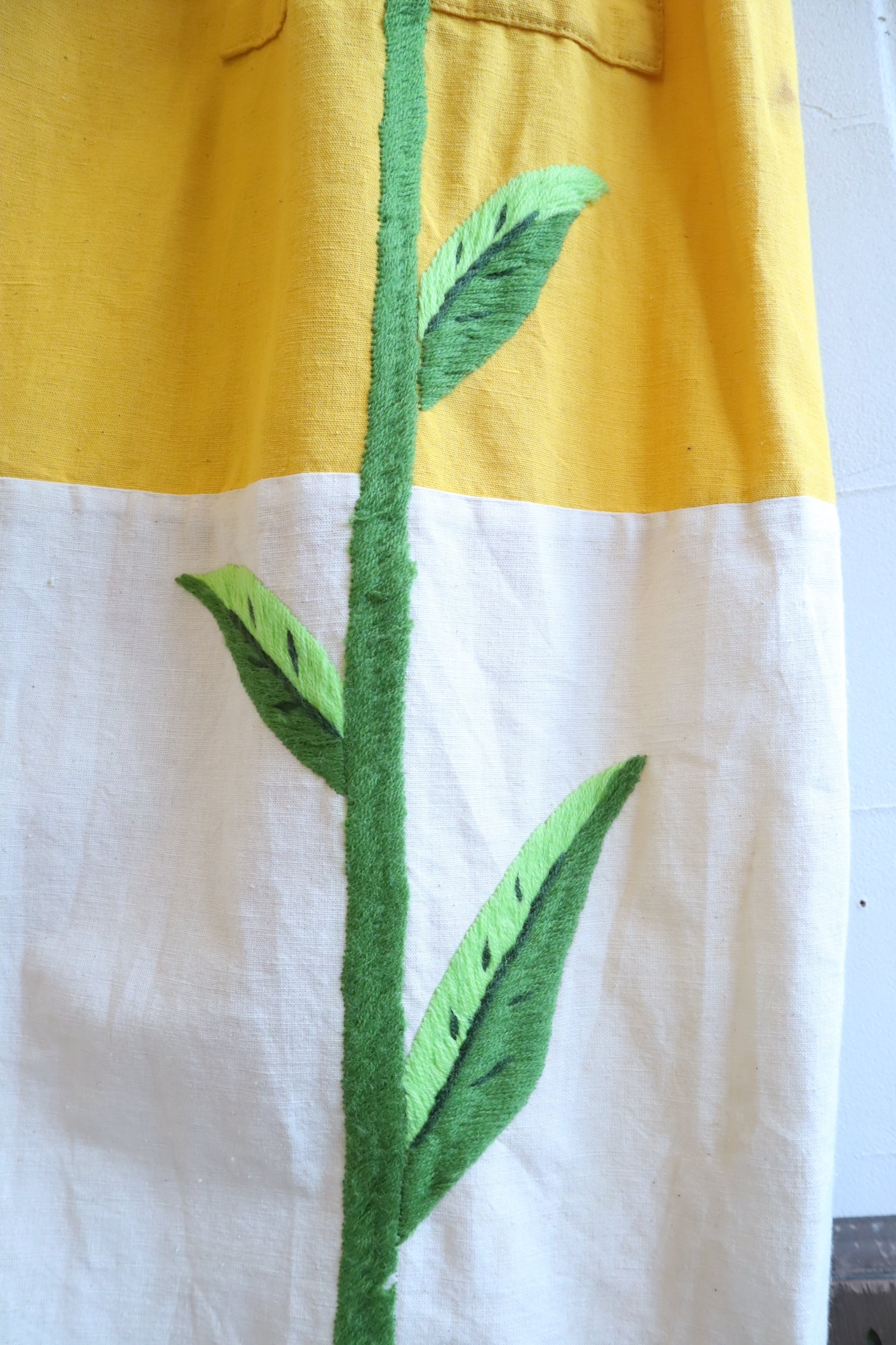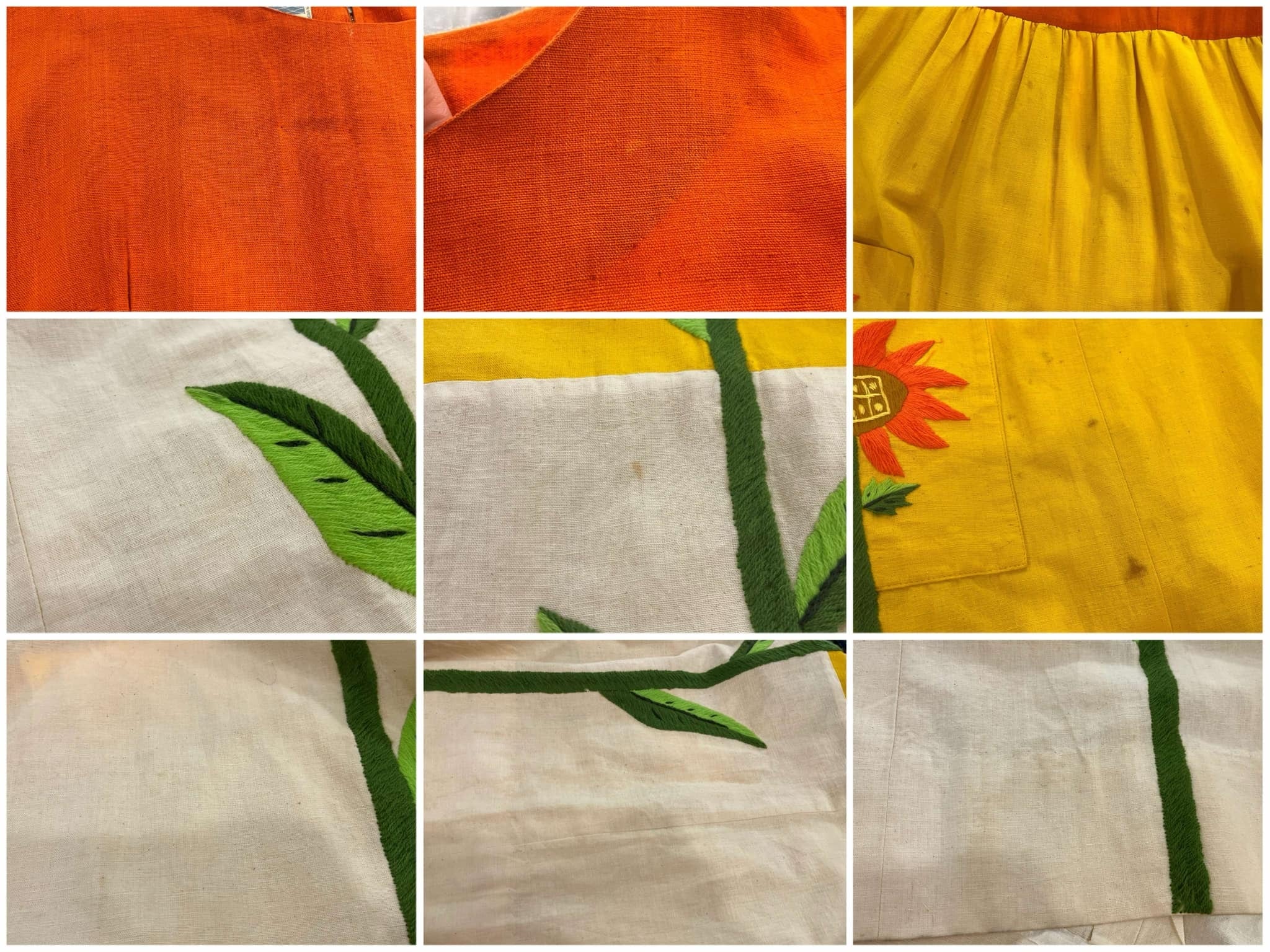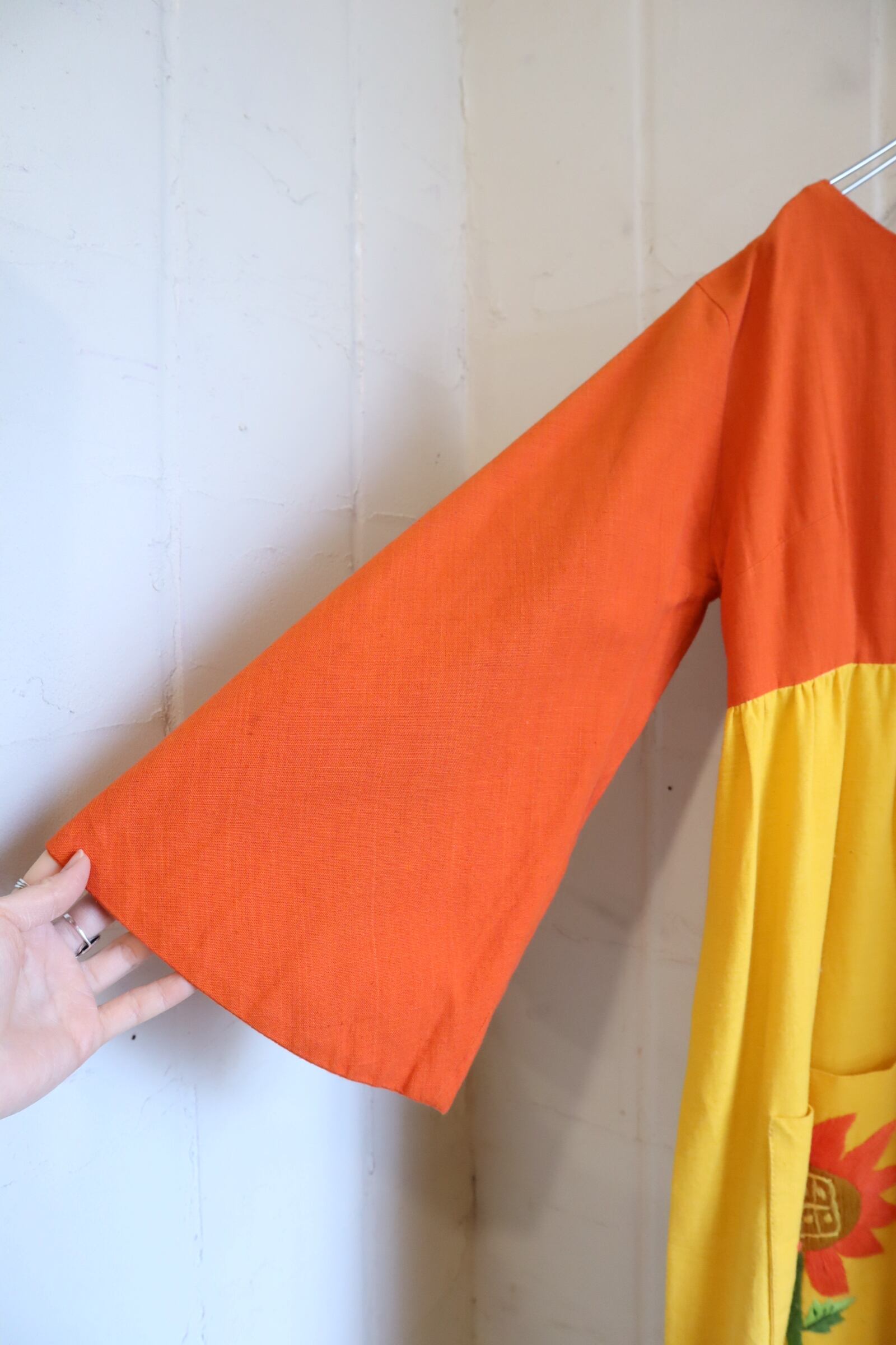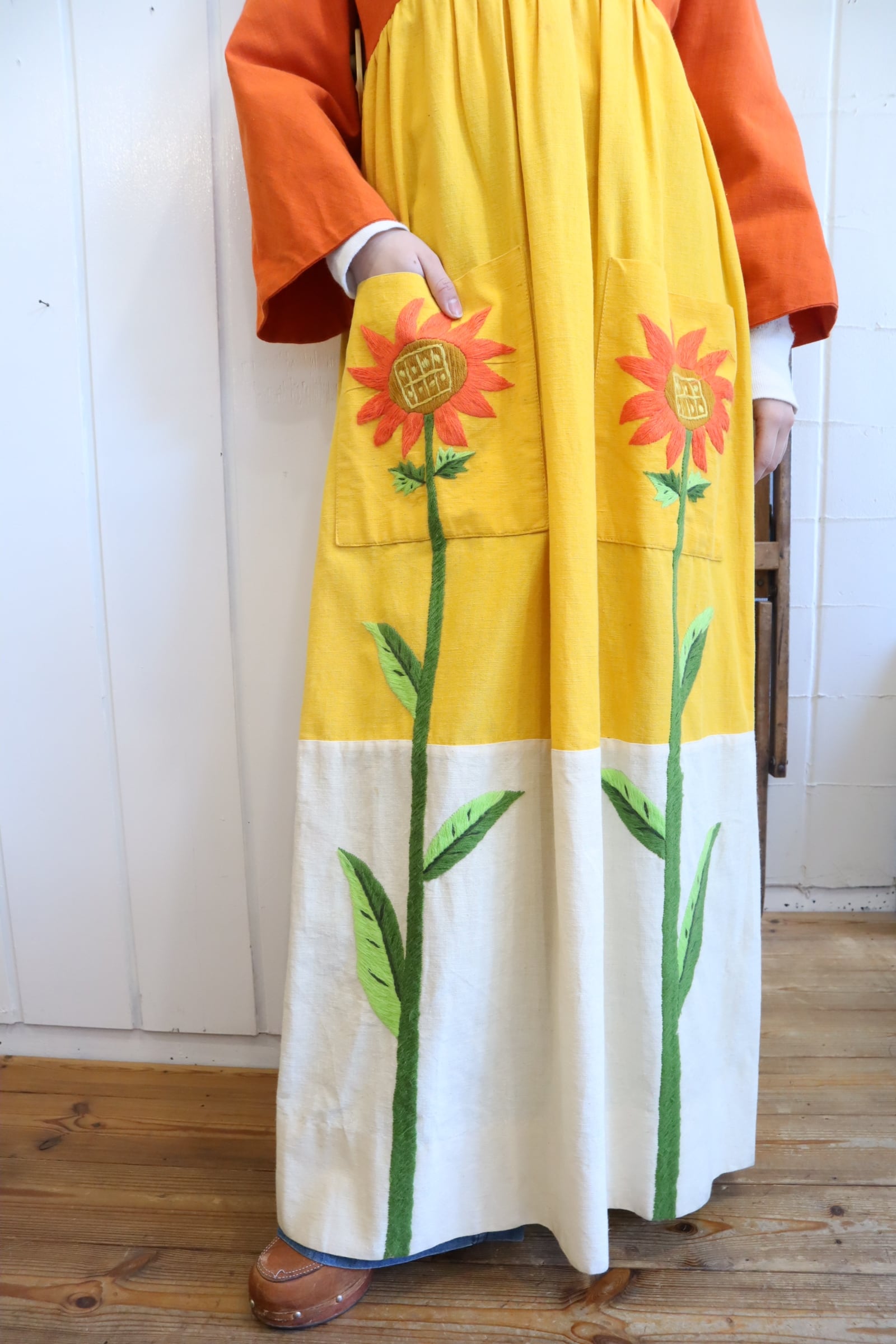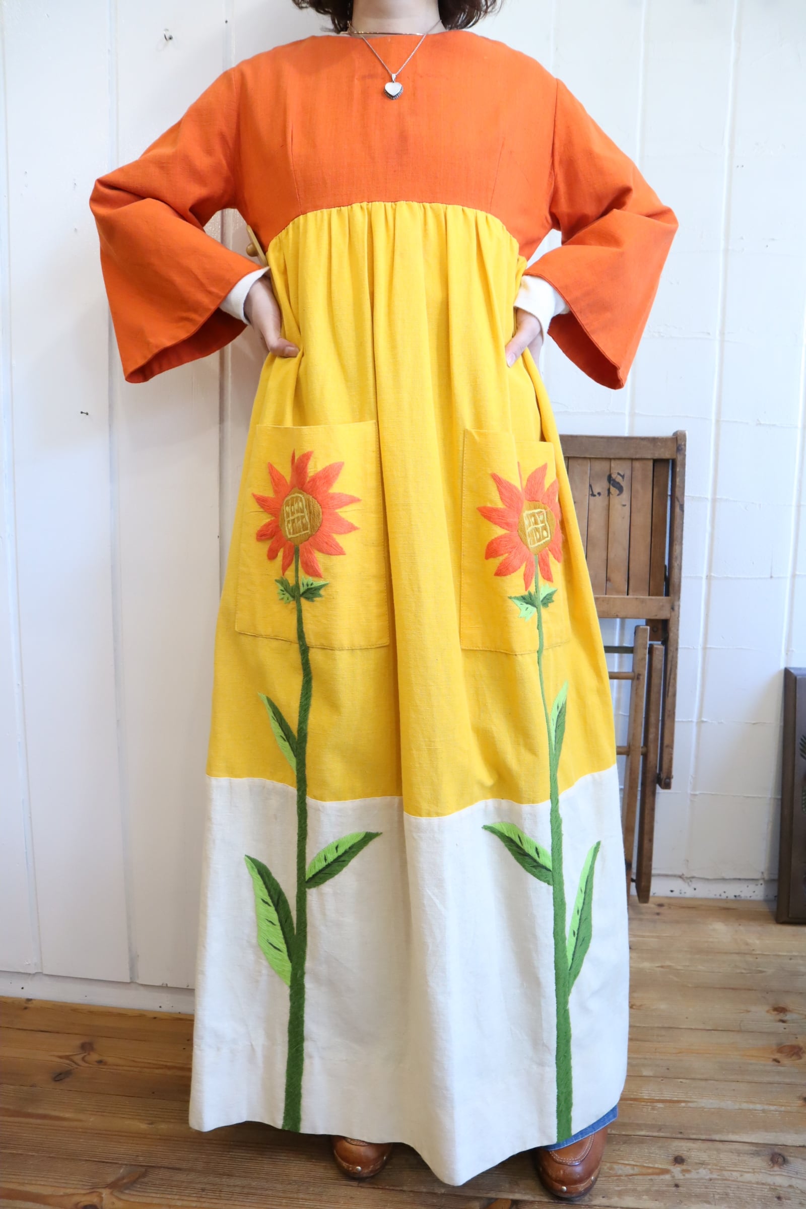 70s orange×yellow sunflower embroidery Mexican dress [l-4977]