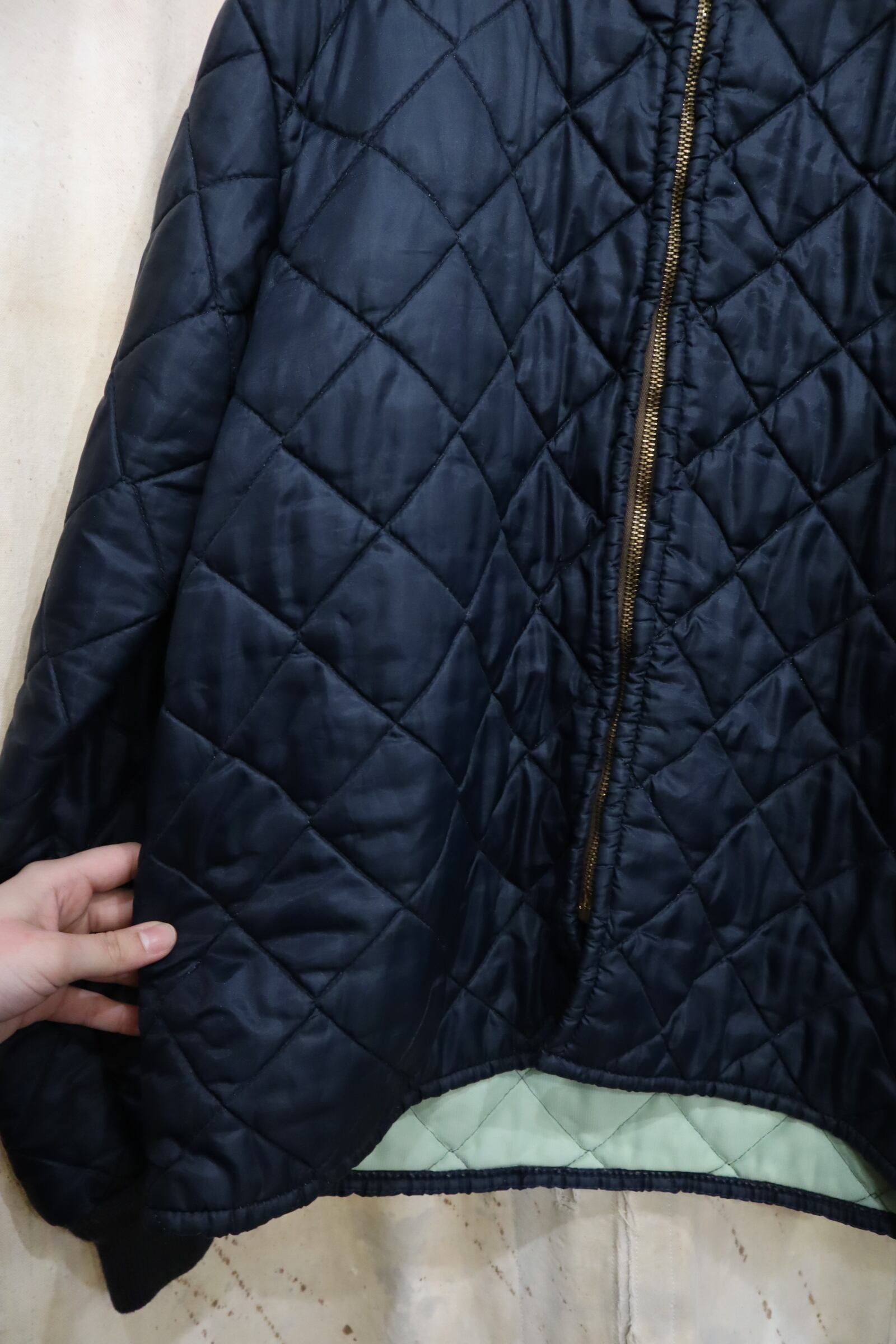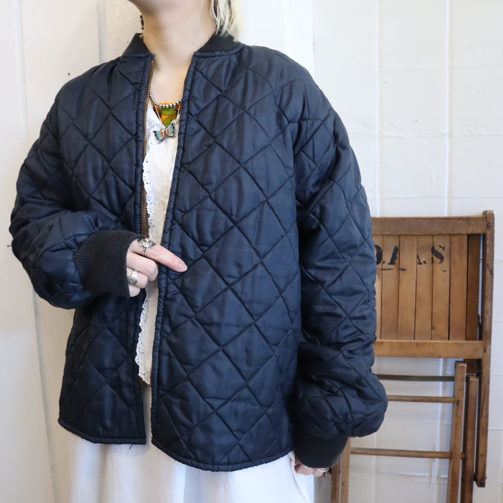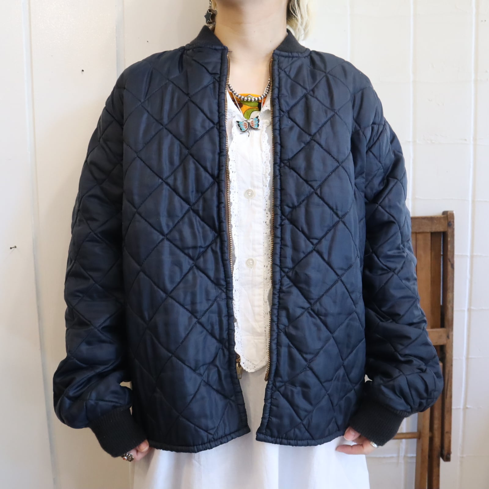 カジュアルにも上品にも合わせやすいネイビーカラーのビンテージキルティングジャケット。