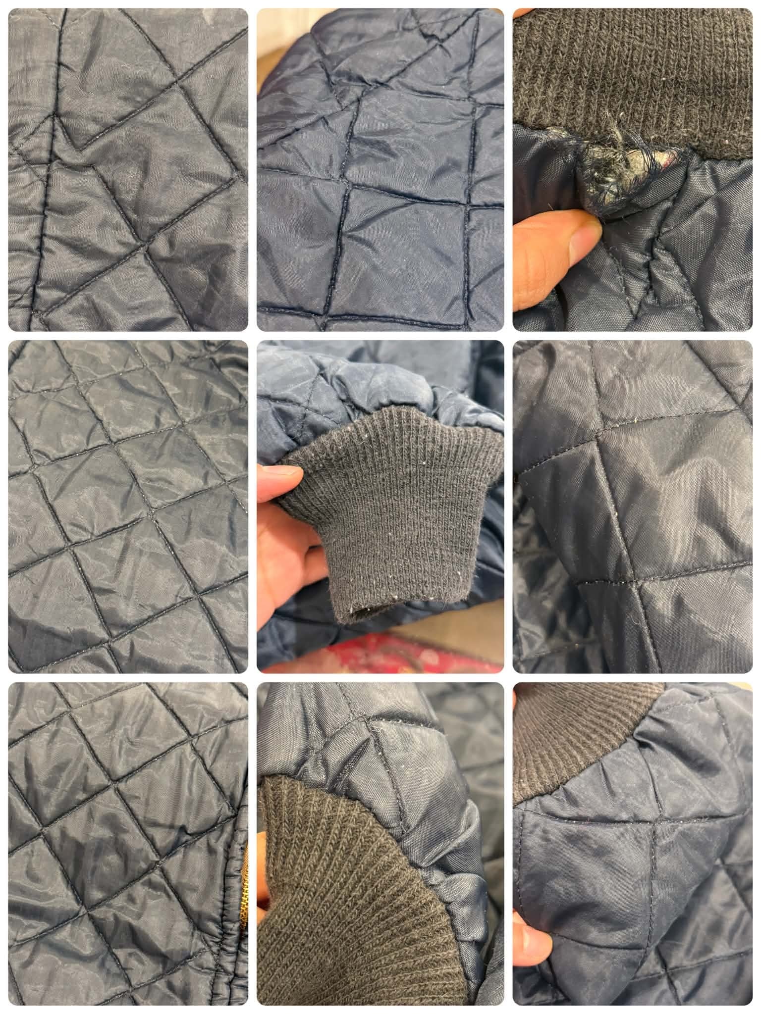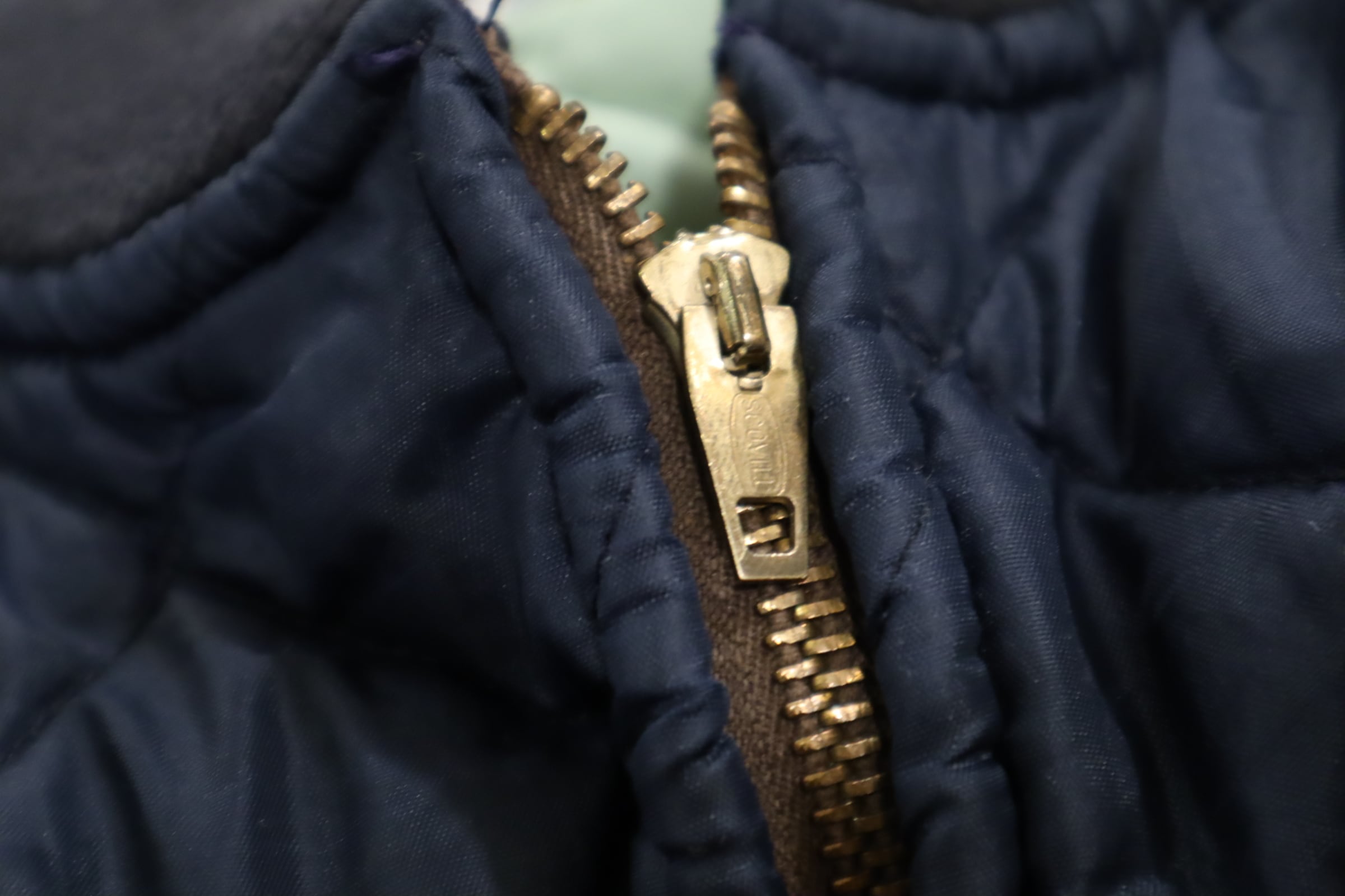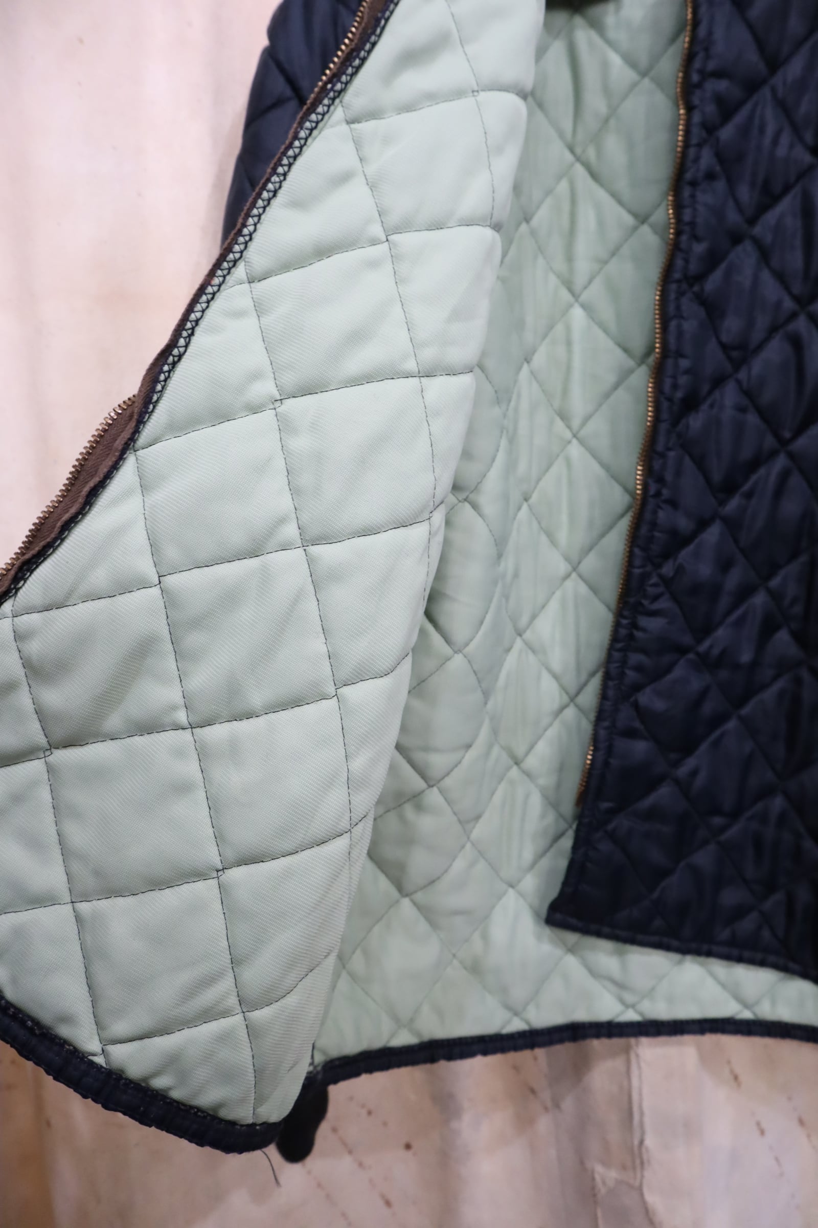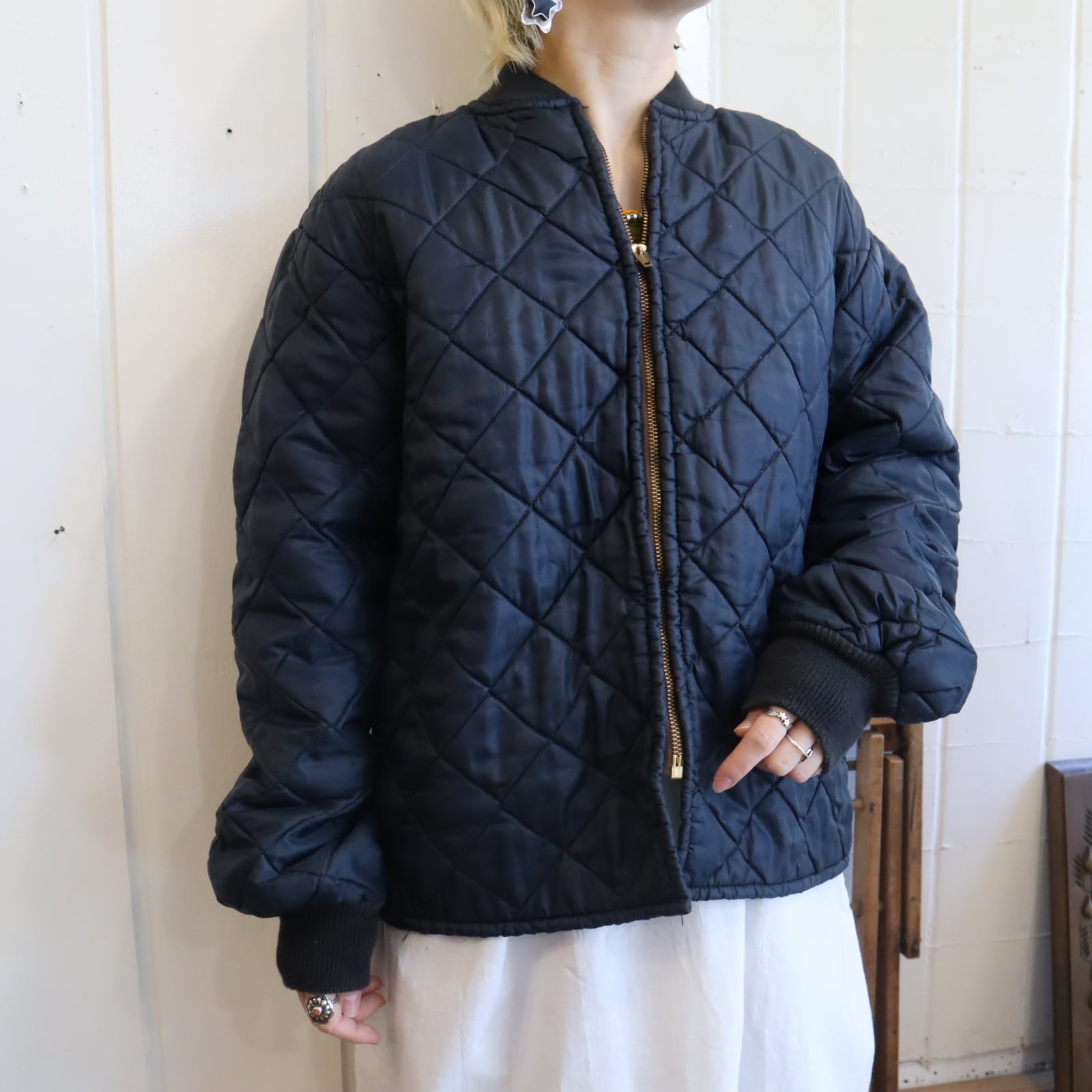 カジュアルにも上品にも合わせやすいネイビーカラーのビンテージキルティングジャケット。