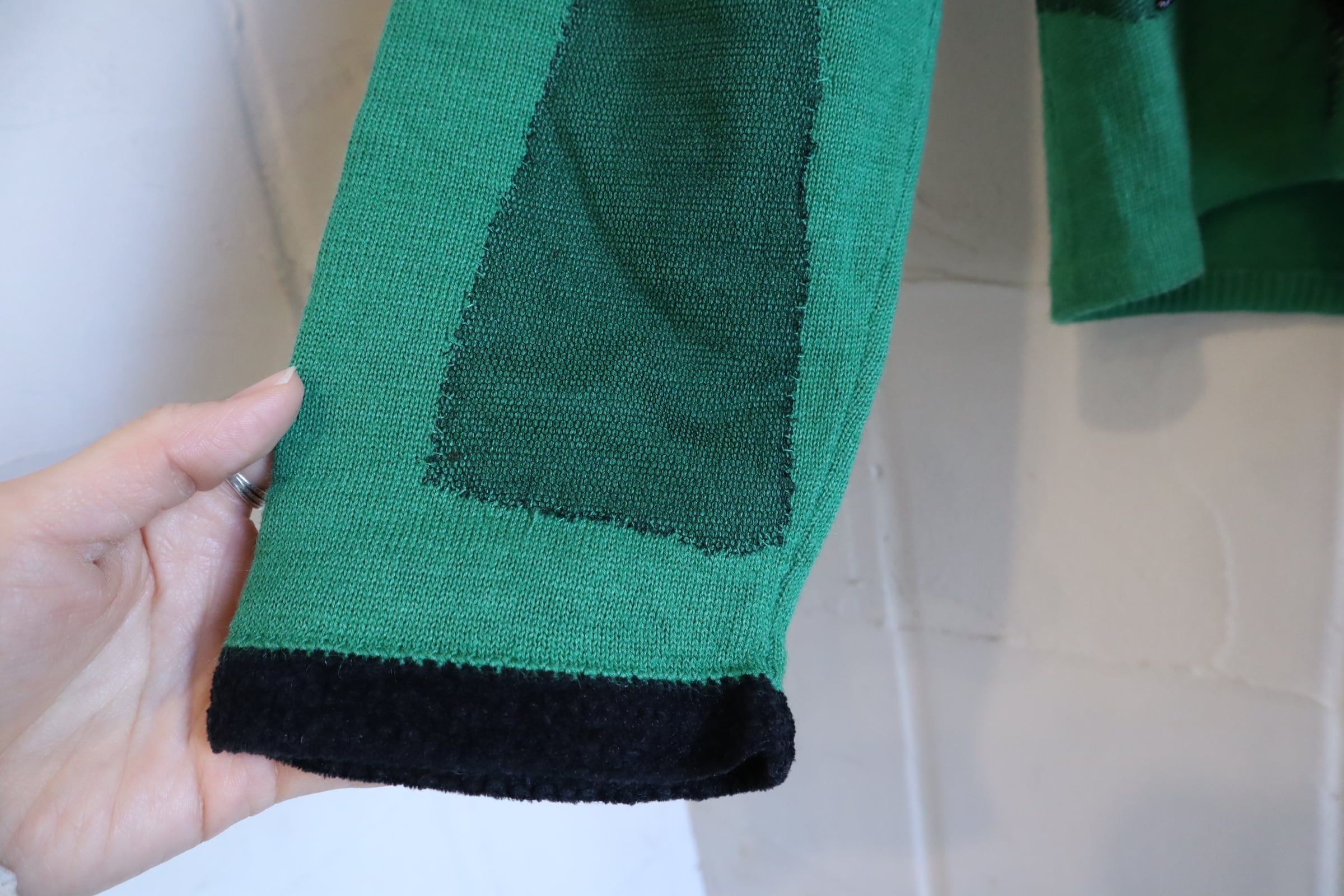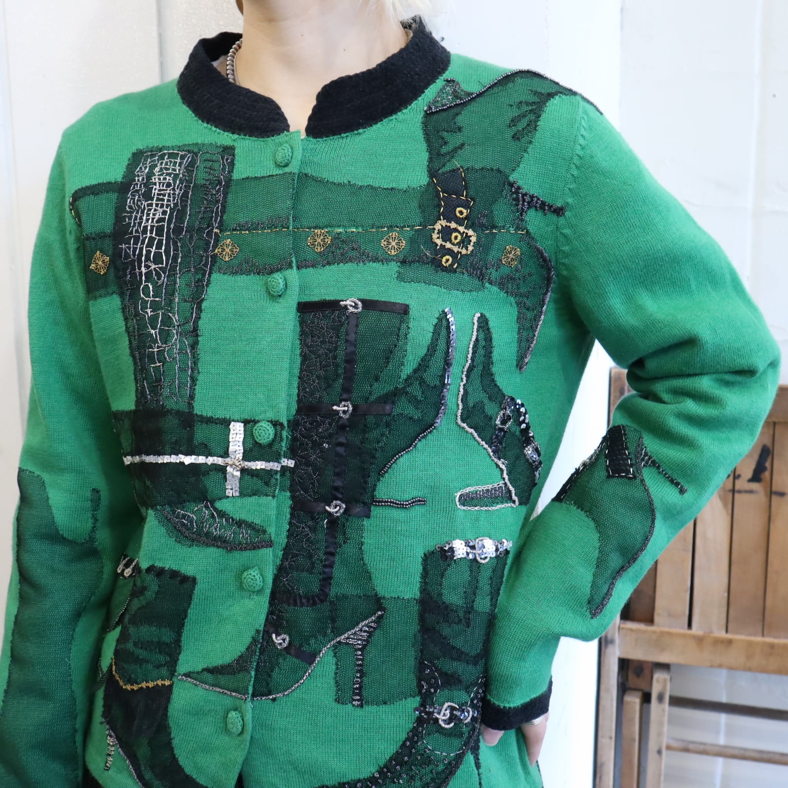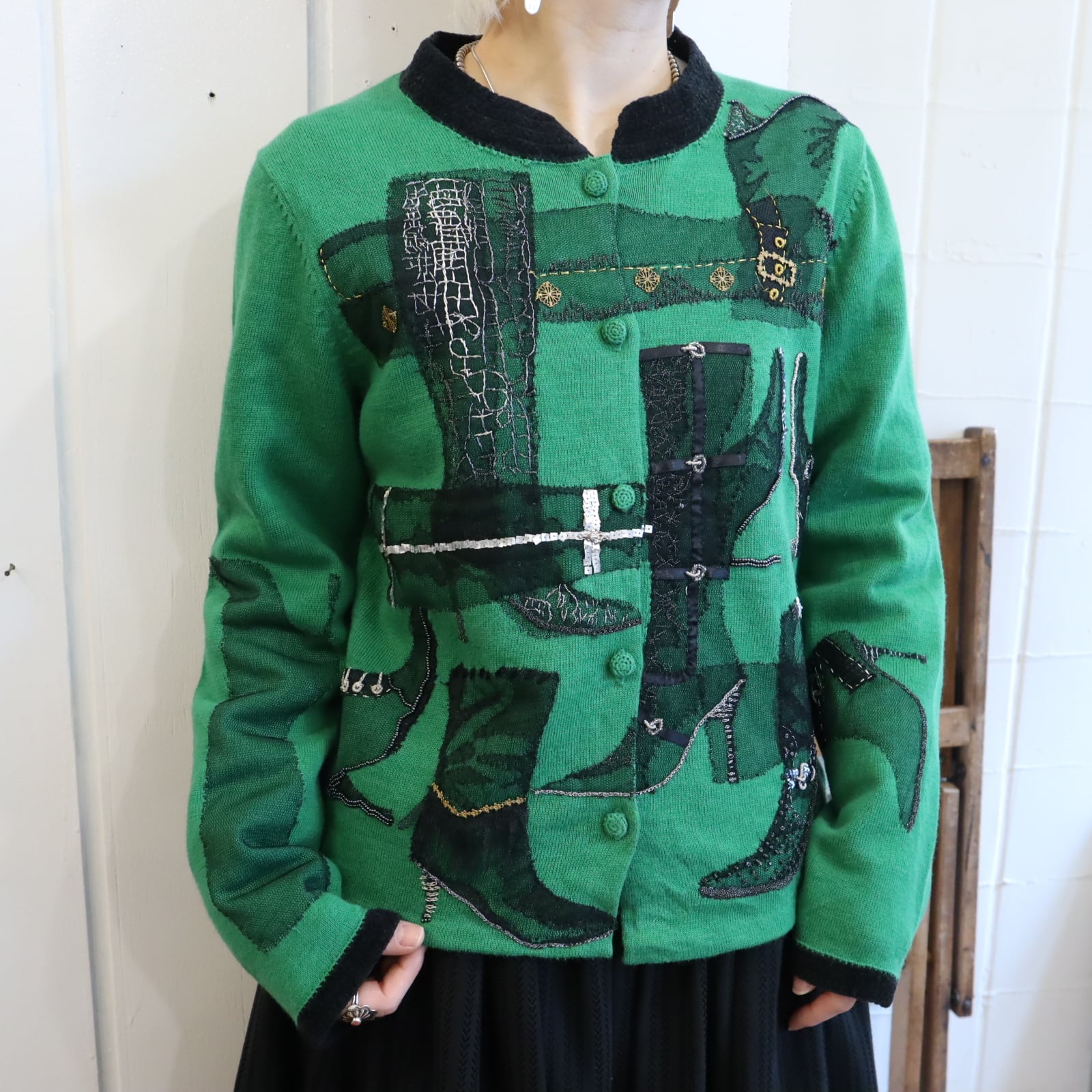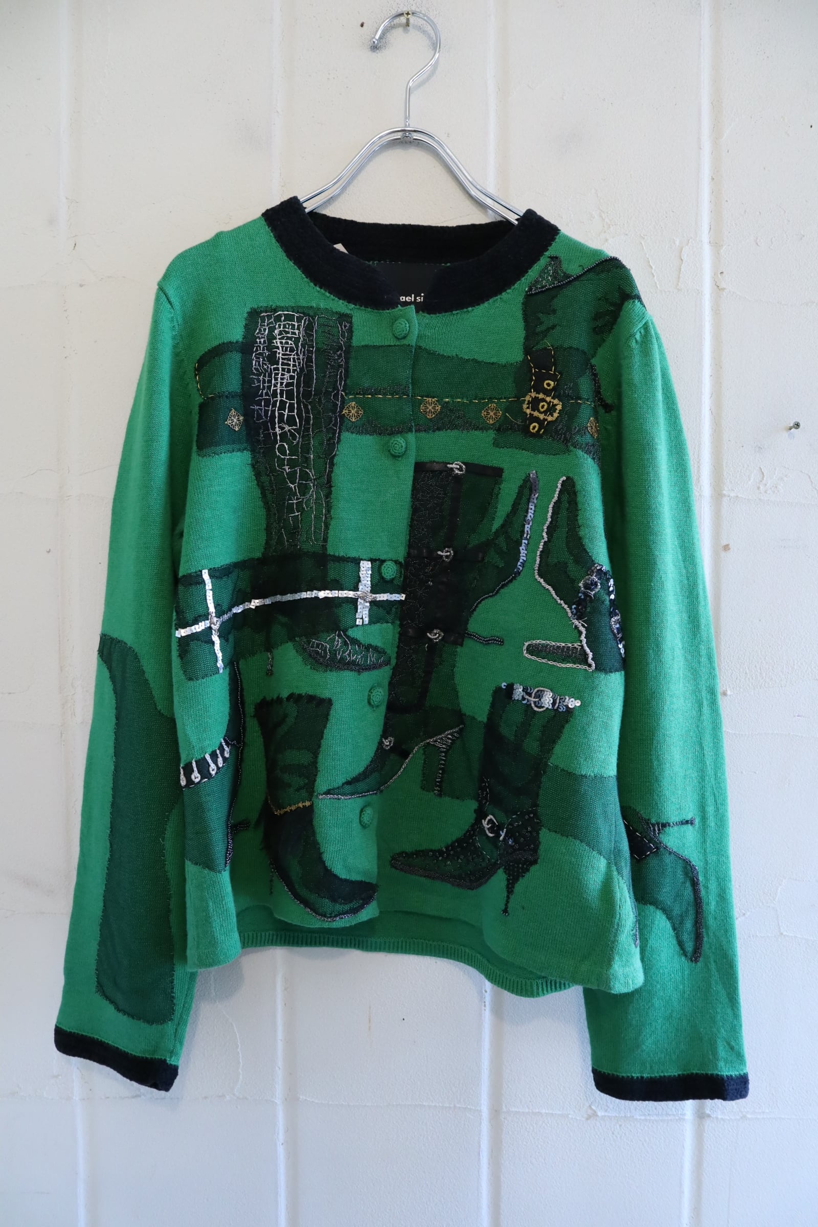 michael simon green×black shoes motif ramie cotton knit cardigan [l-4982]