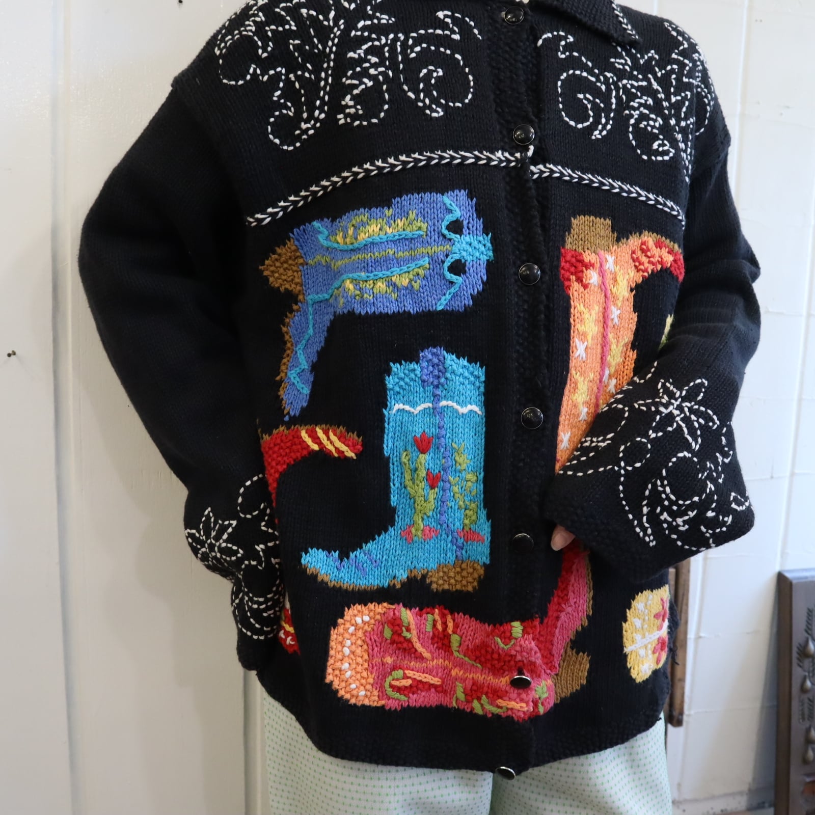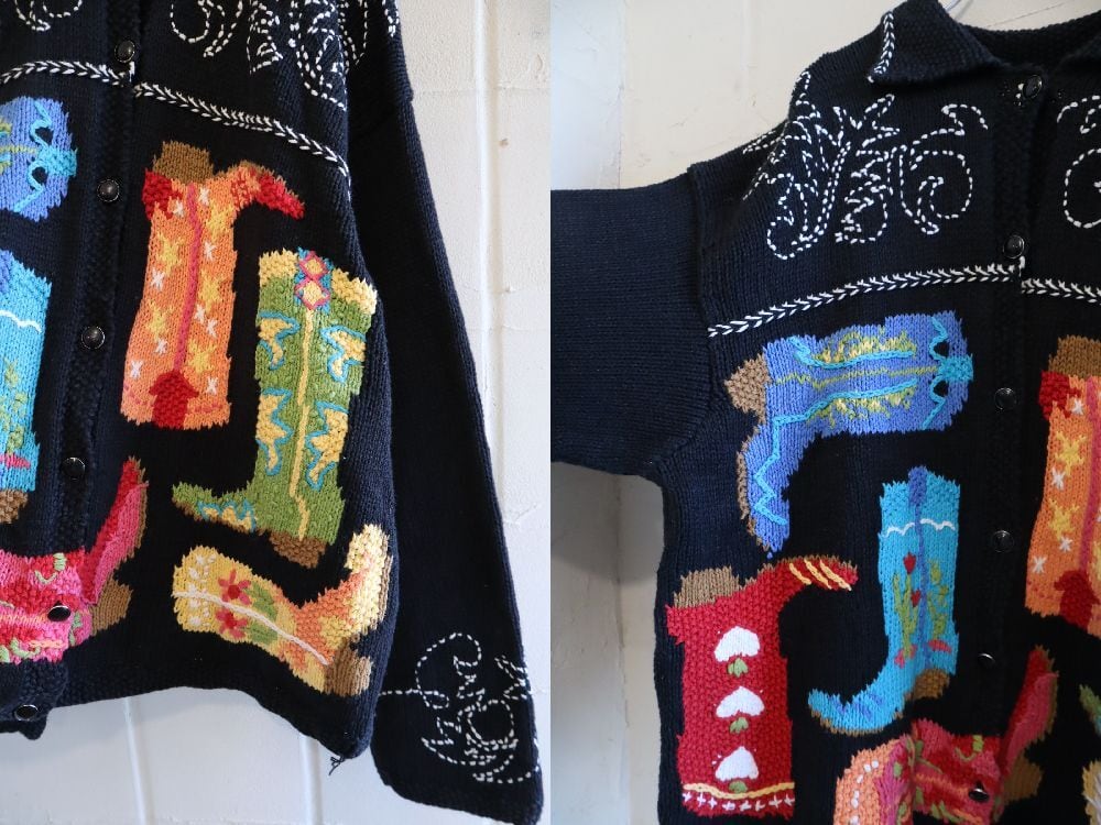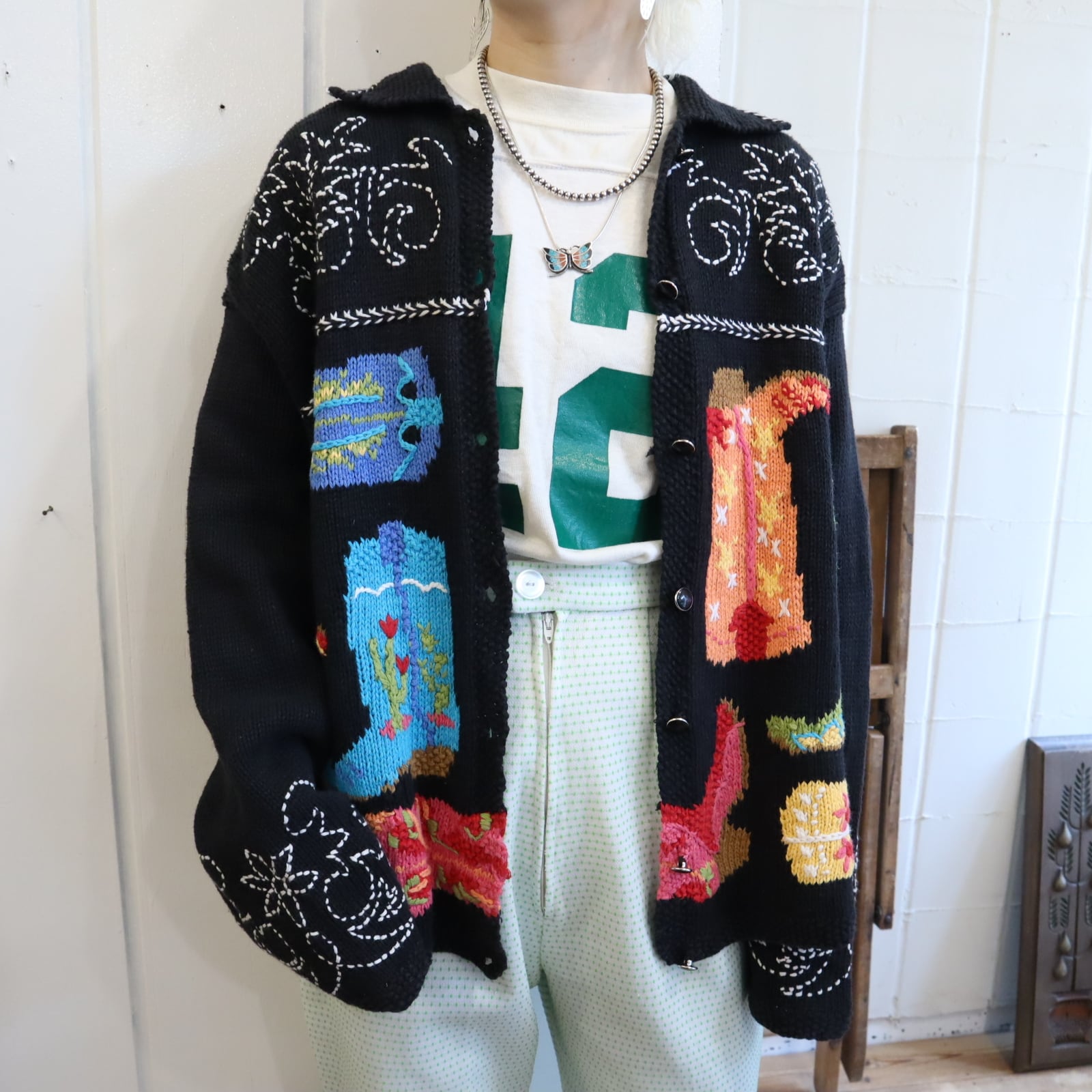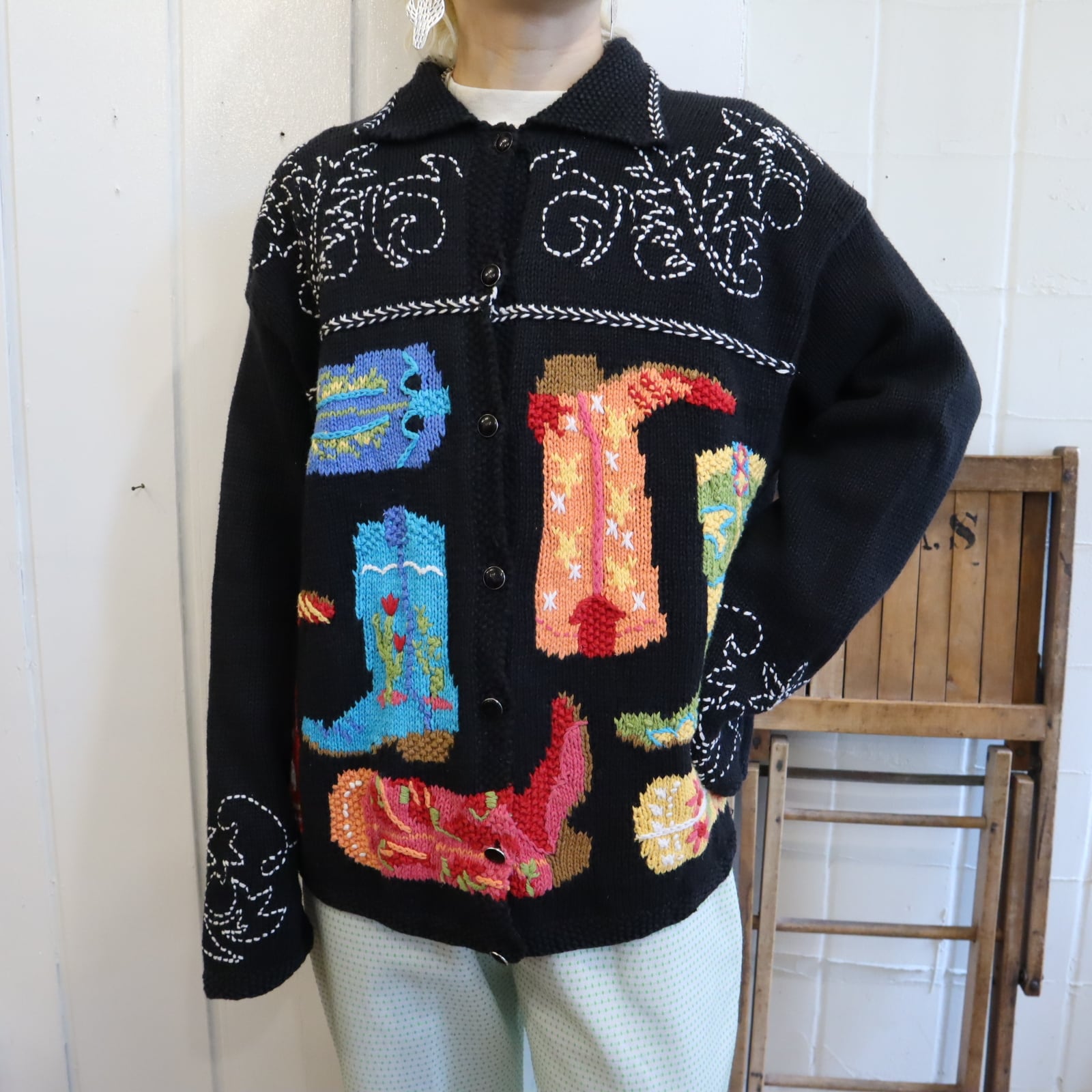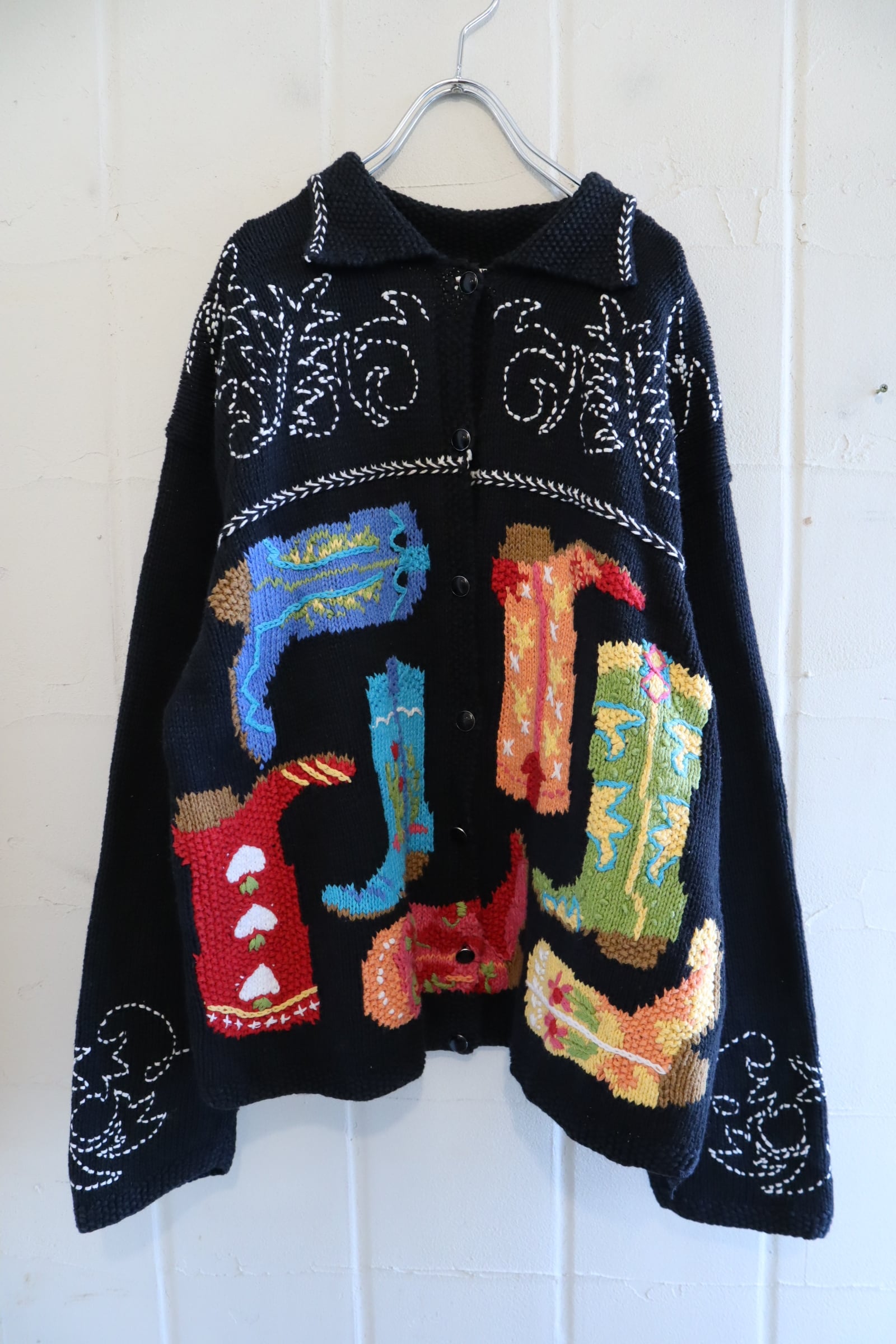 カラフルなウエスタンブーツが可愛い襟付きのハンドニットカーディガン。