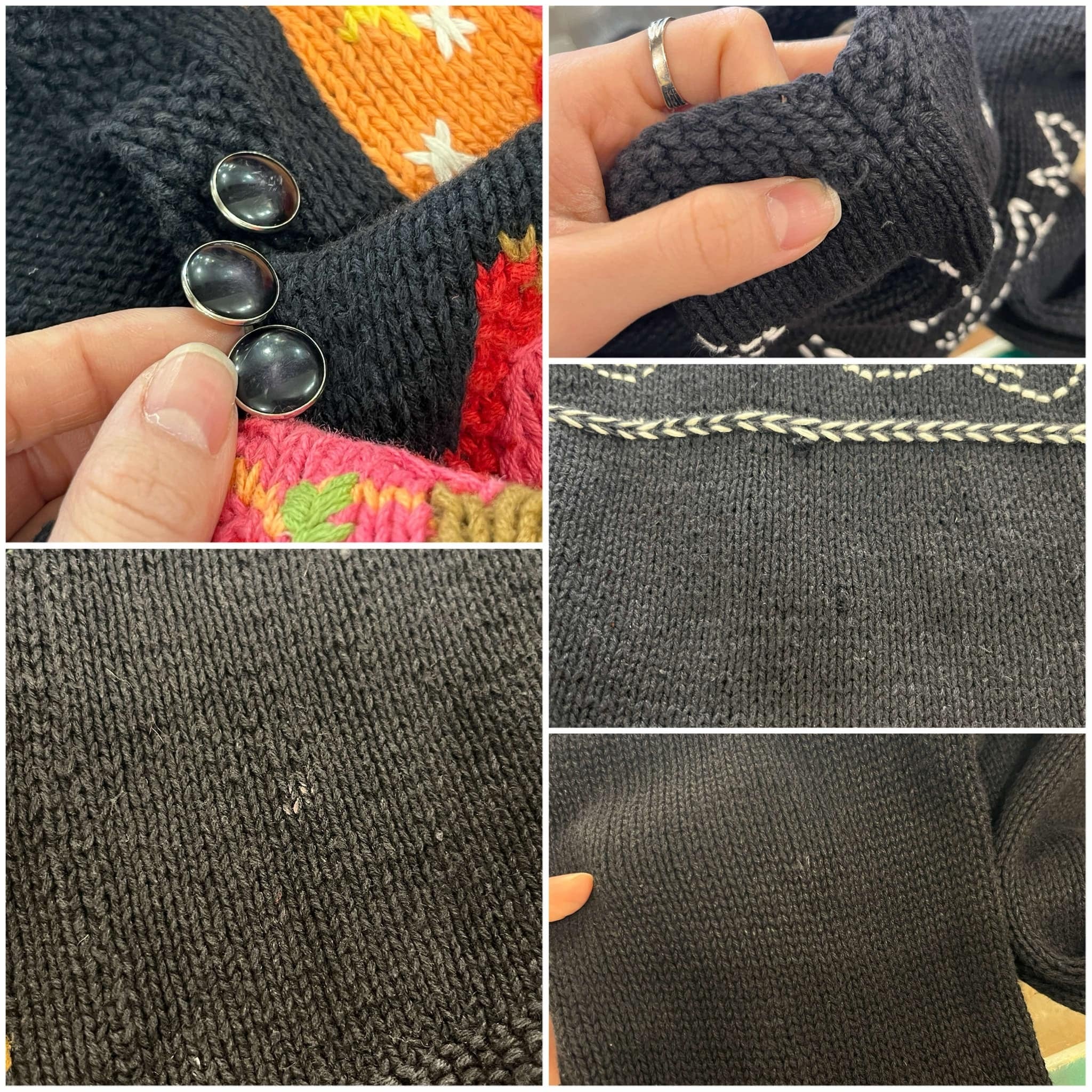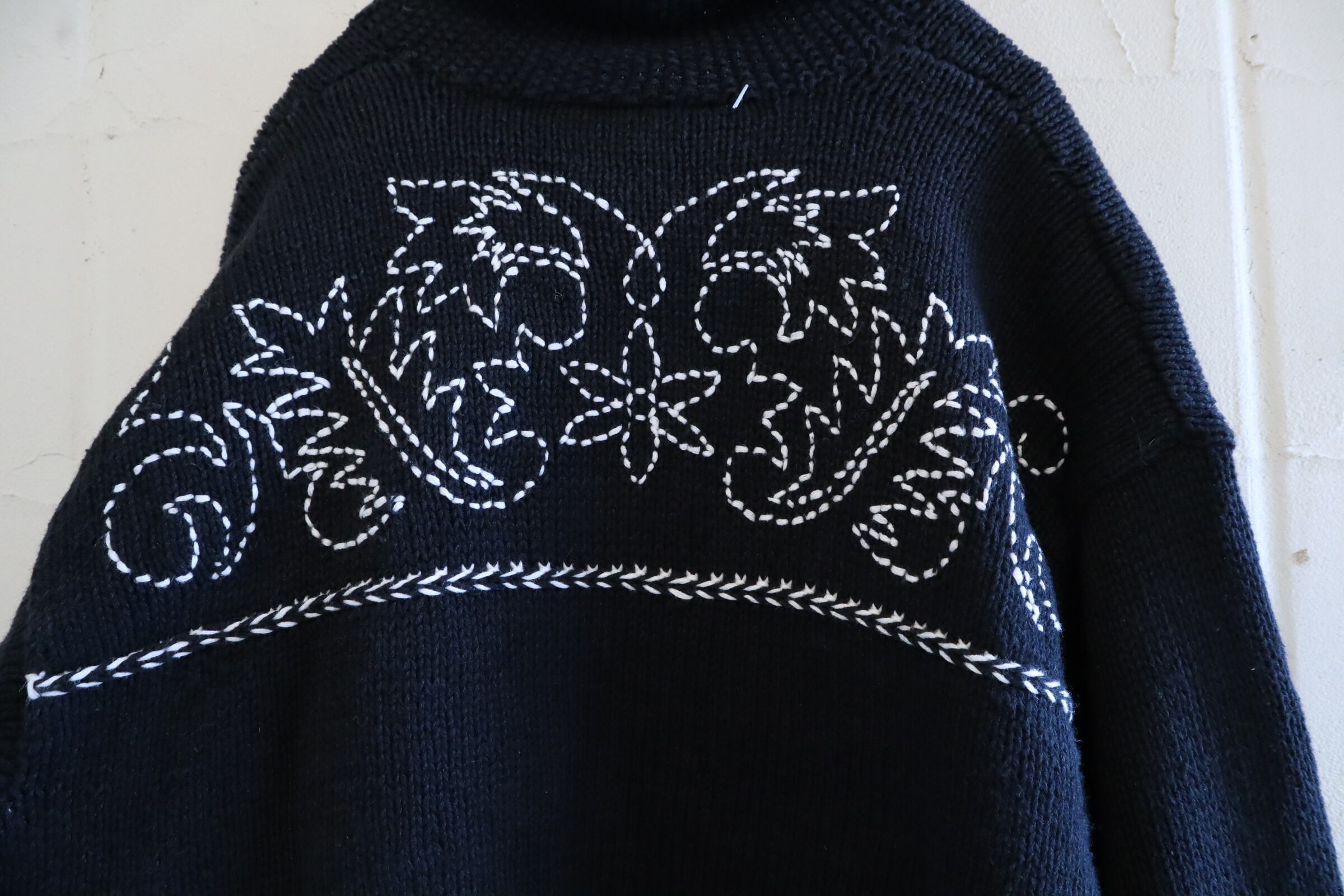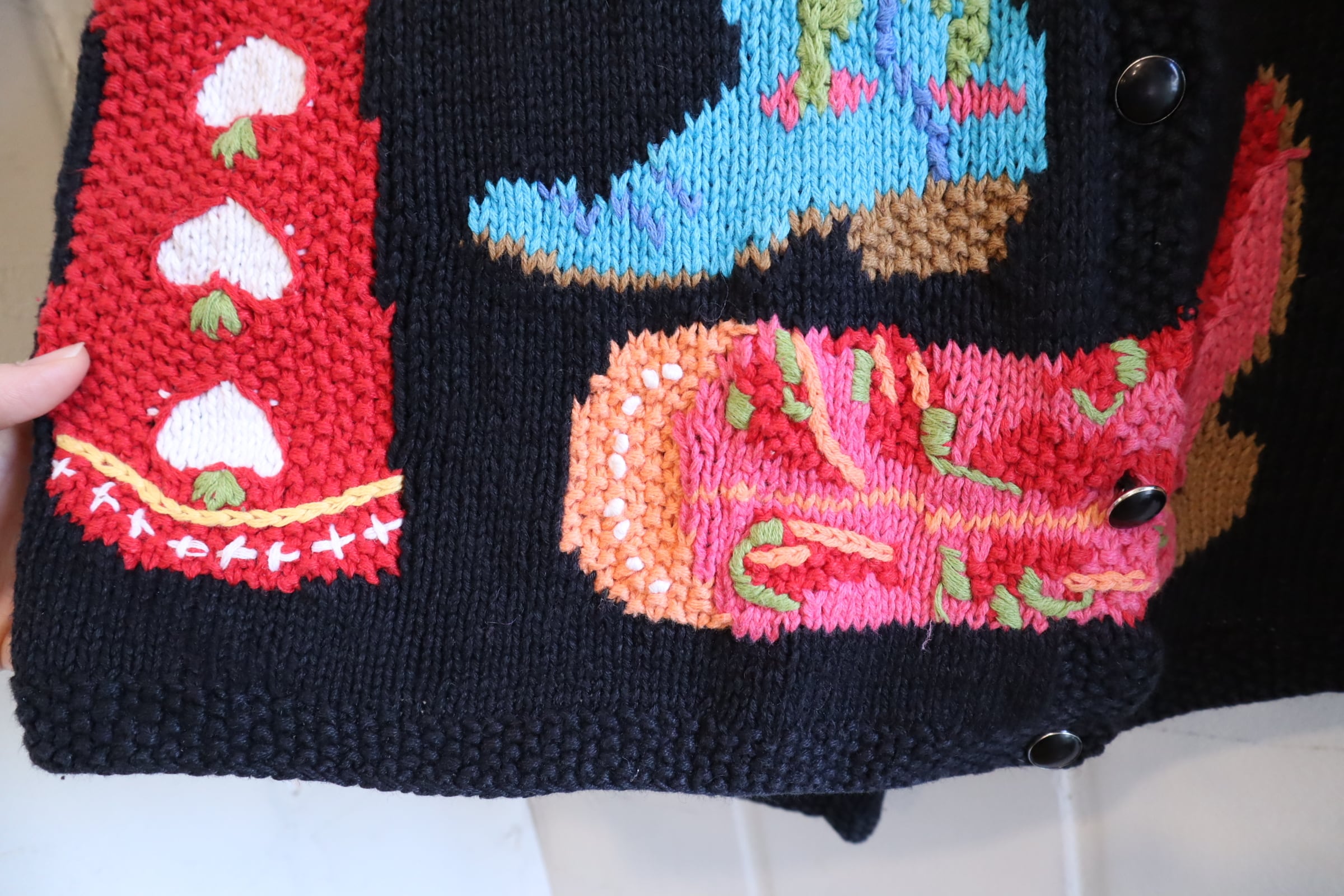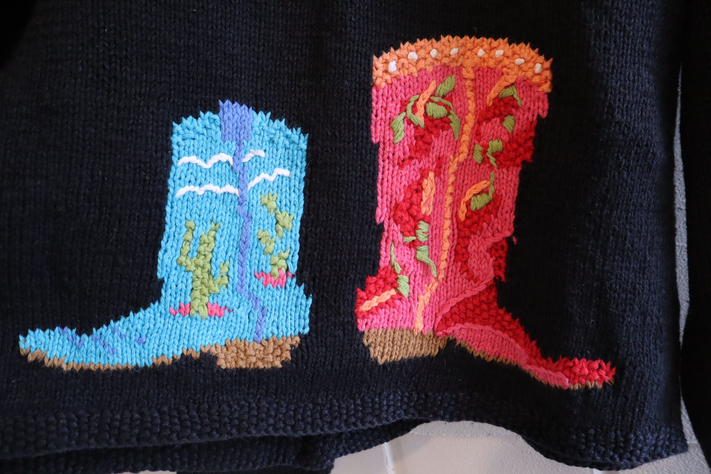 カラフルなウエスタンブーツが可愛い襟付きのハンドニットカーディガン。
