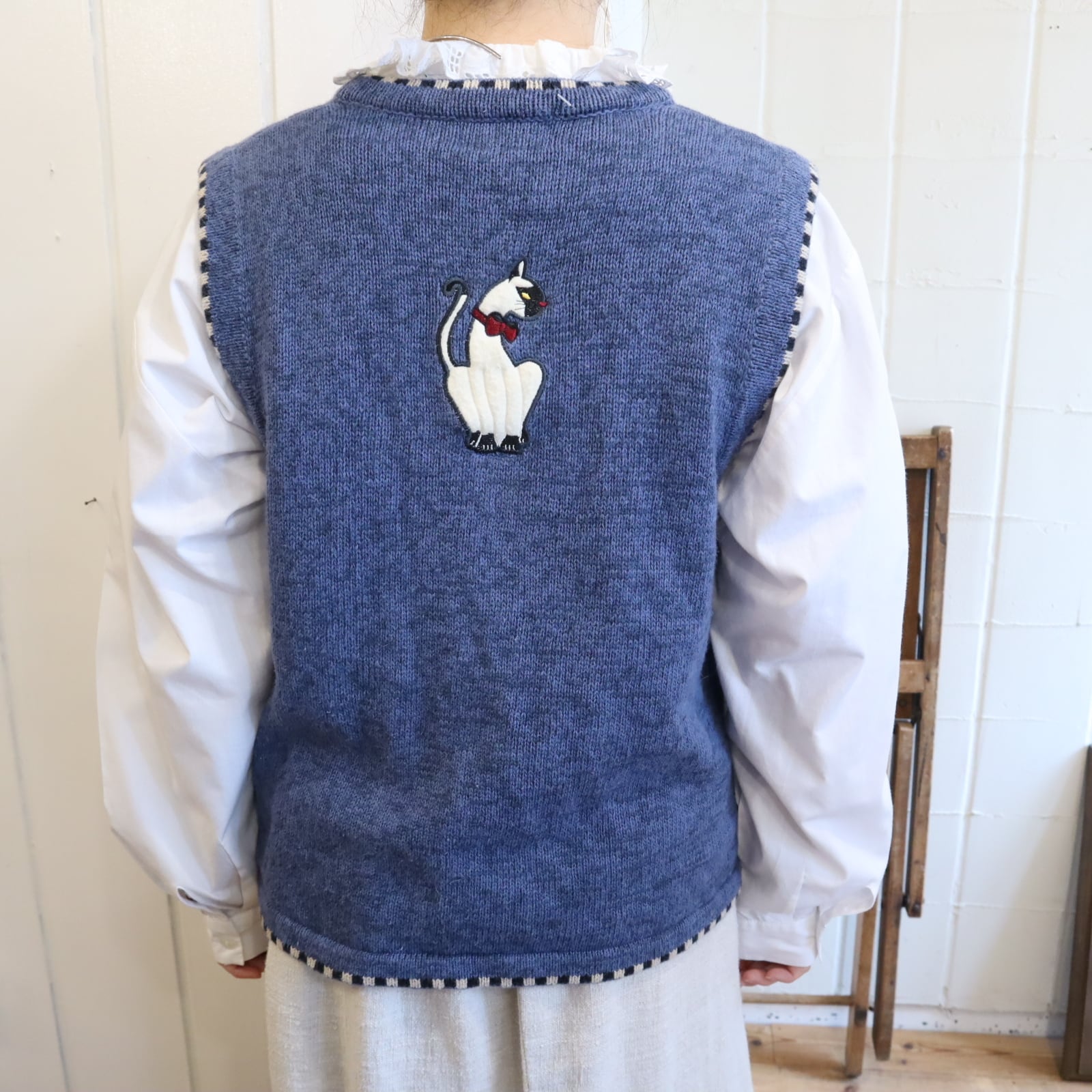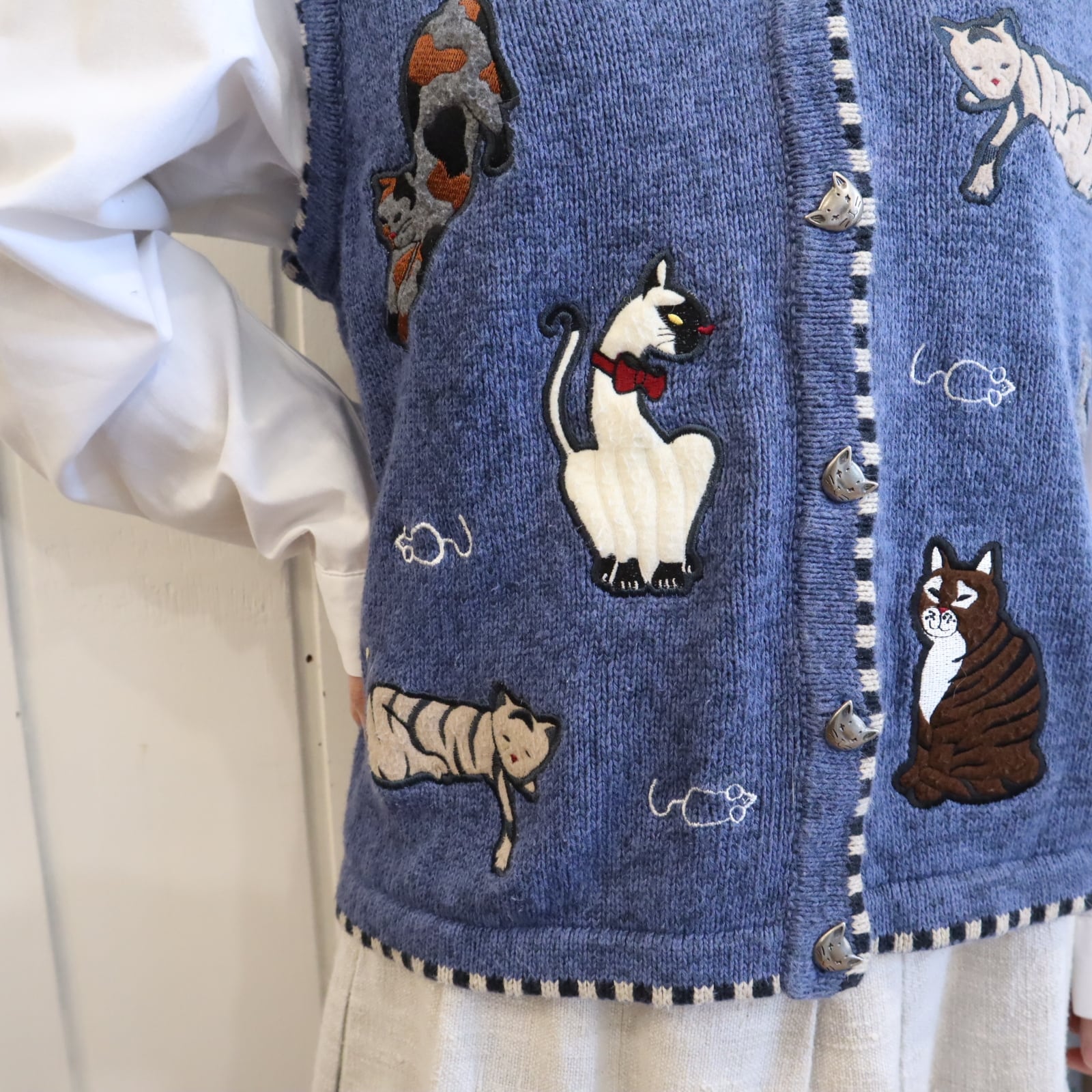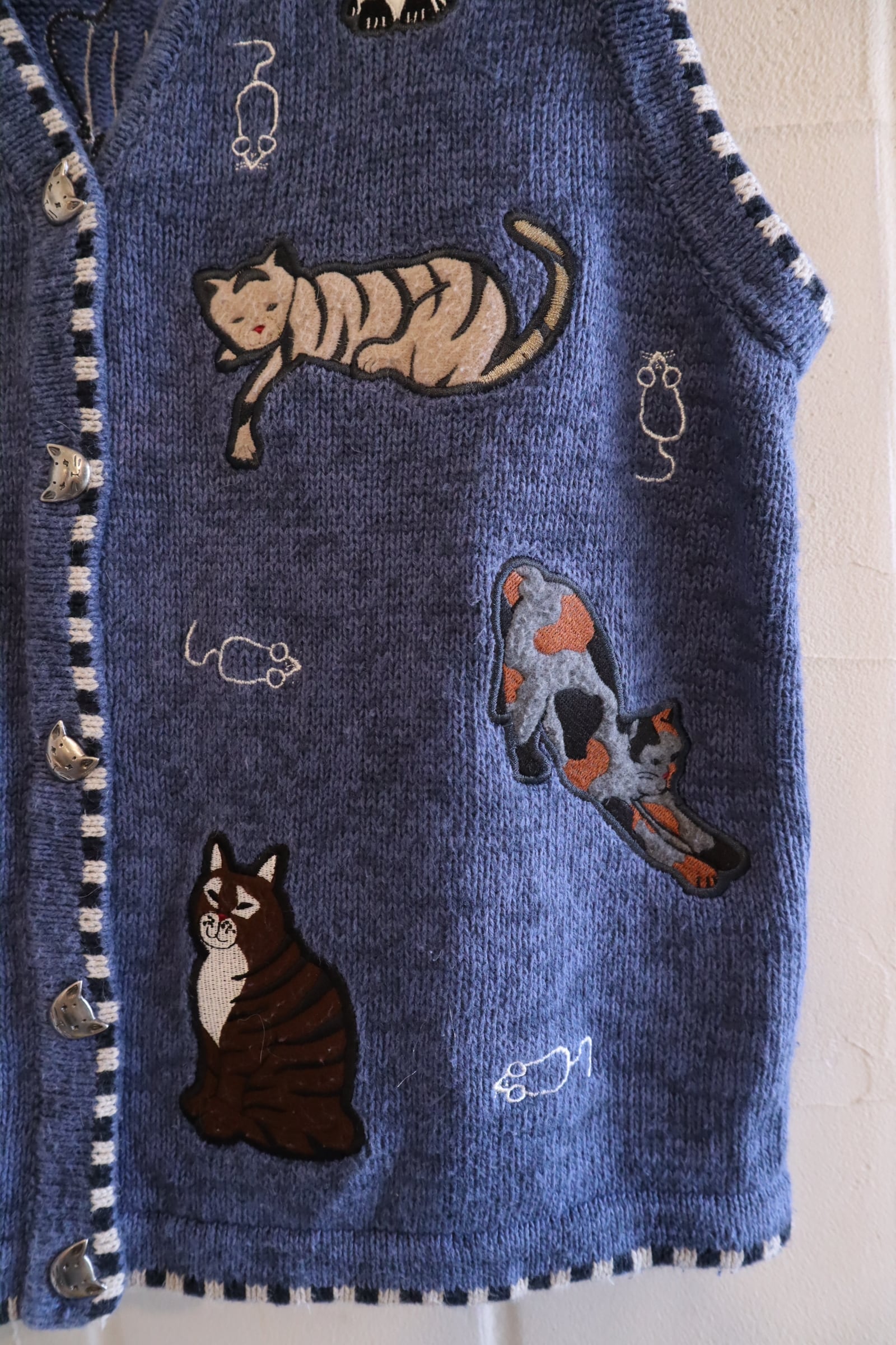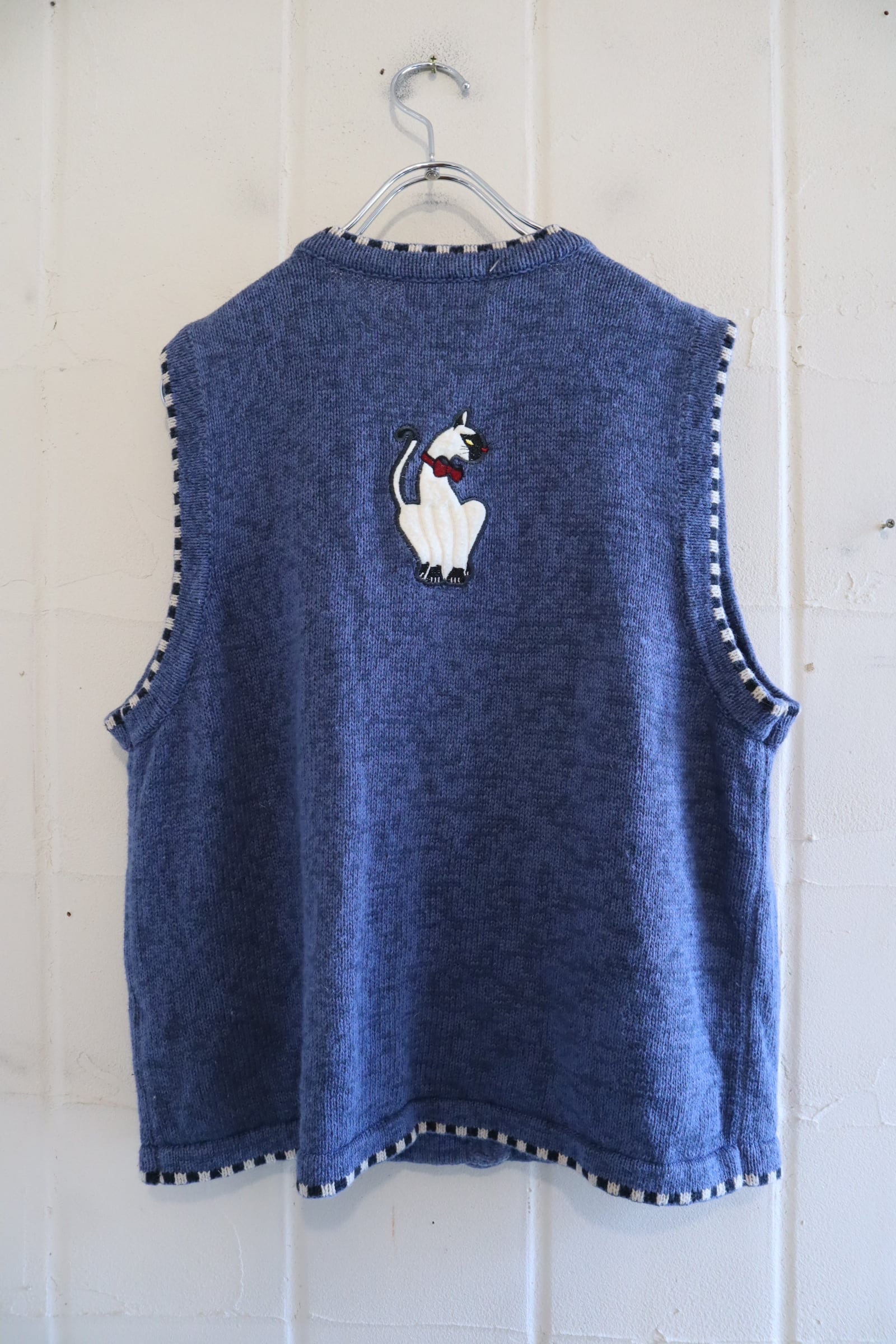 blue×white cat & mouse motif ramie cotton knit vest [l-4985]