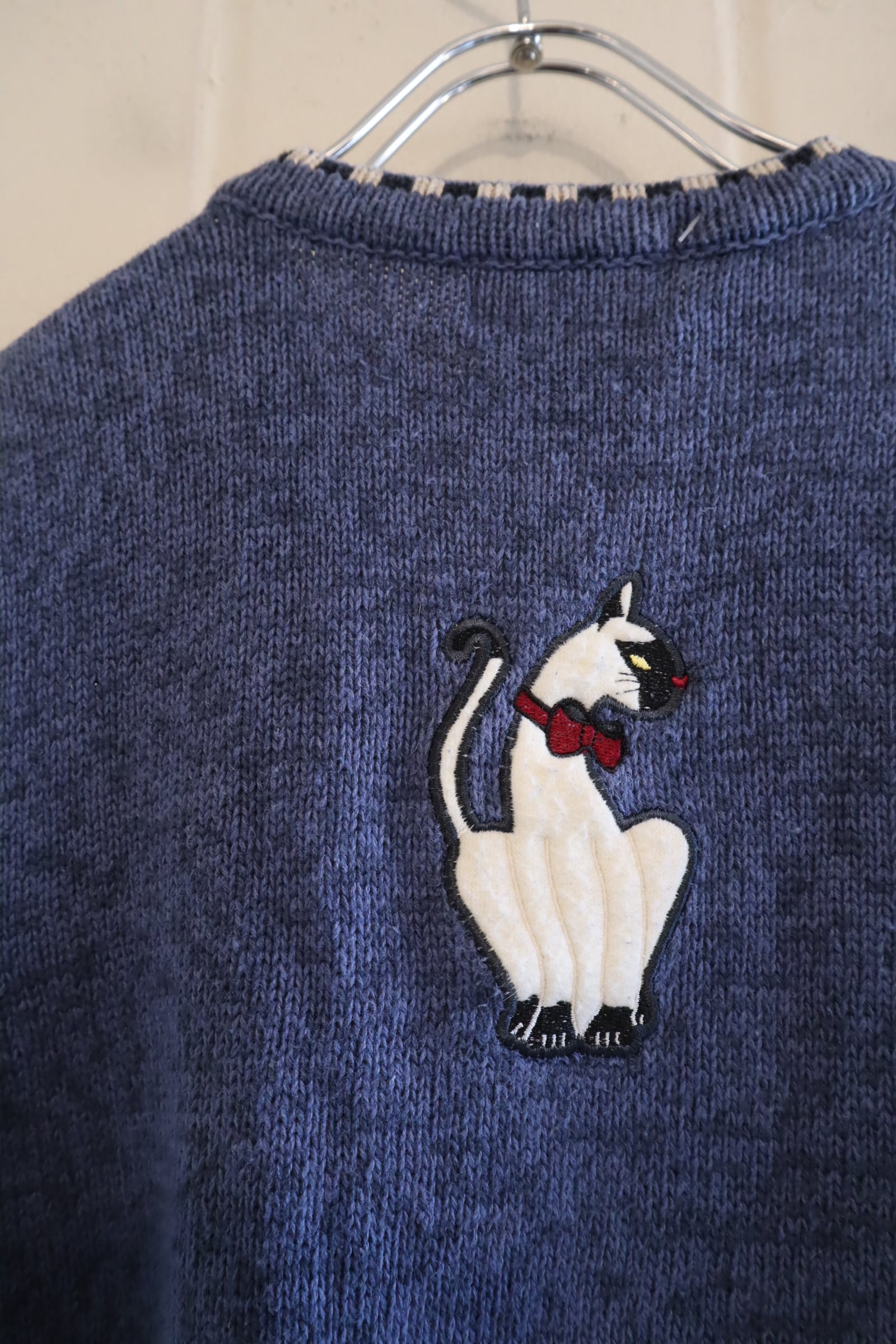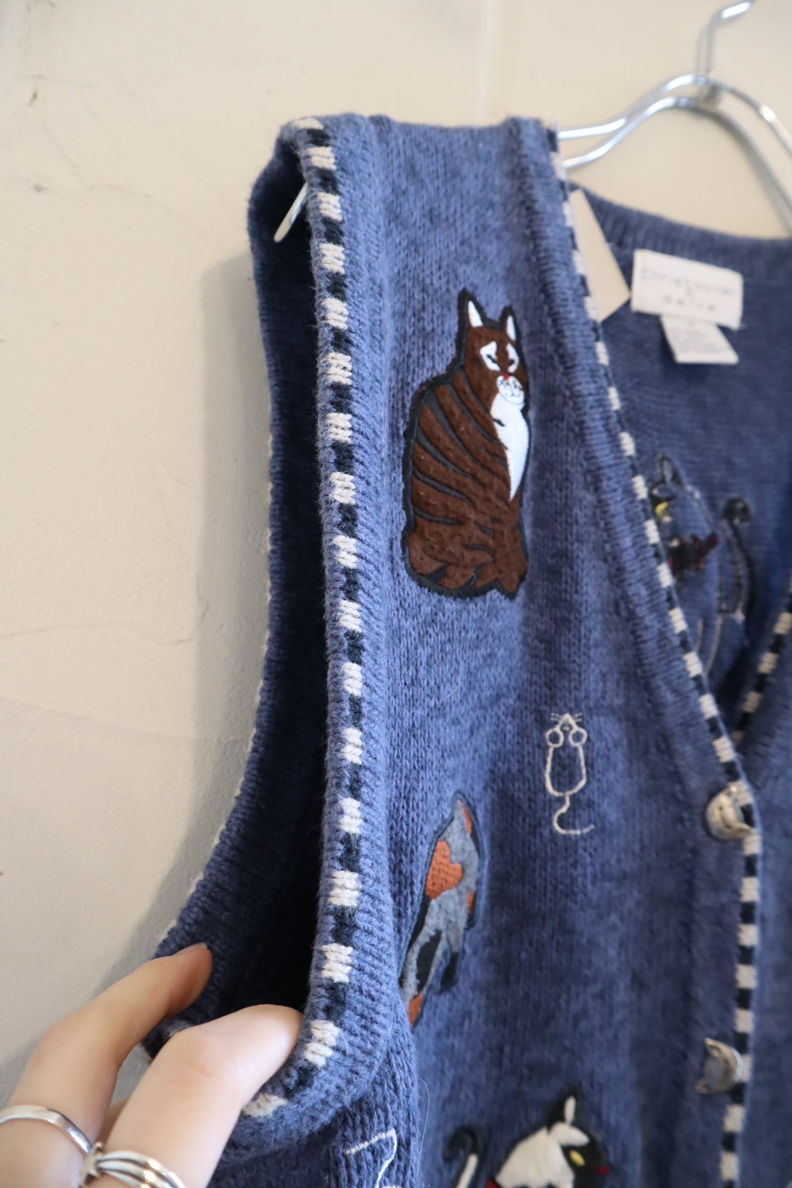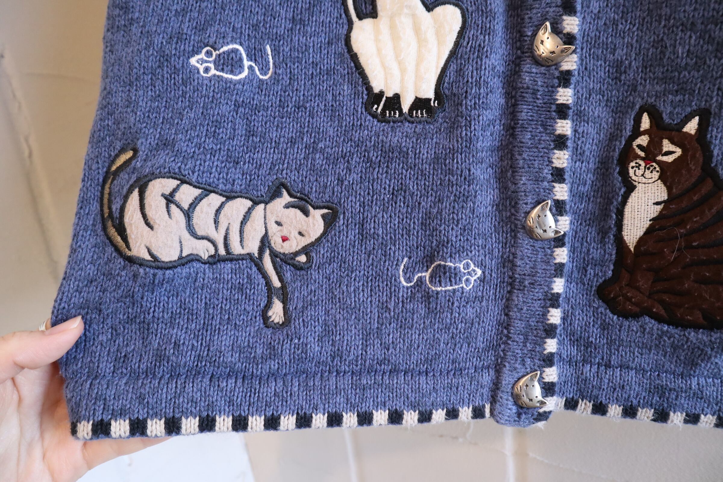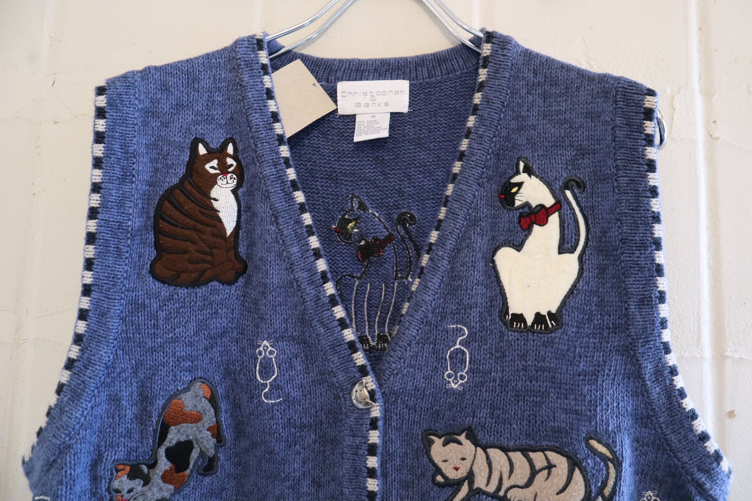 blue×white cat & mouse motif ramie cotton knit vest [l-4985]