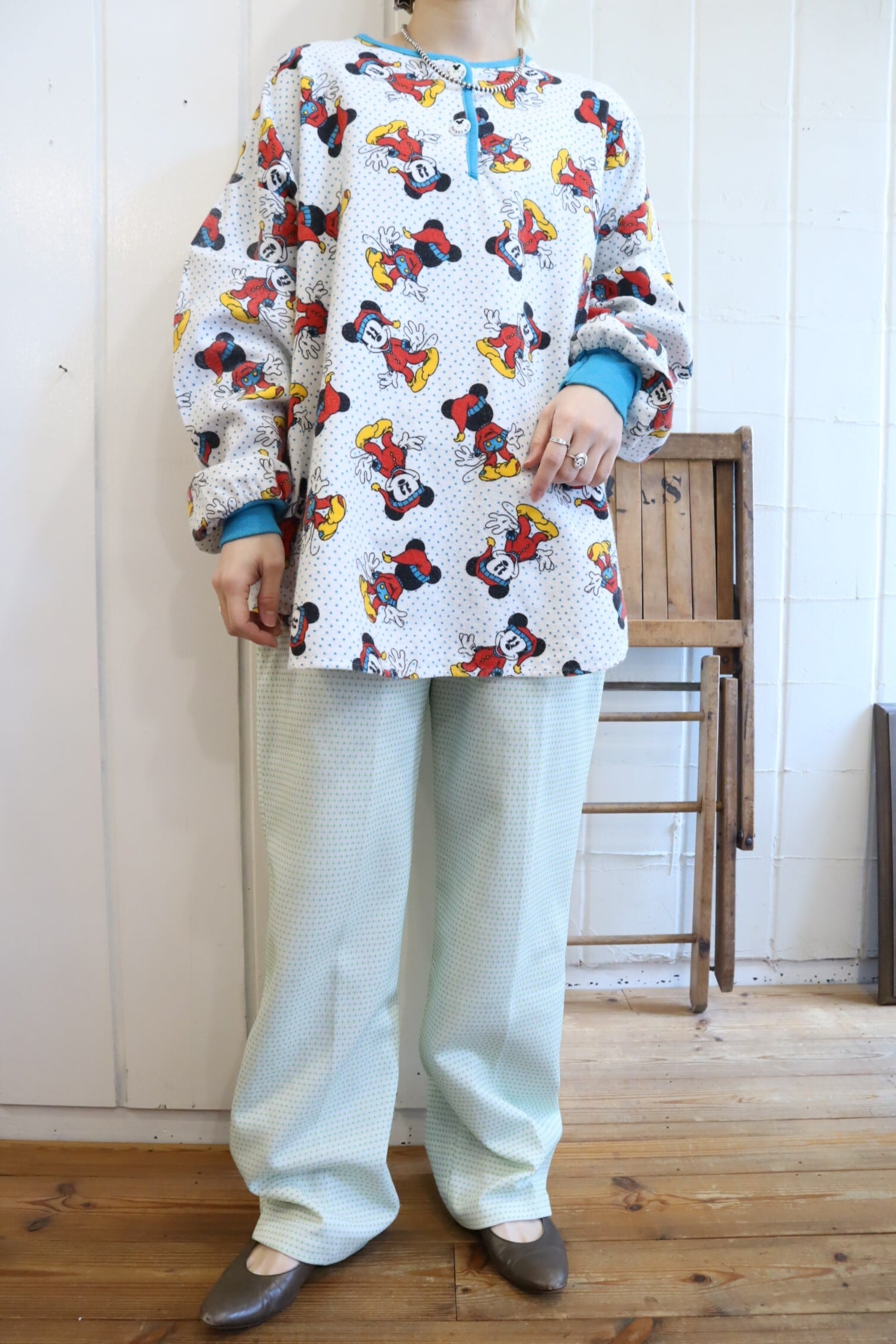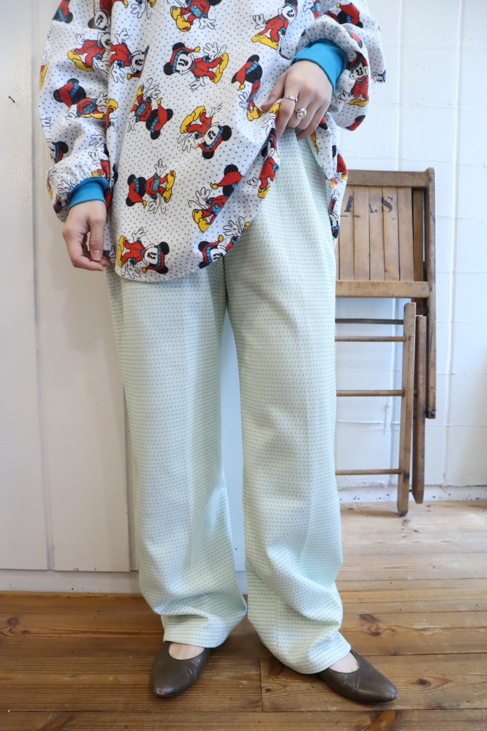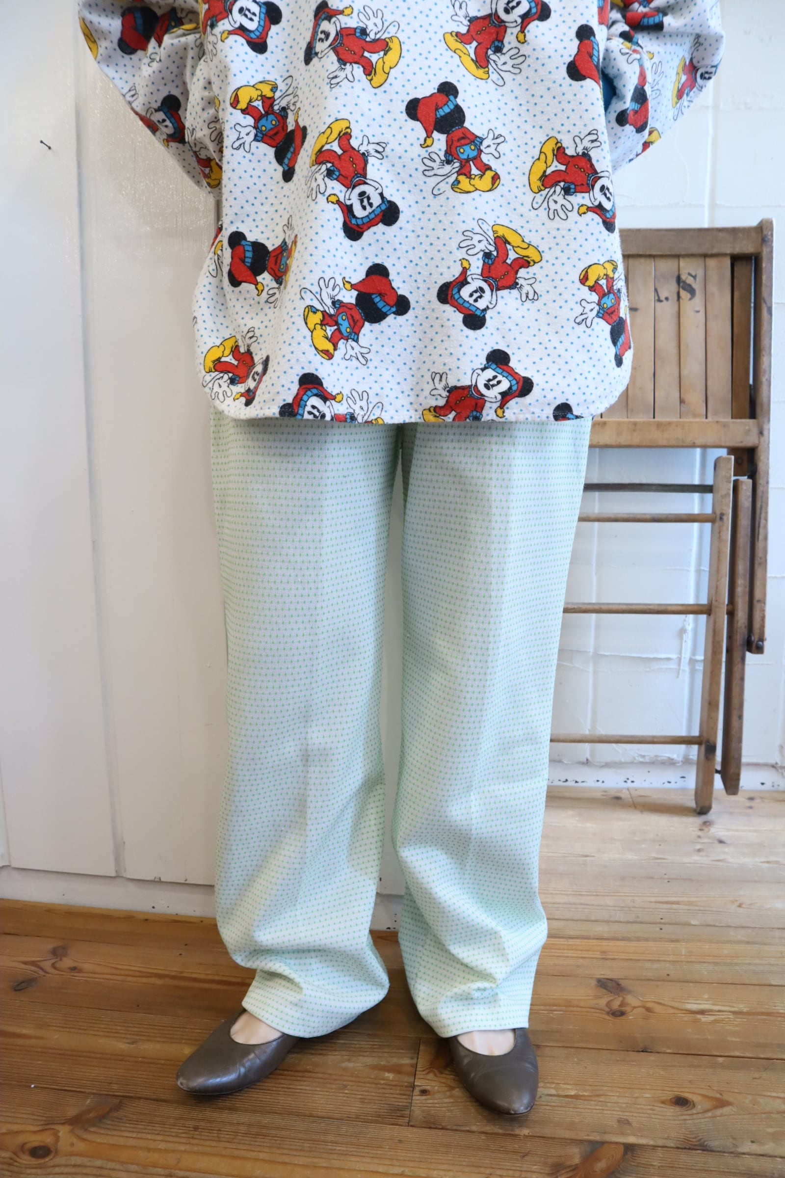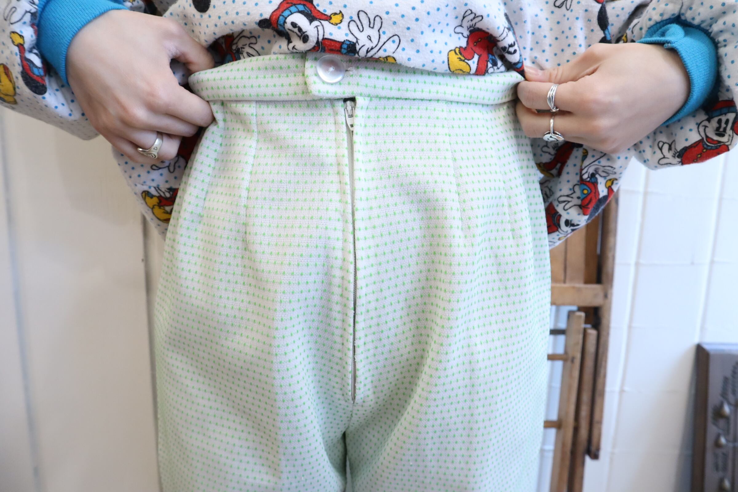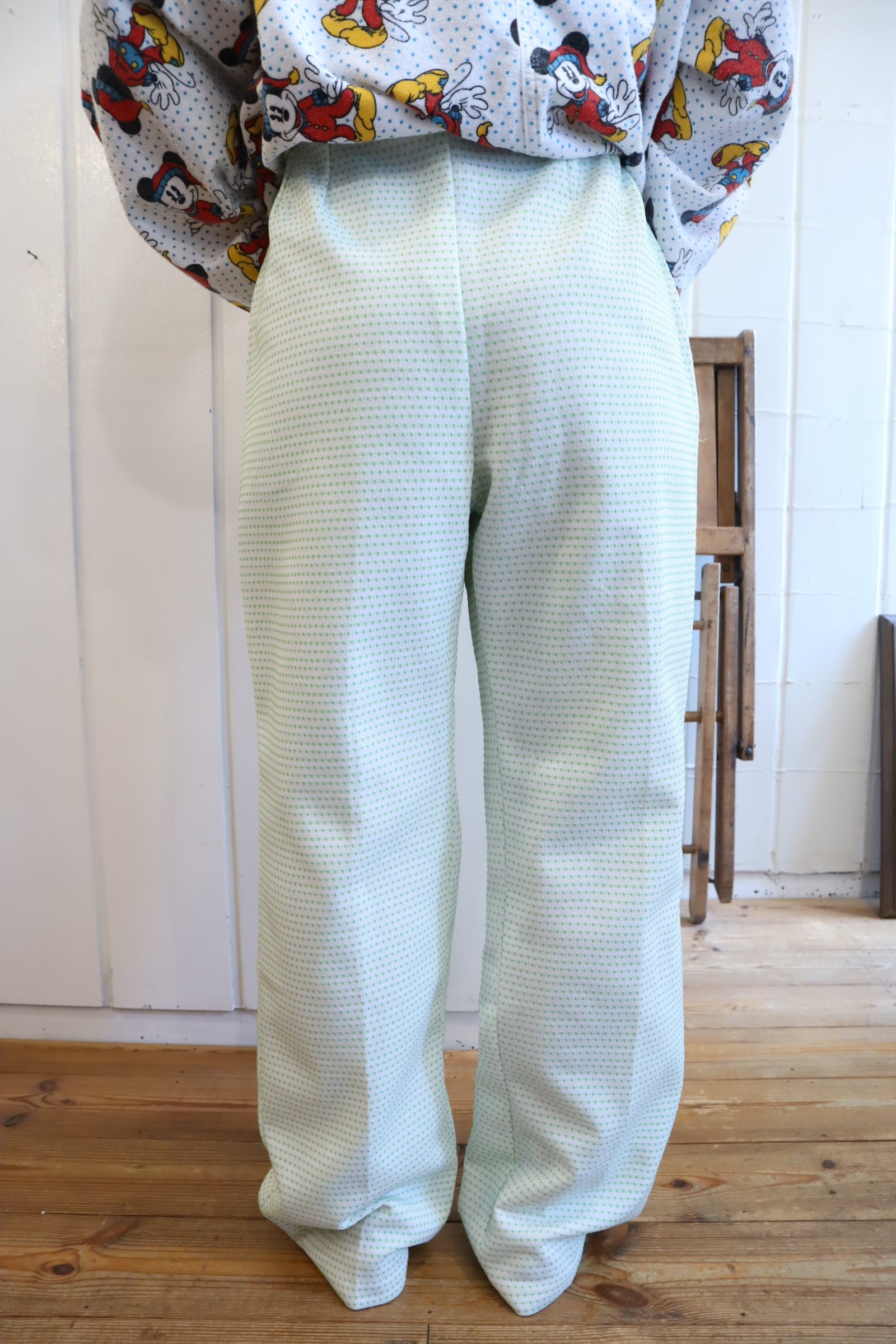 70s-80s white×green dot tapered pants [l-4989]