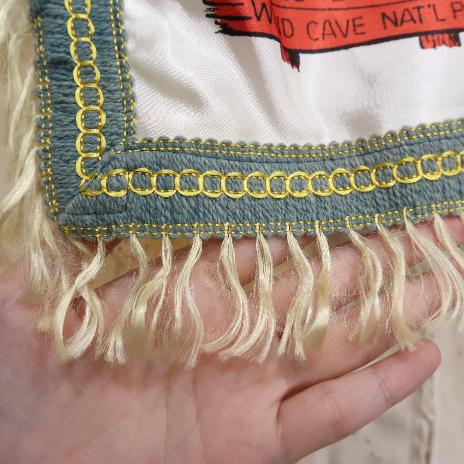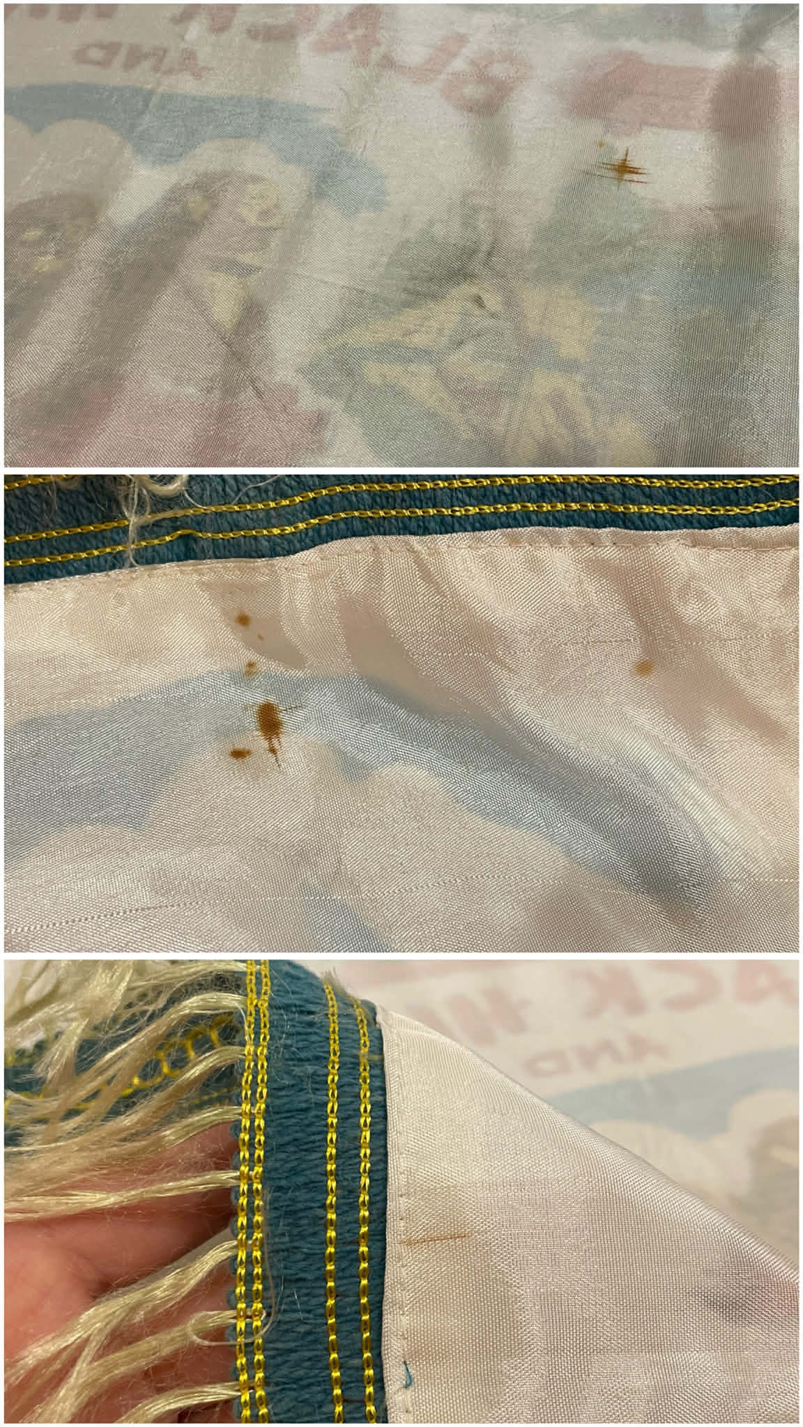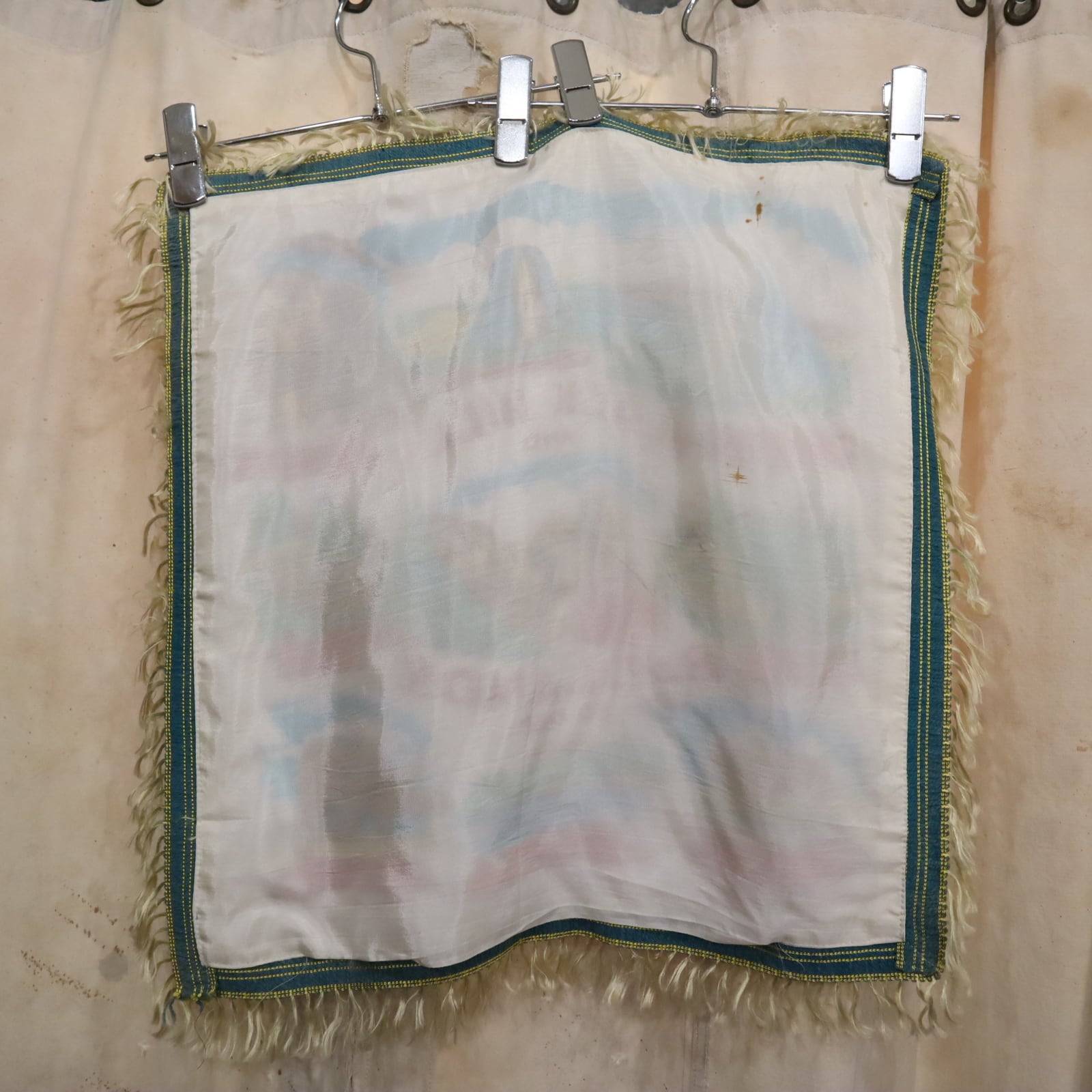 端の青い糸部分に色褪せ、フリンジにいくつか糸の絡み、ボディにツレ・キズ・シミがございいますが、味としてご使用頂けるかと思います。