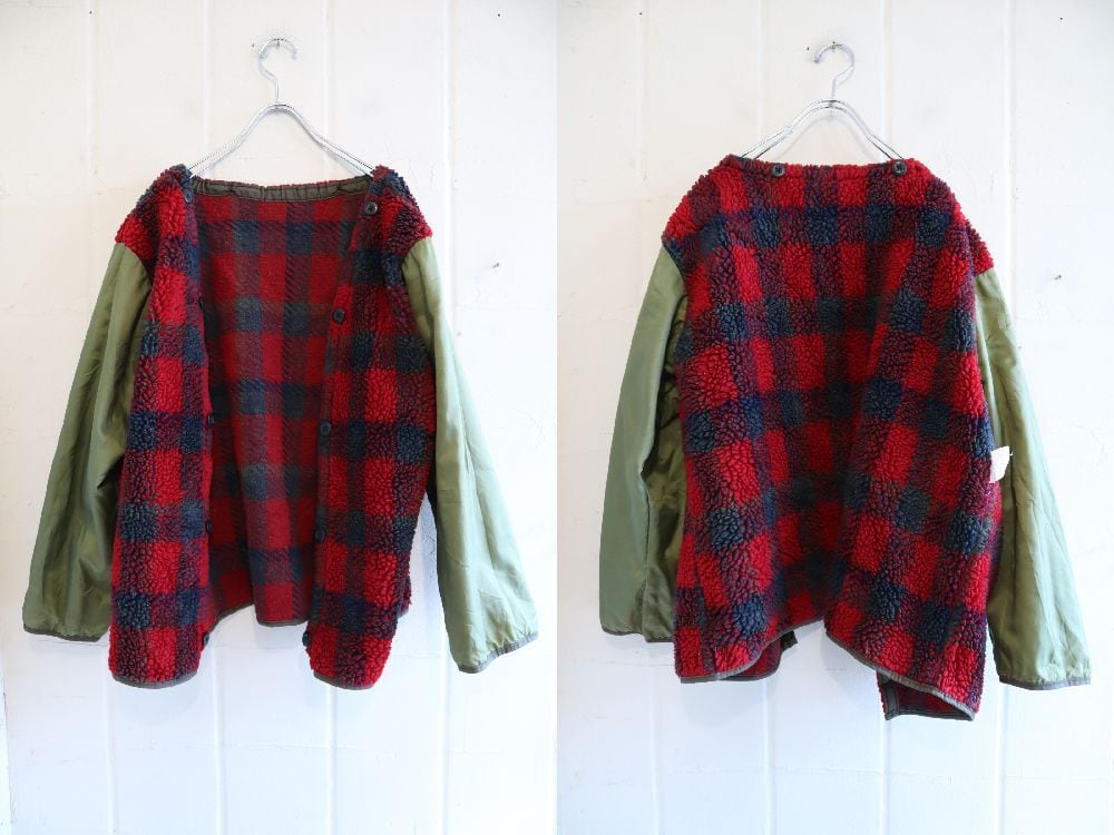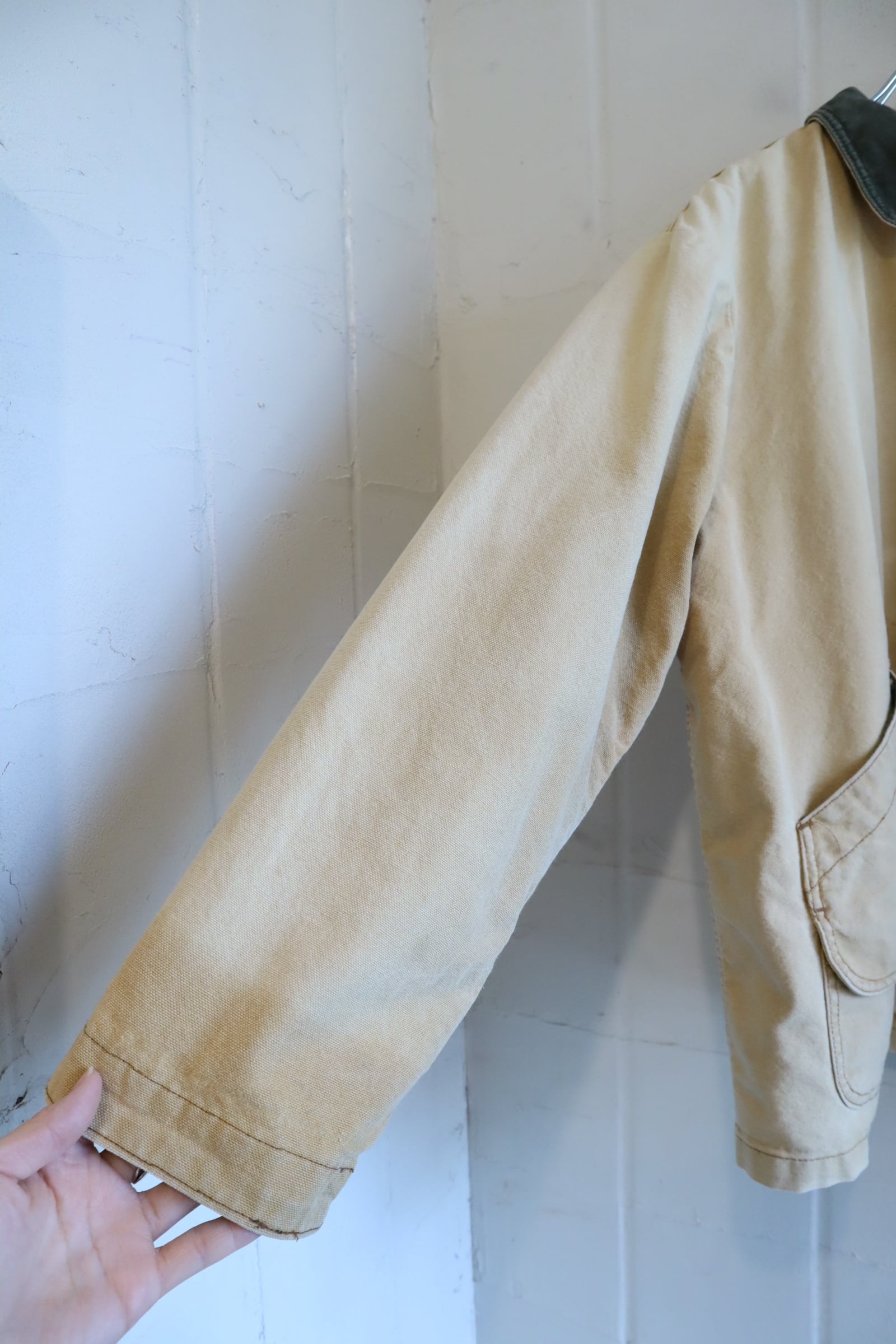 また襟に素材特有の色褪せ、ボディ全体的に色焼けによる退色、いくつか薄汚れや色移りが見受けられますが、いずれも古着の味として着て頂けるかと思われます。
