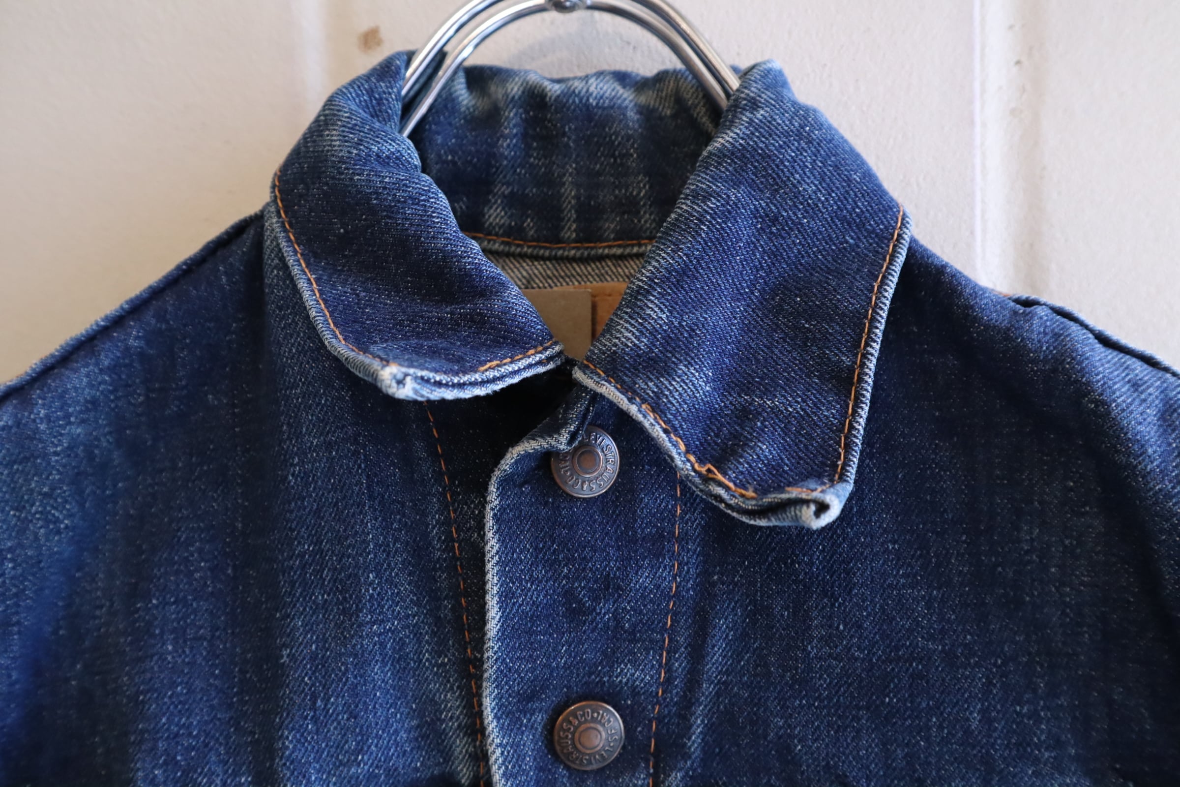 襟にクセ、ボディにいくつか色褪せ、ステッチのホツレがございます。