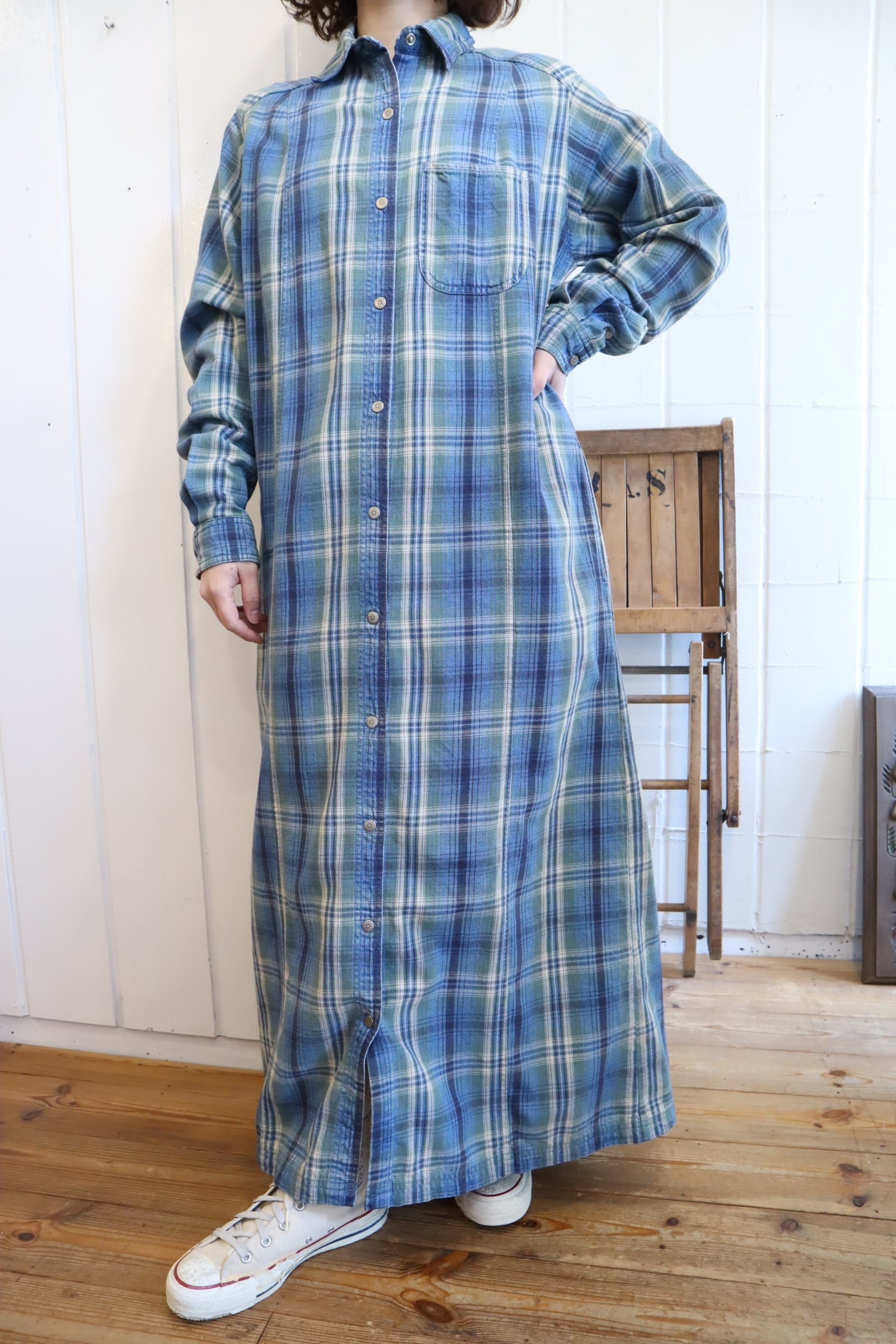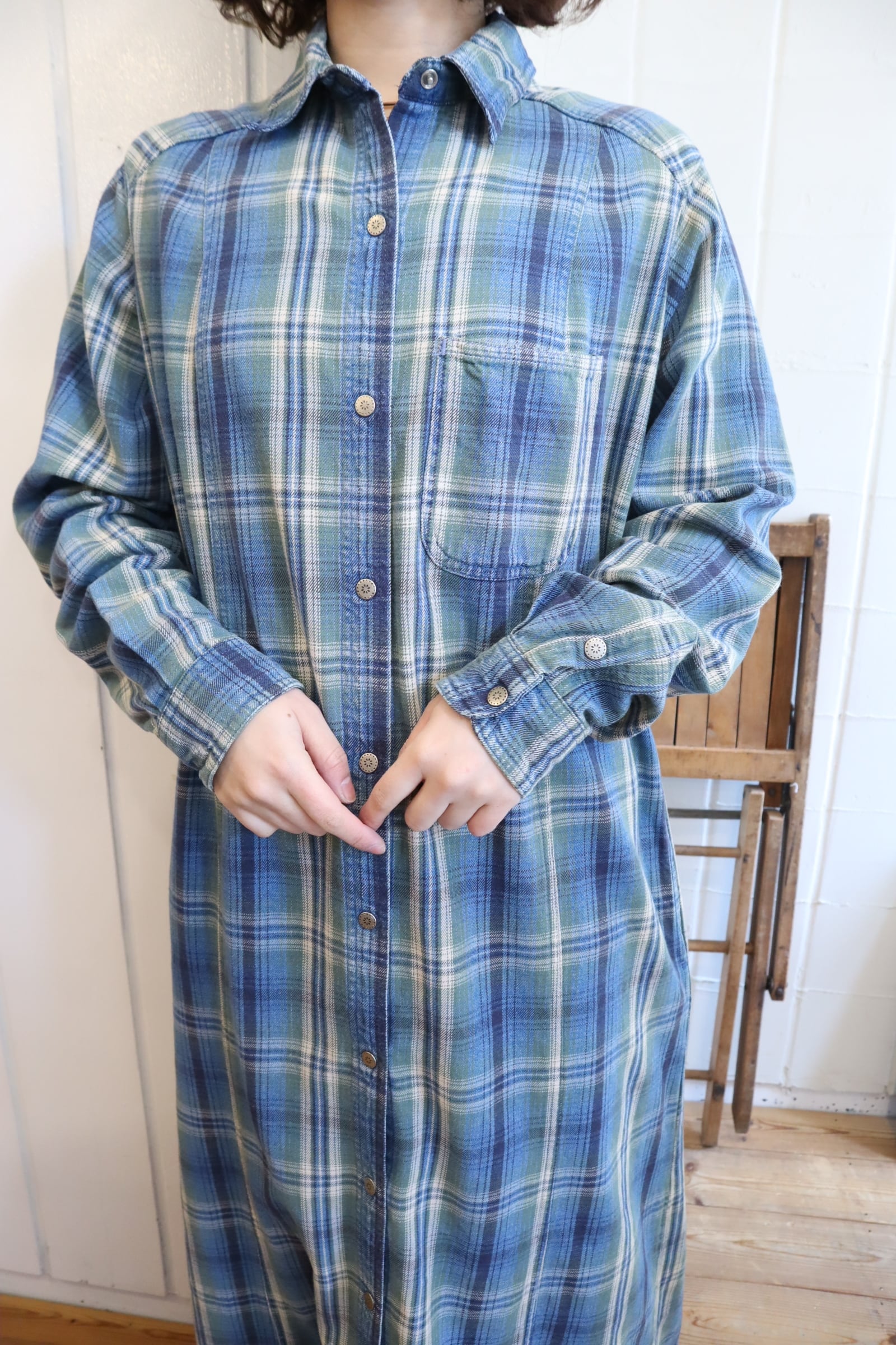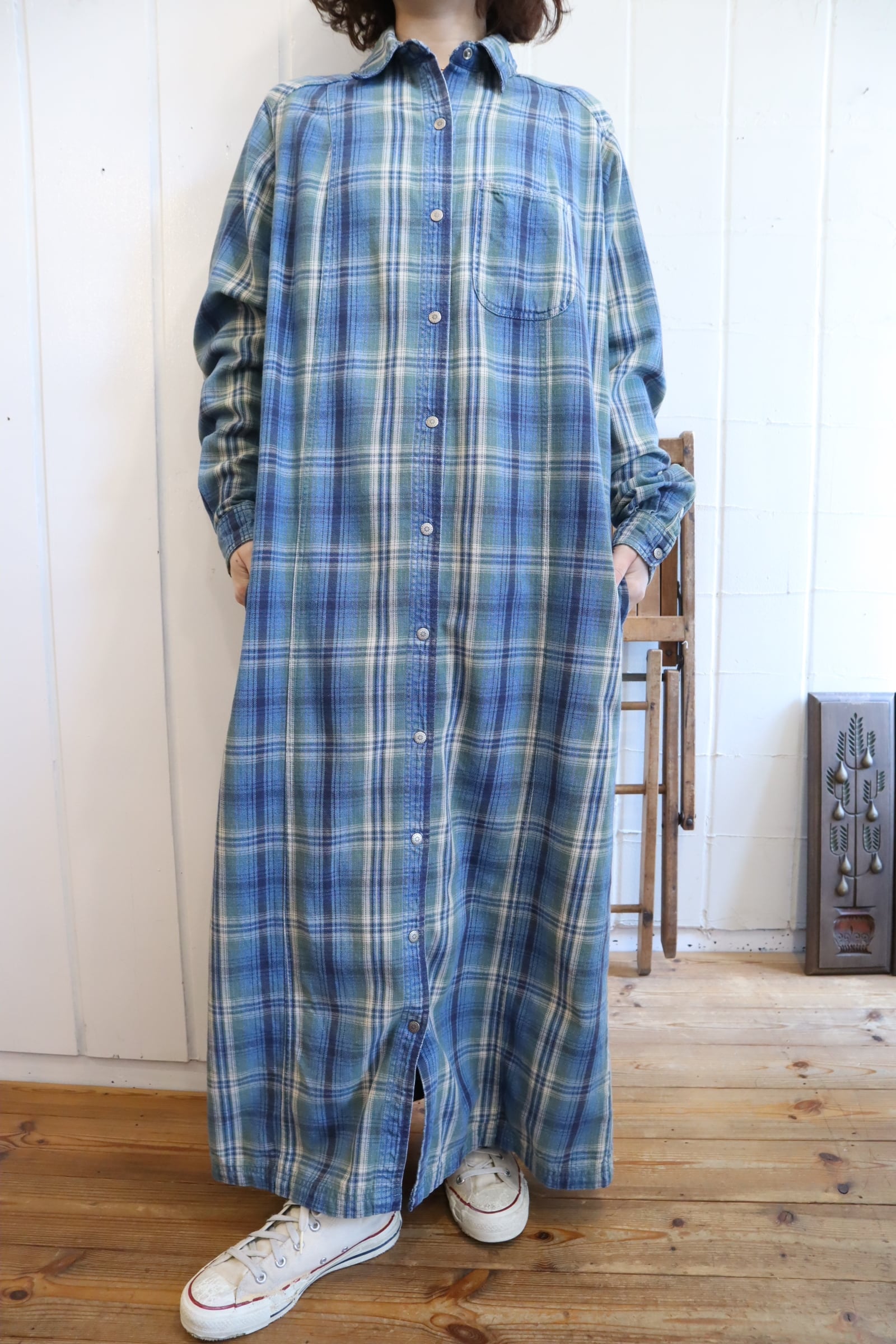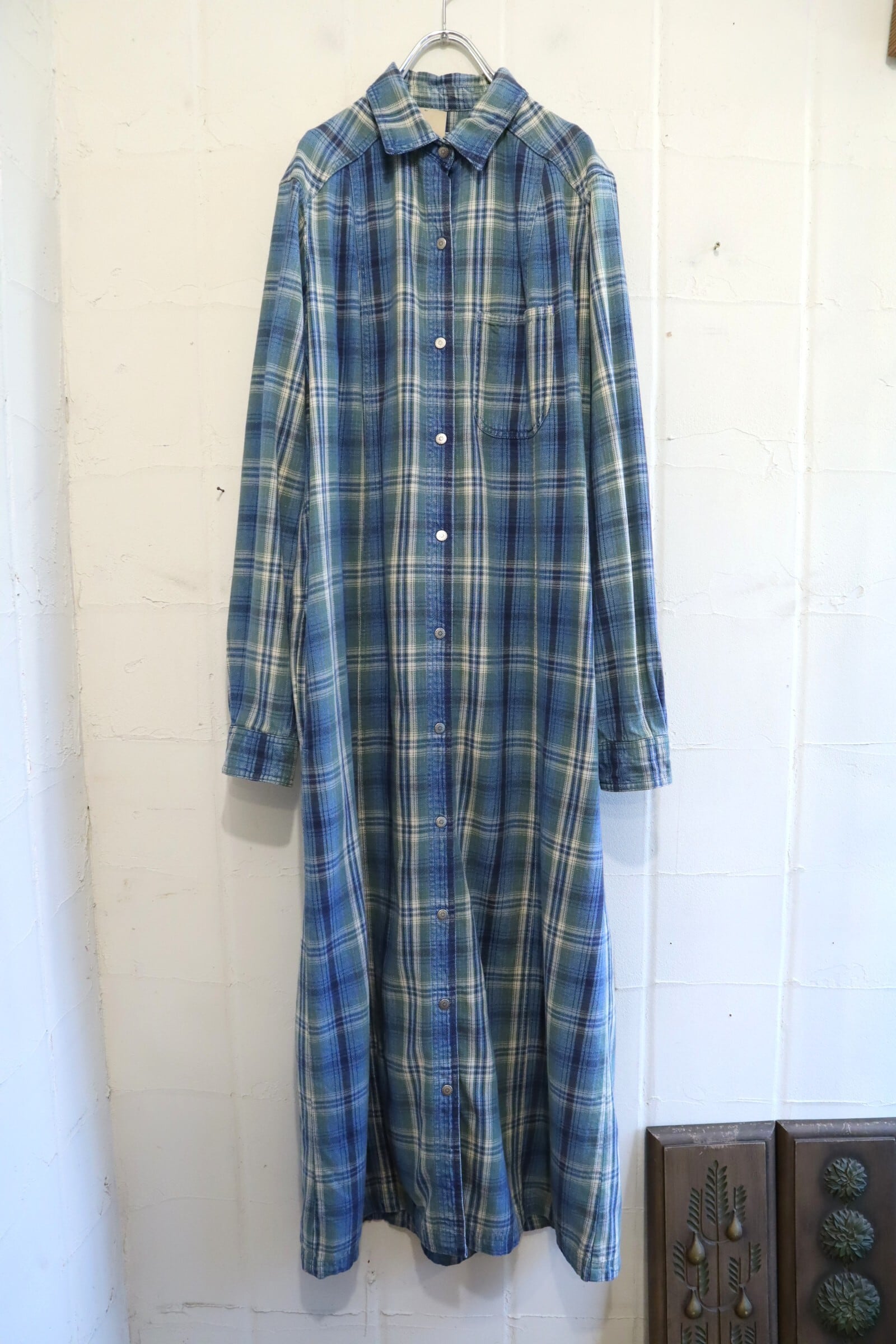 L.L.Bean blue×green plaid shirt dress [l-5040]