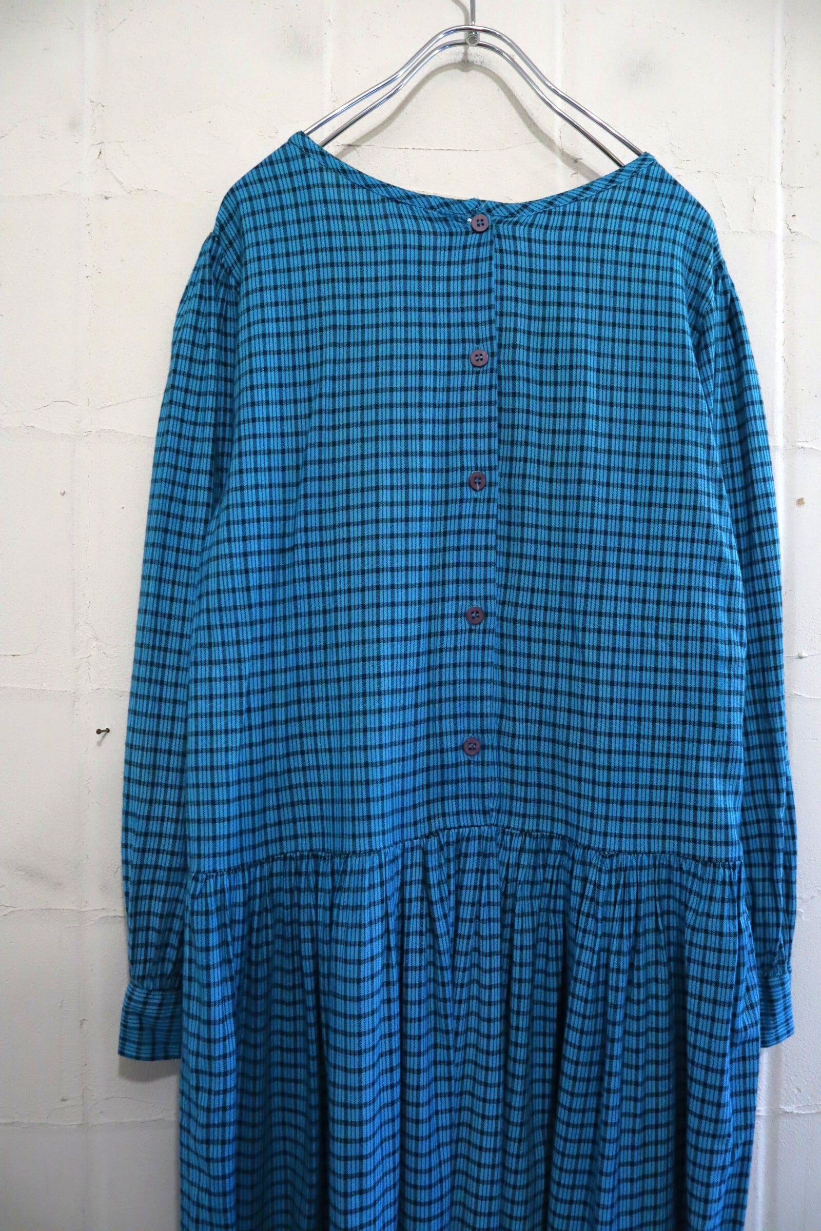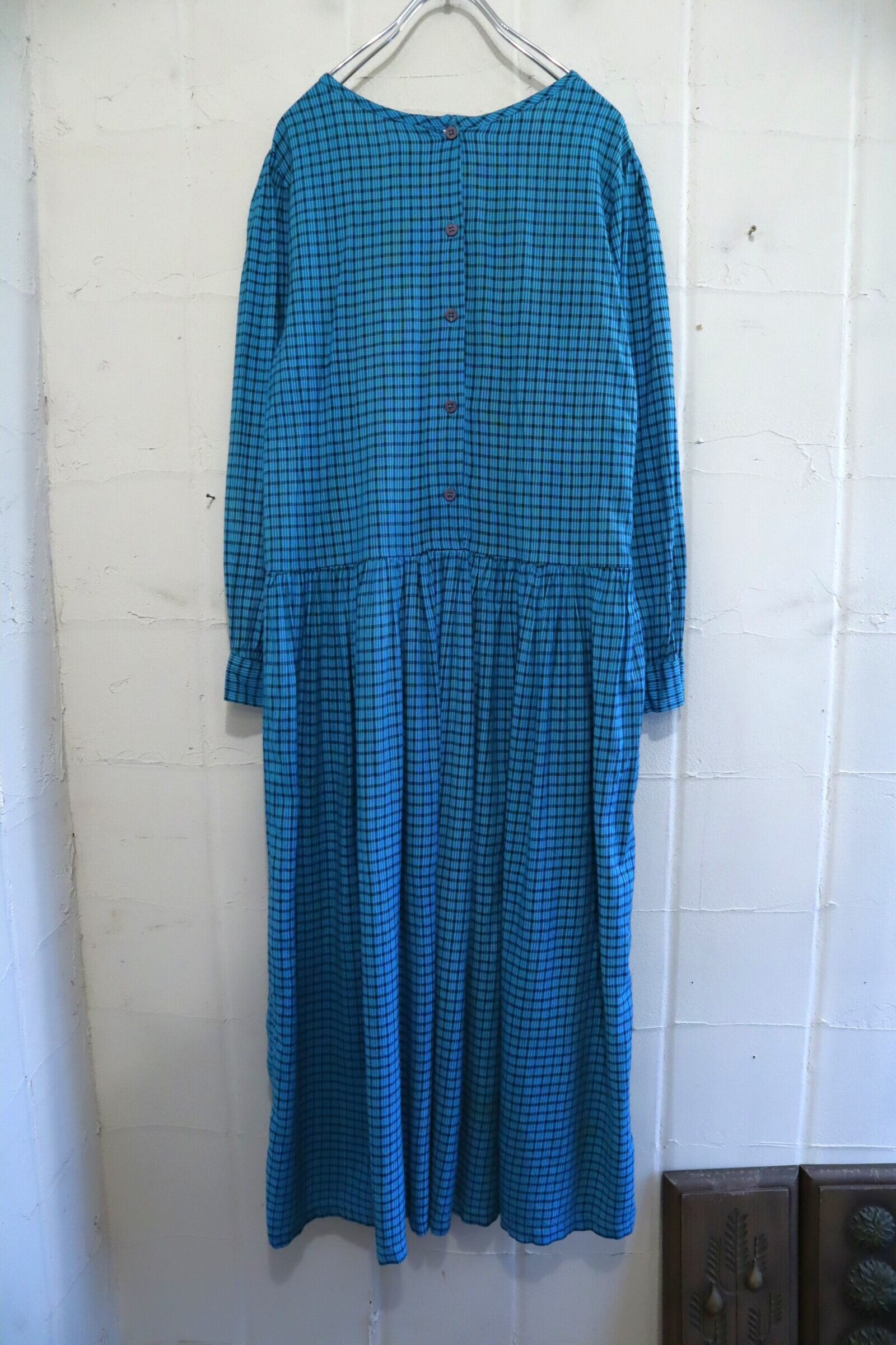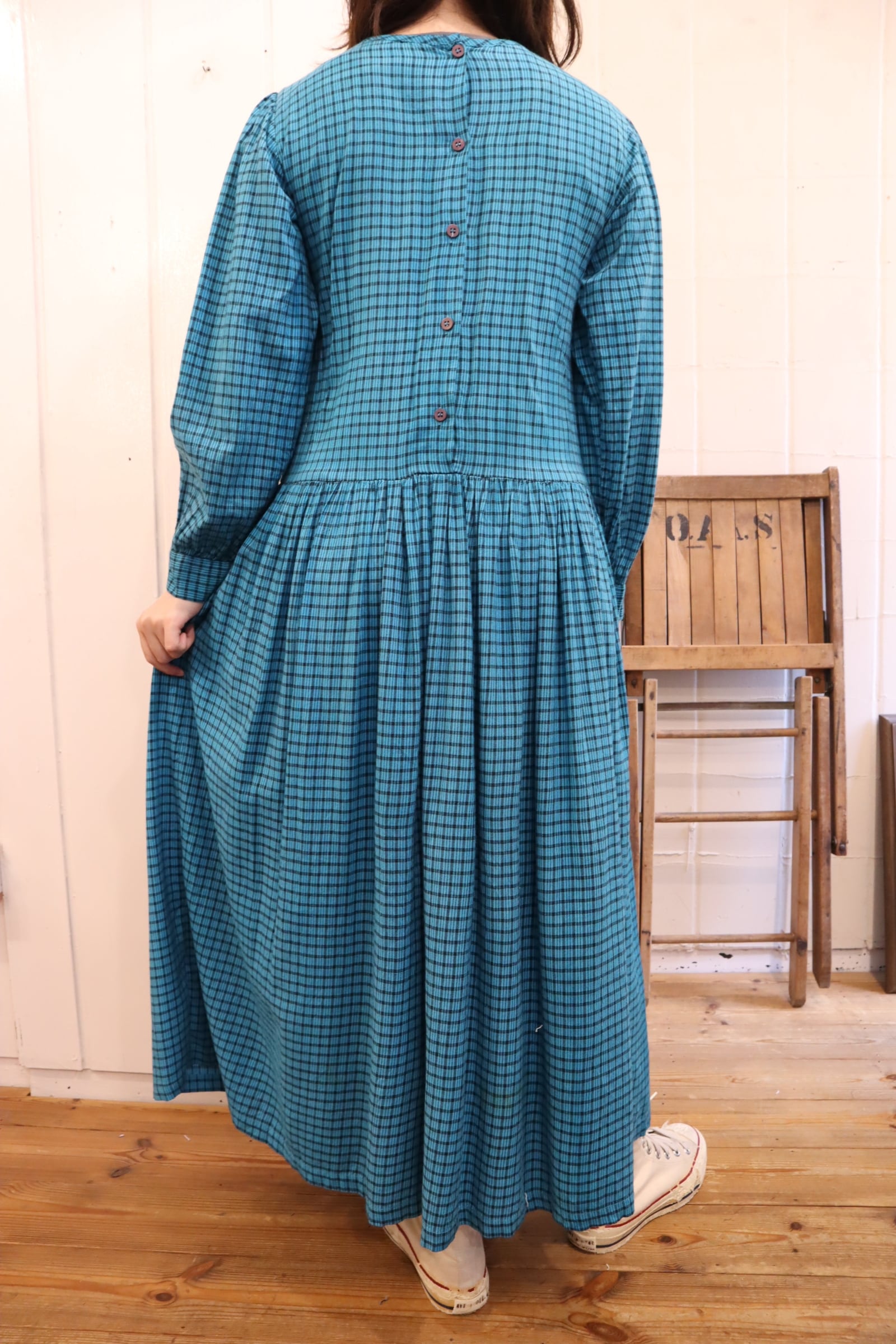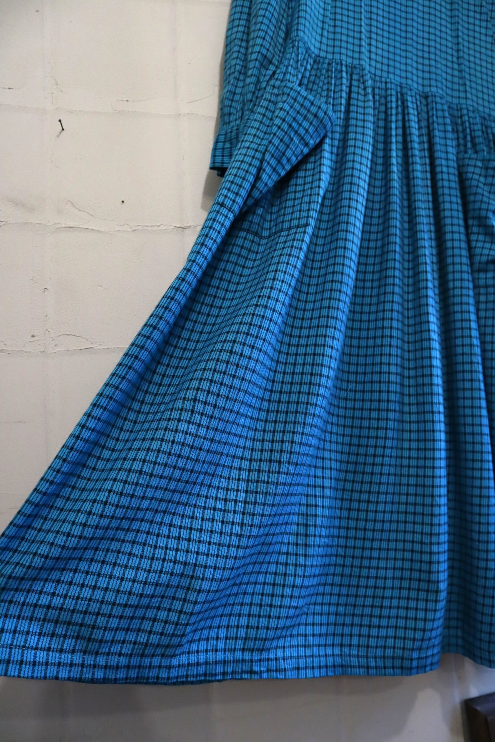 ‐80s blue×black plaid India cotton rayon dress [l-5041]
