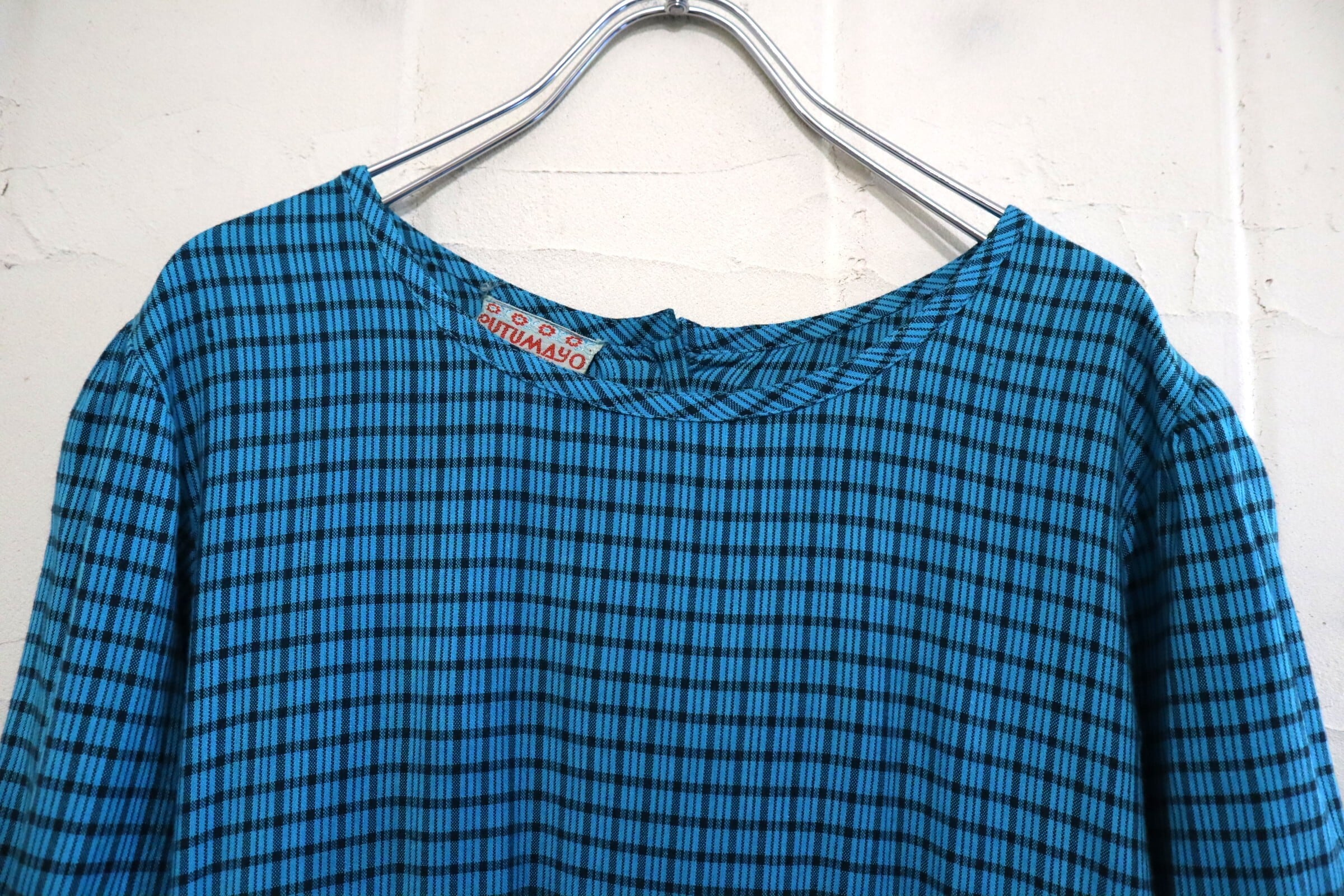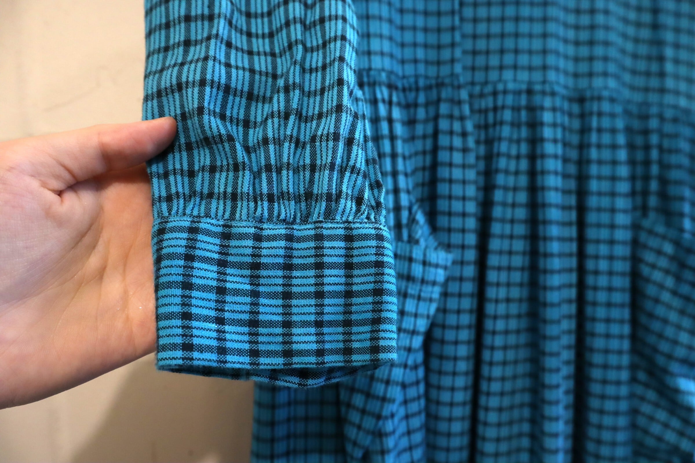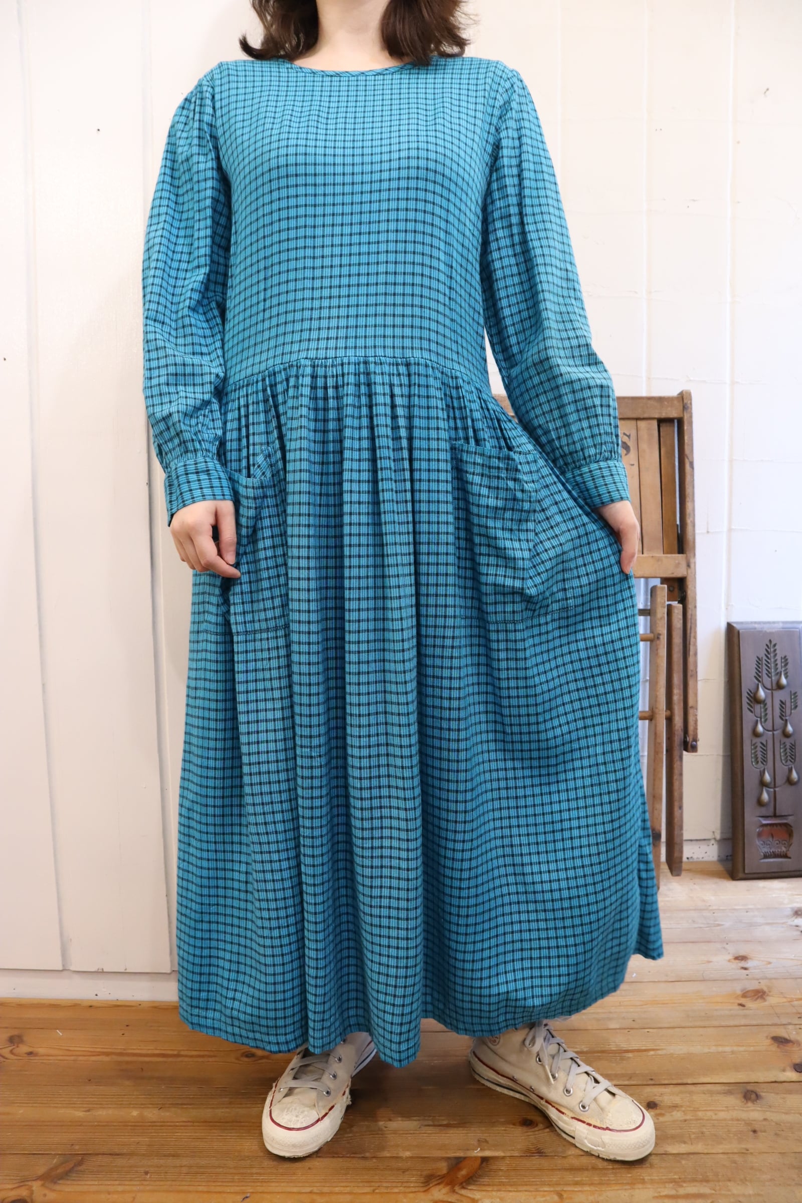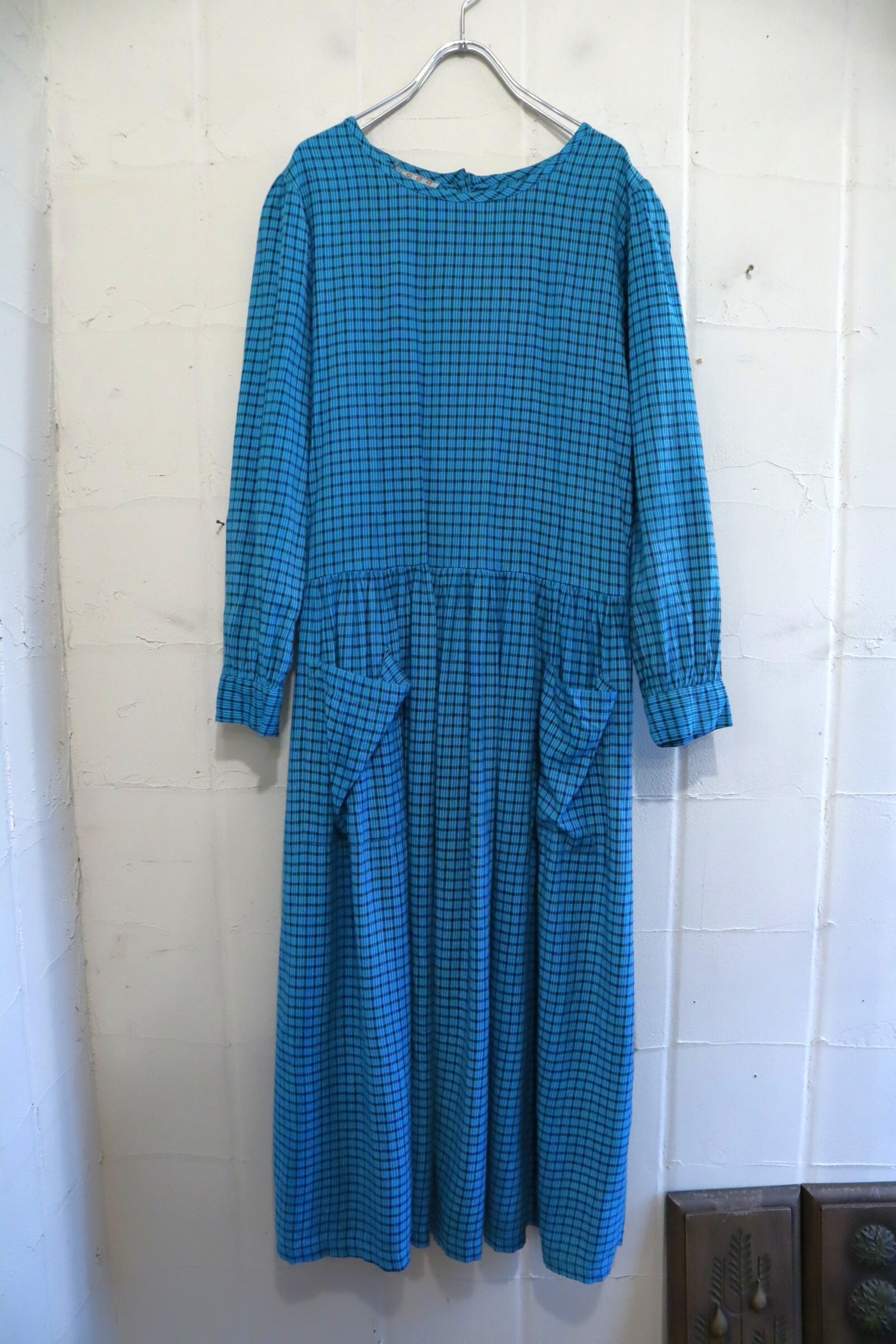 ‐80s blue×black plaid India cotton rayon dress [l-5041]