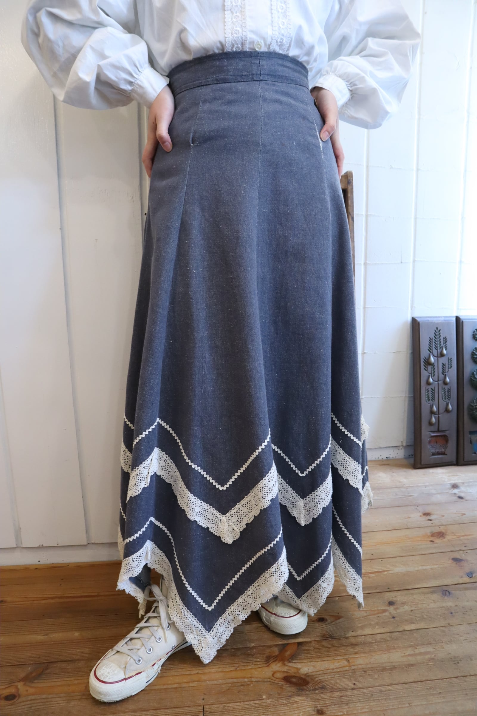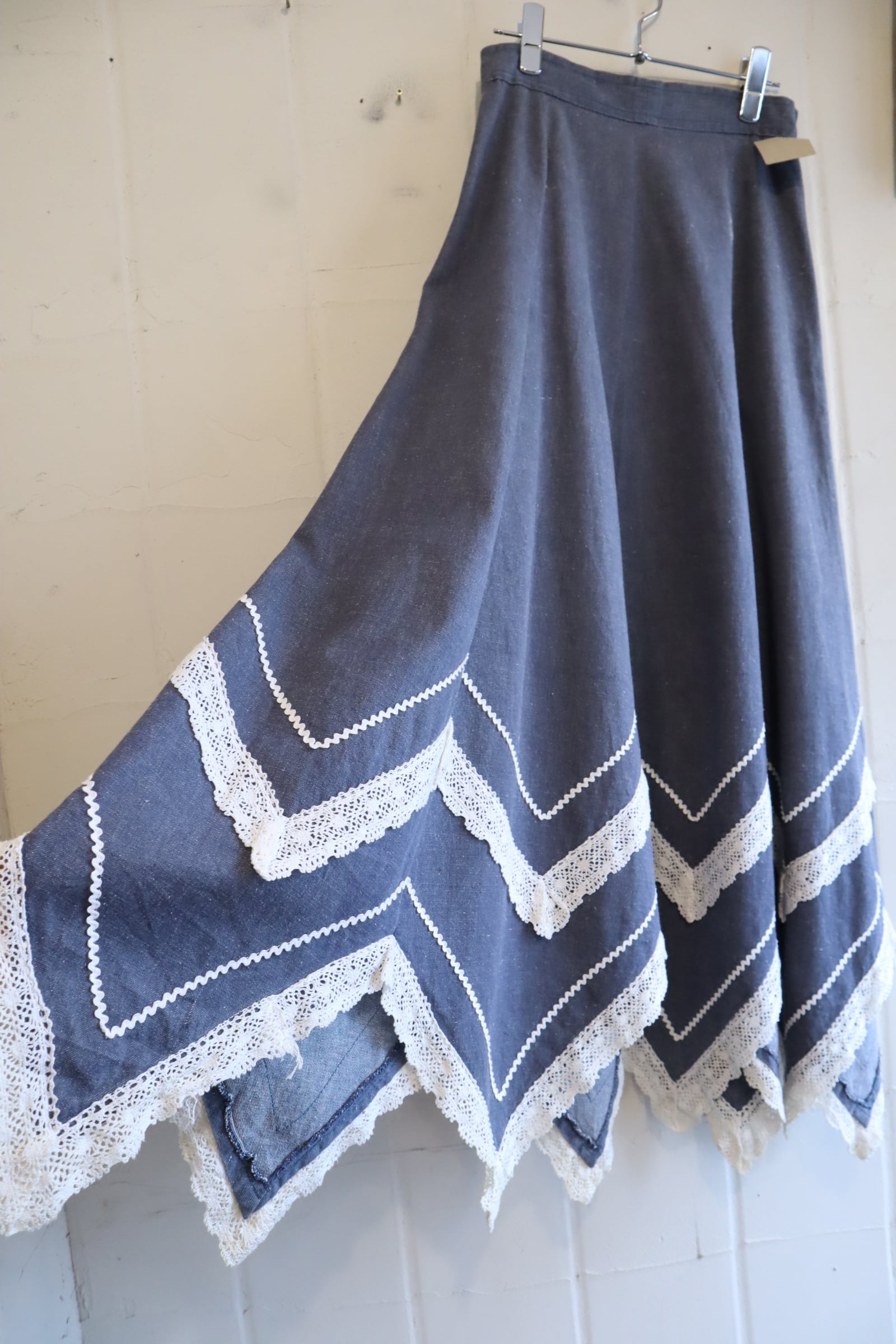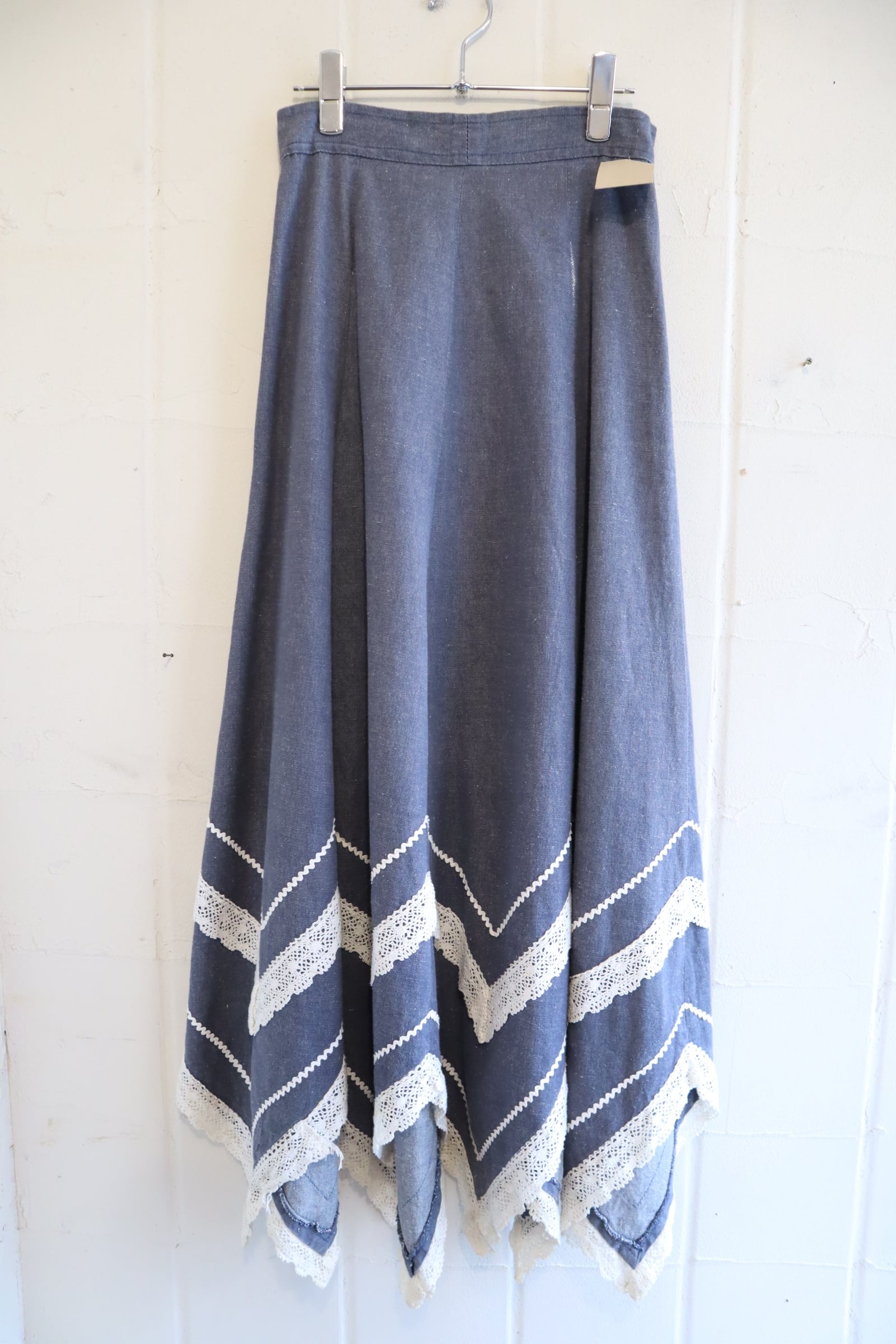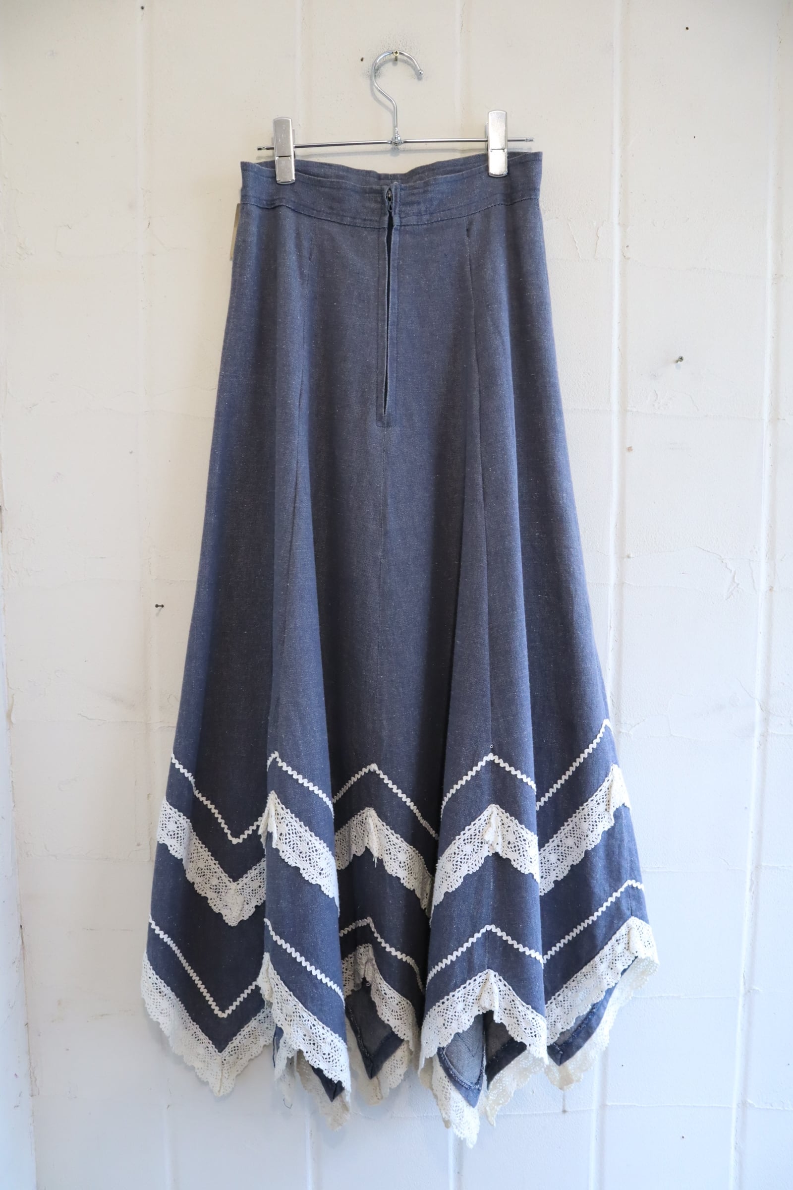 70s blue×white gizagiza lace design denim skirt [l-5046]