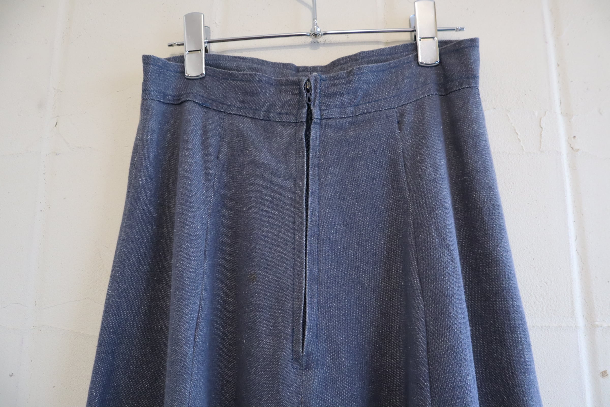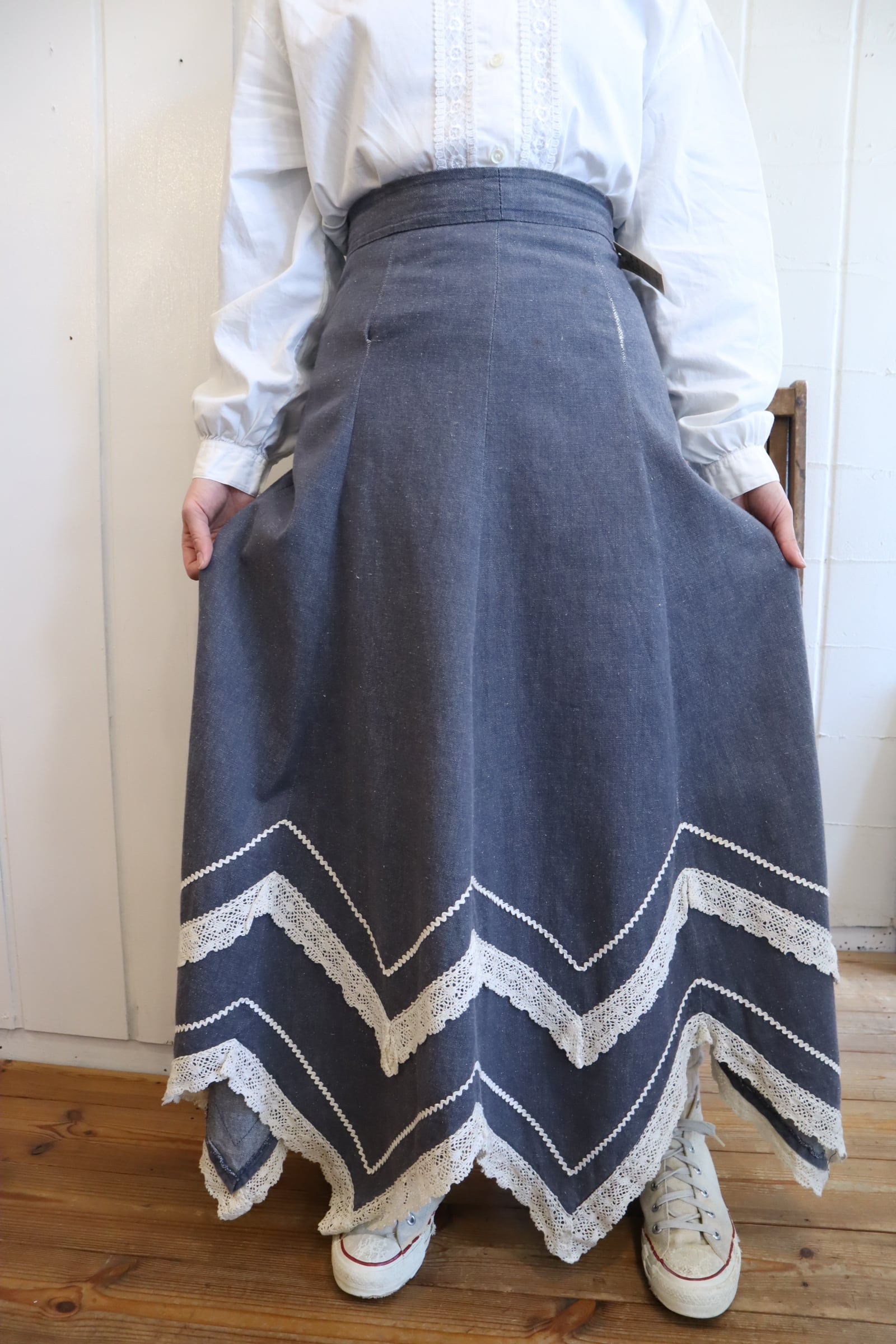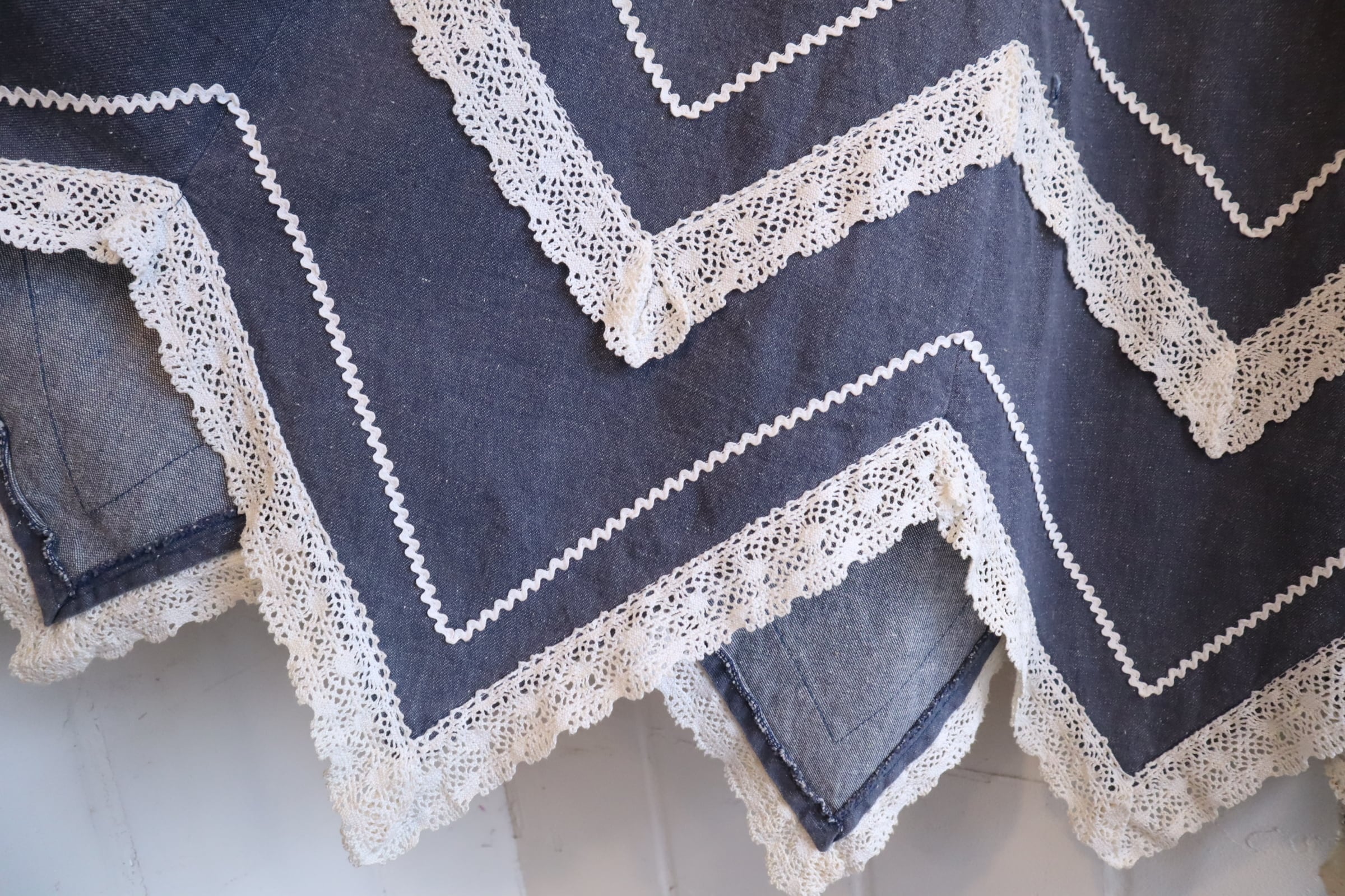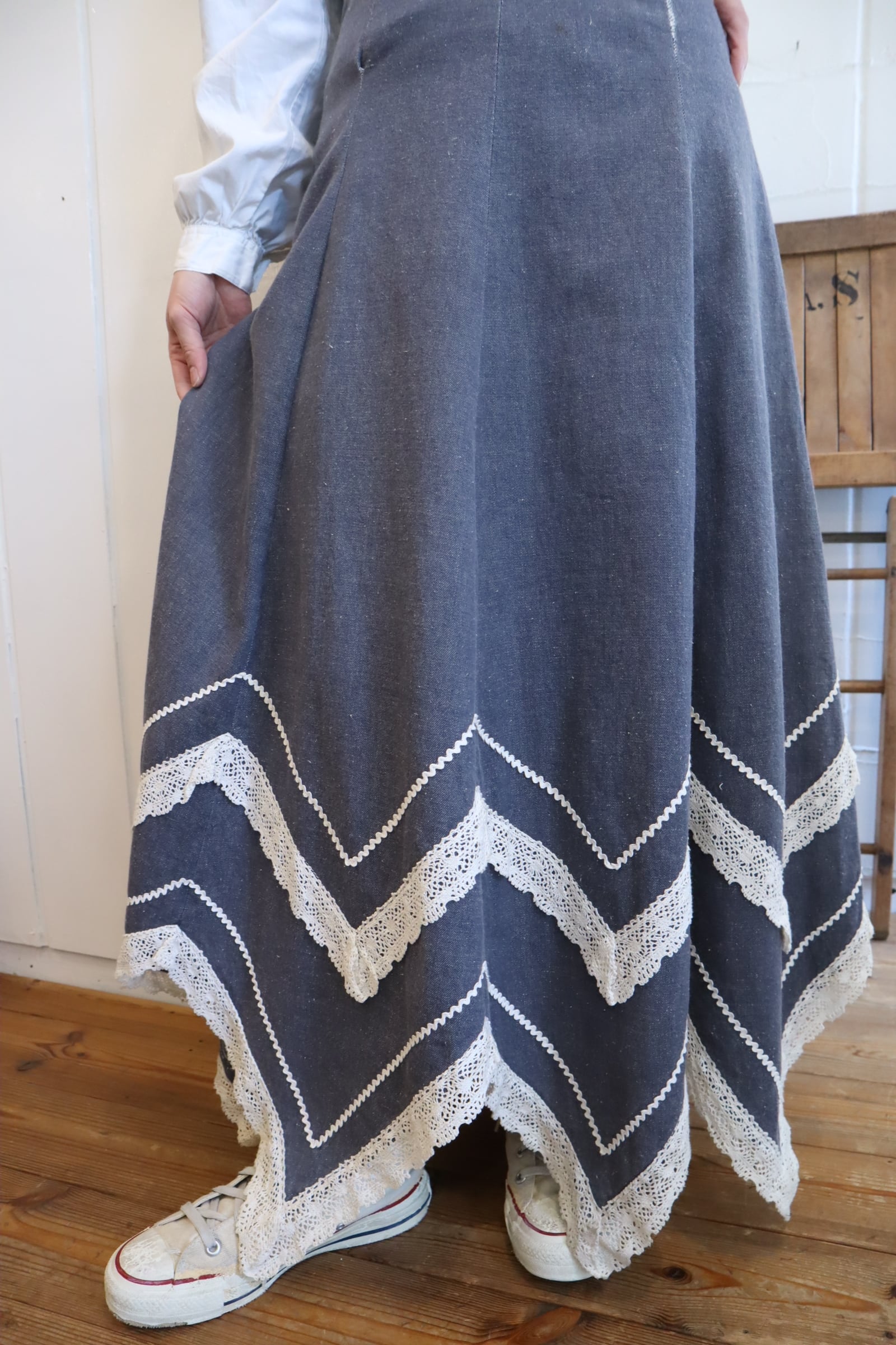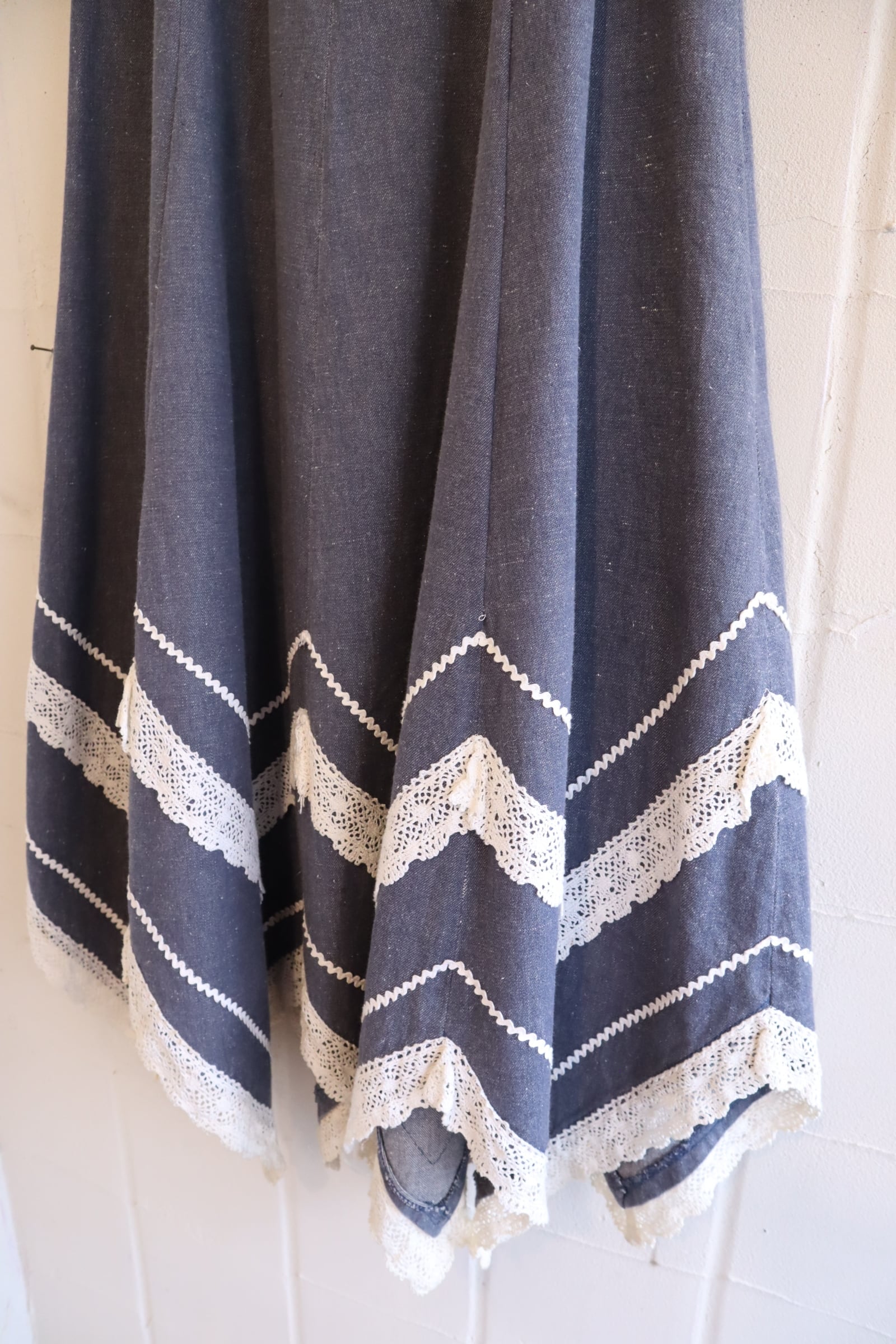 70s blue×white gizagiza lace design denim skirt [l-5046]