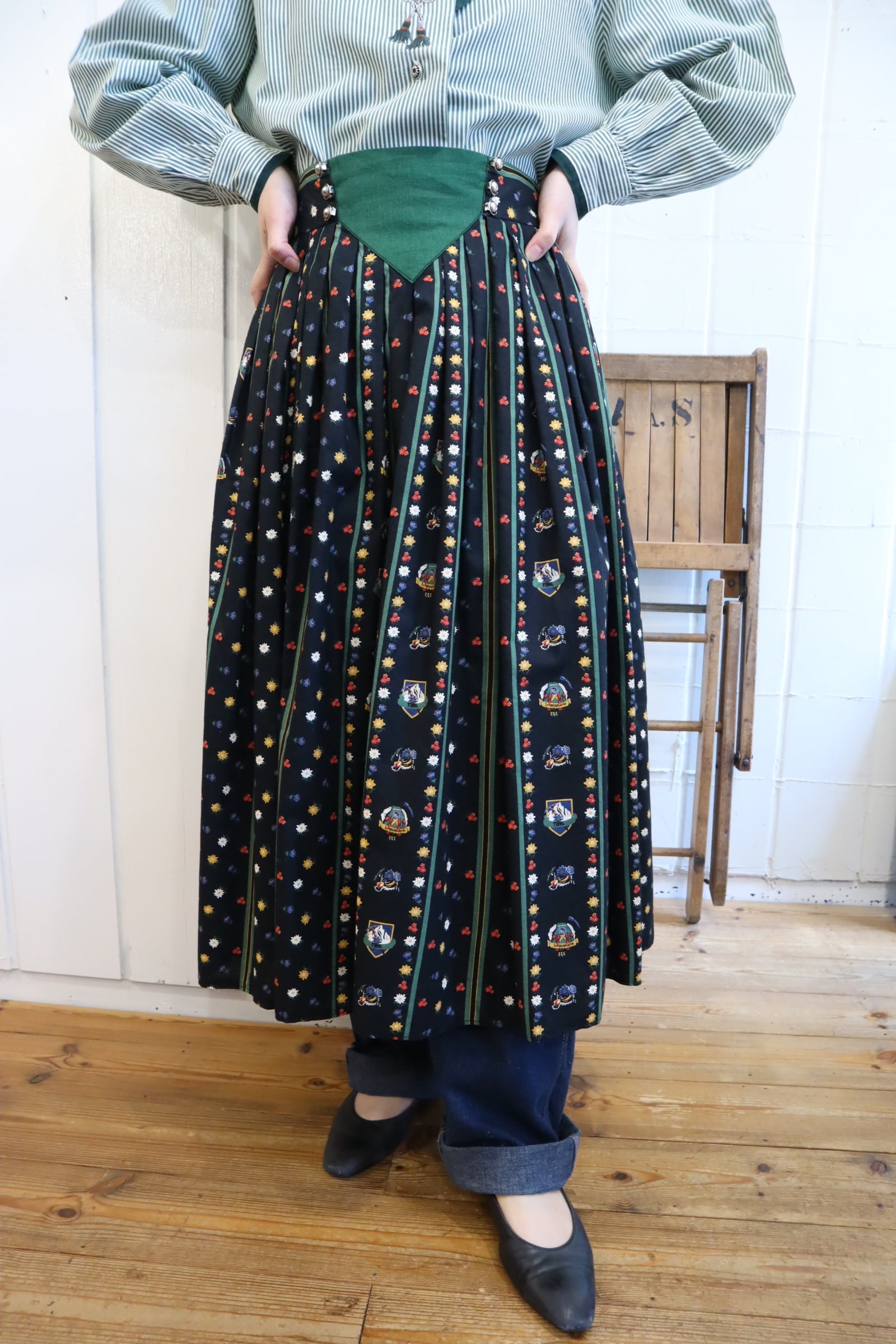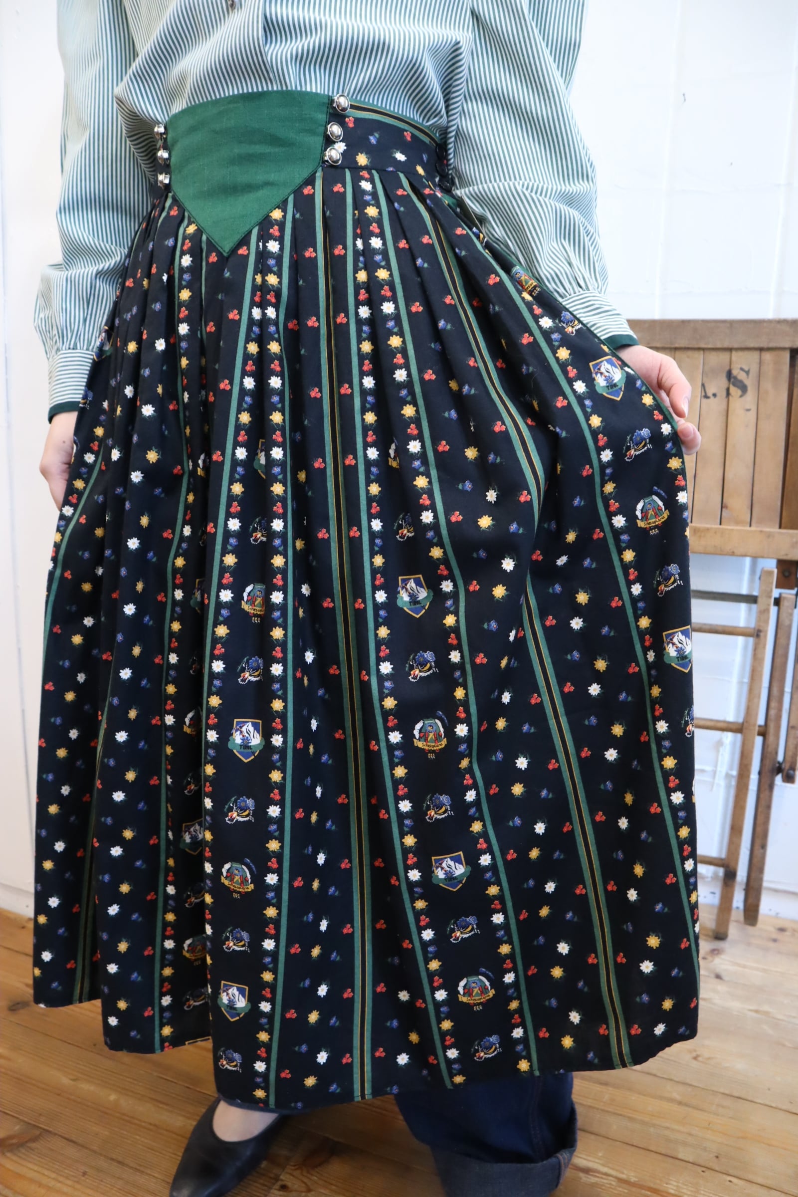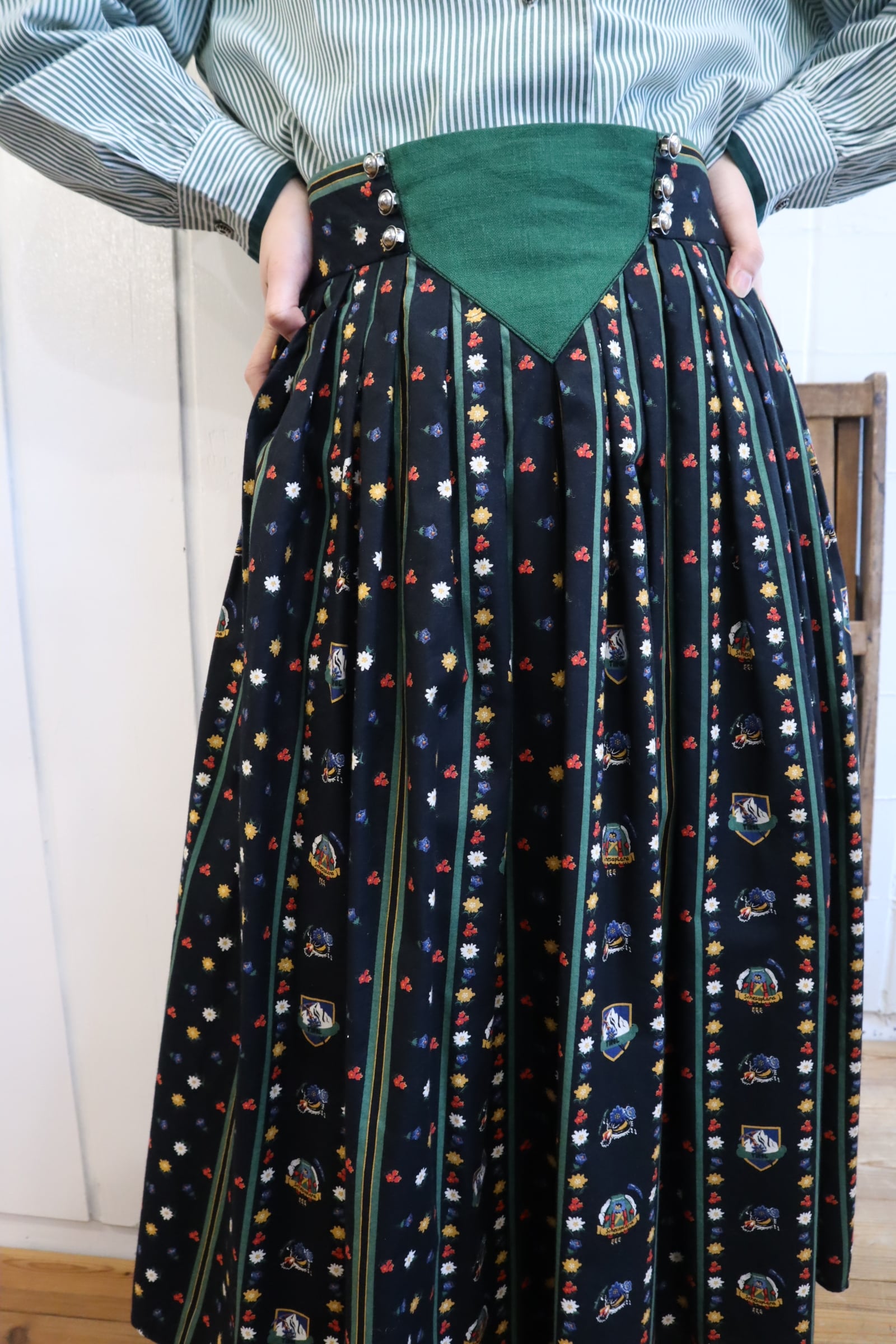 お花とチロル地方の名所のようなプリントが可愛いチロルスカート。