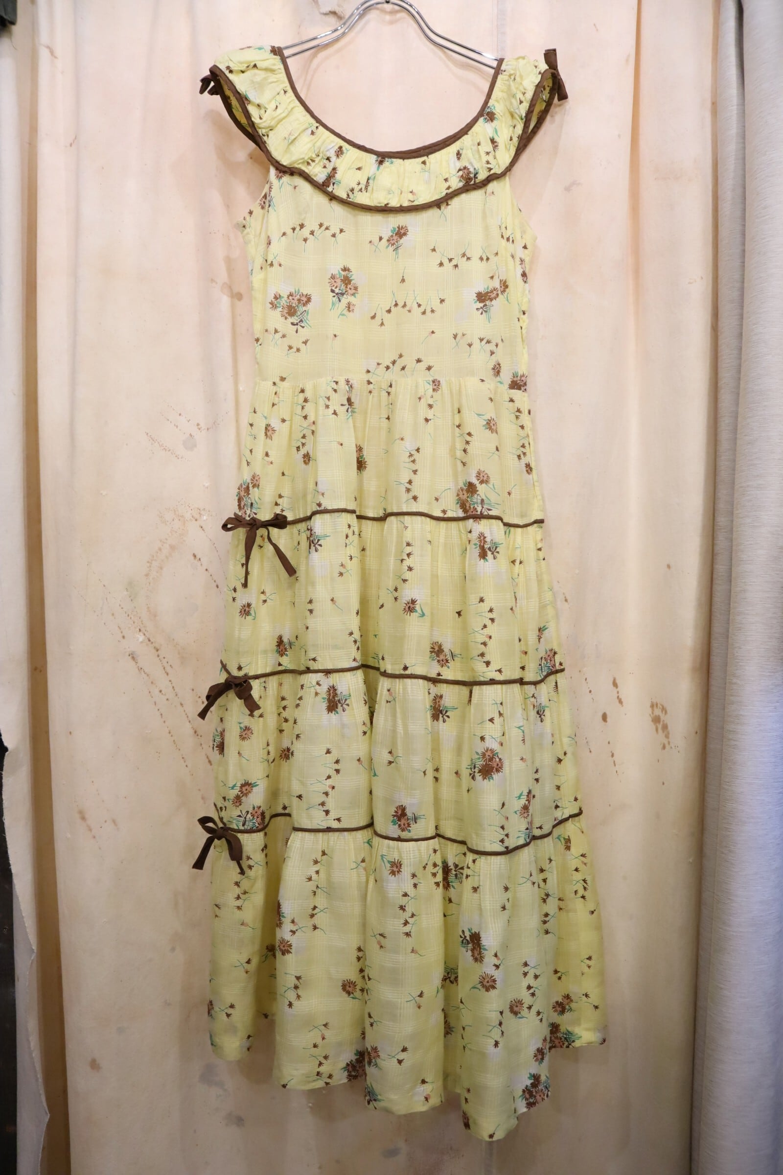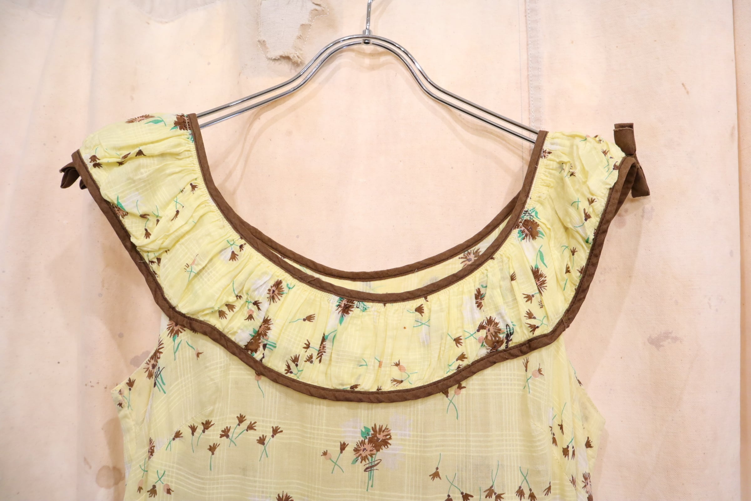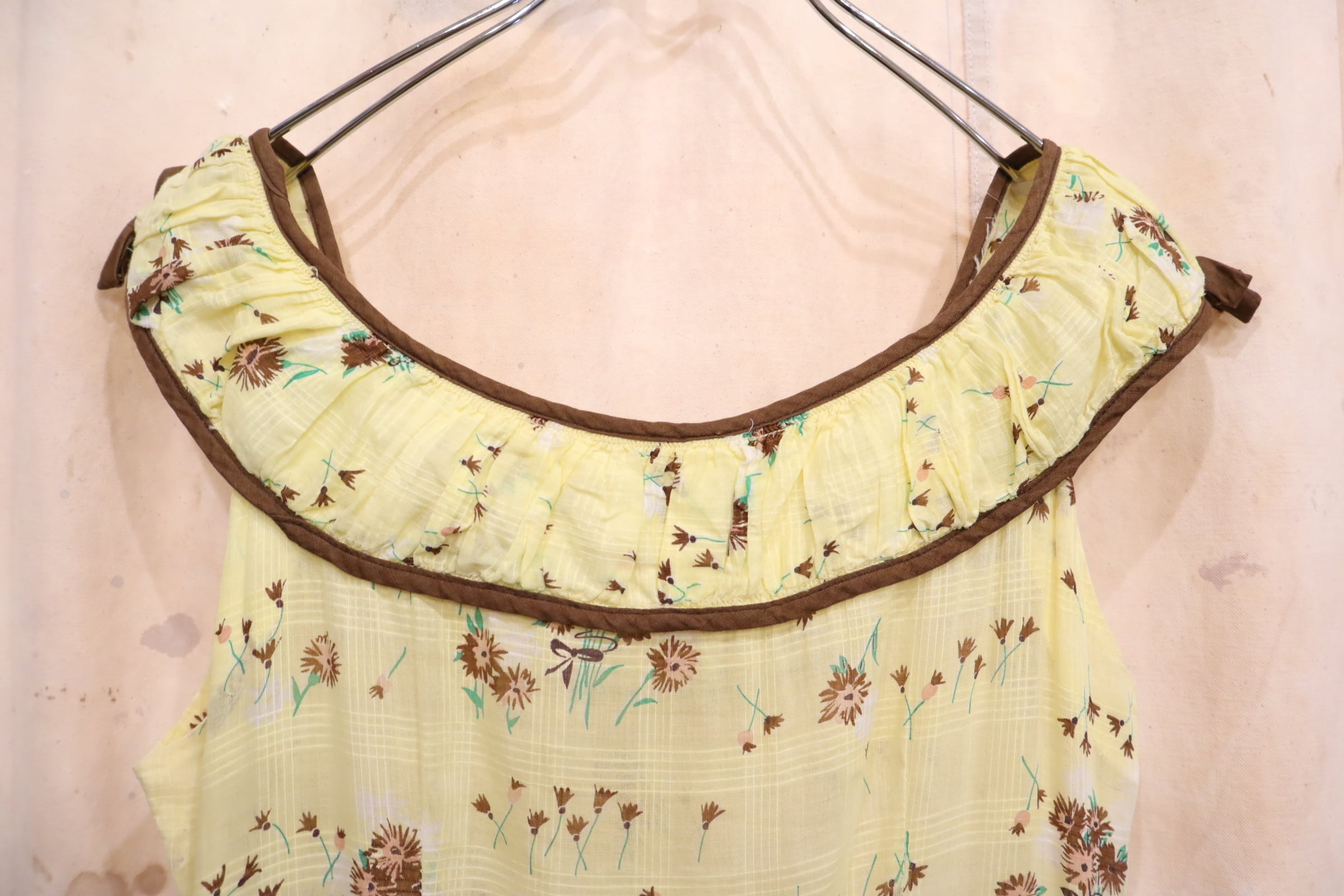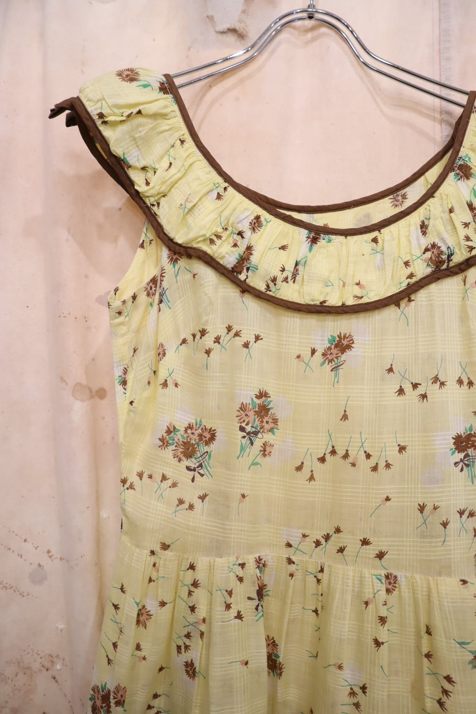 50s yellow×brown flower pattern sleeveless dress [l-5072]