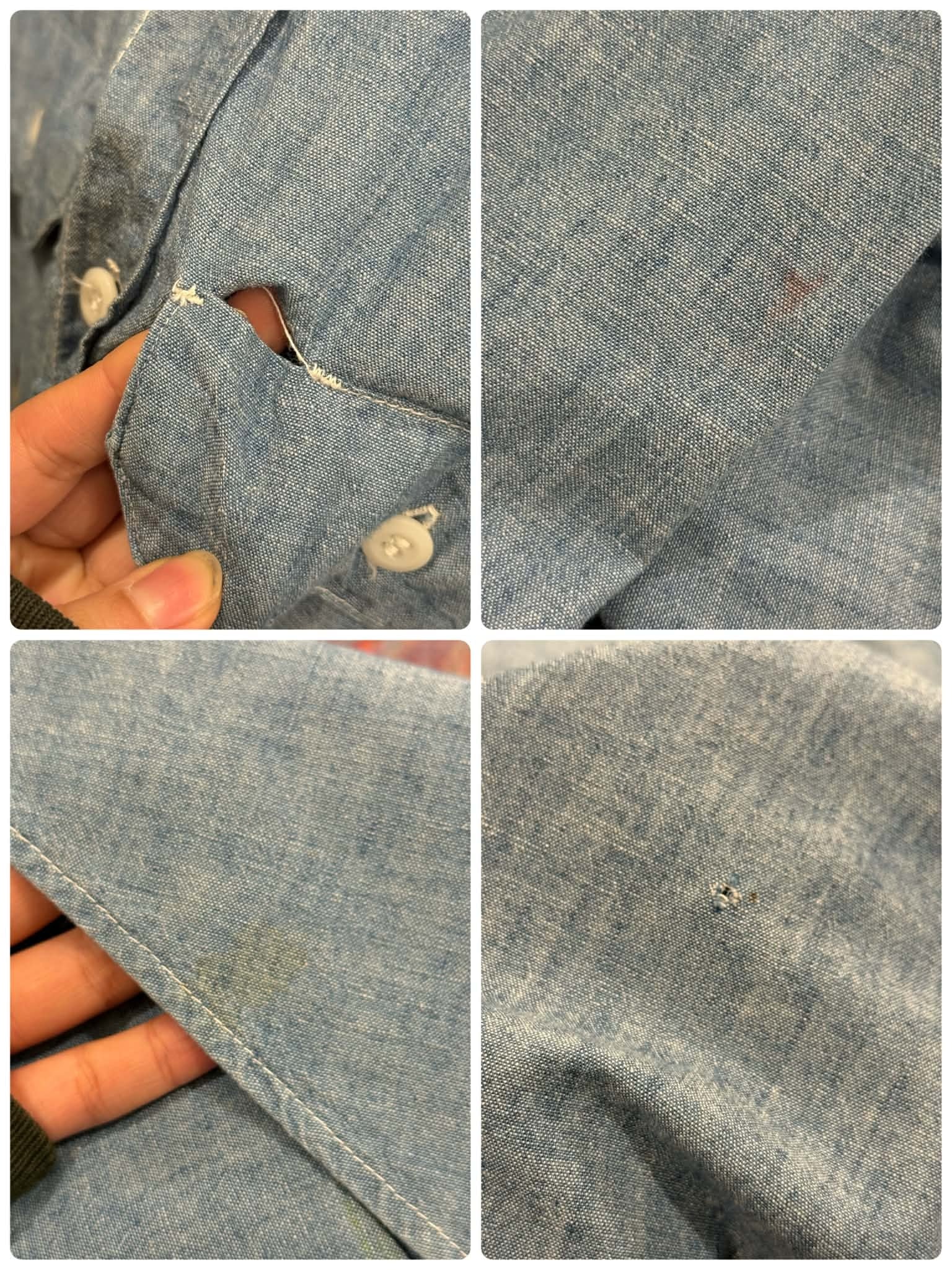 いくつかシミ汚れや色移りのような汚れ、小さなキズや糸のホツレがございますが、古着の味として着て頂けるかと思います。