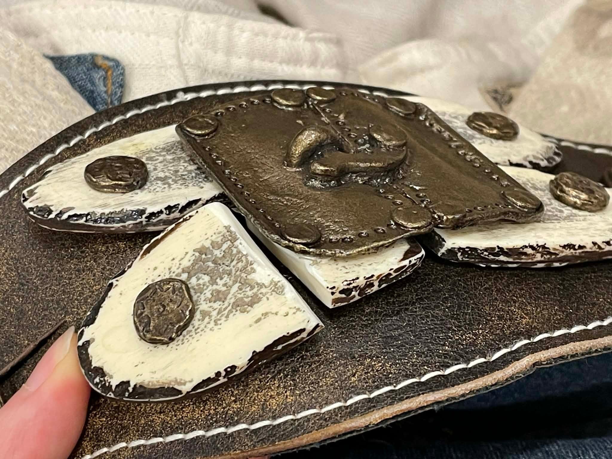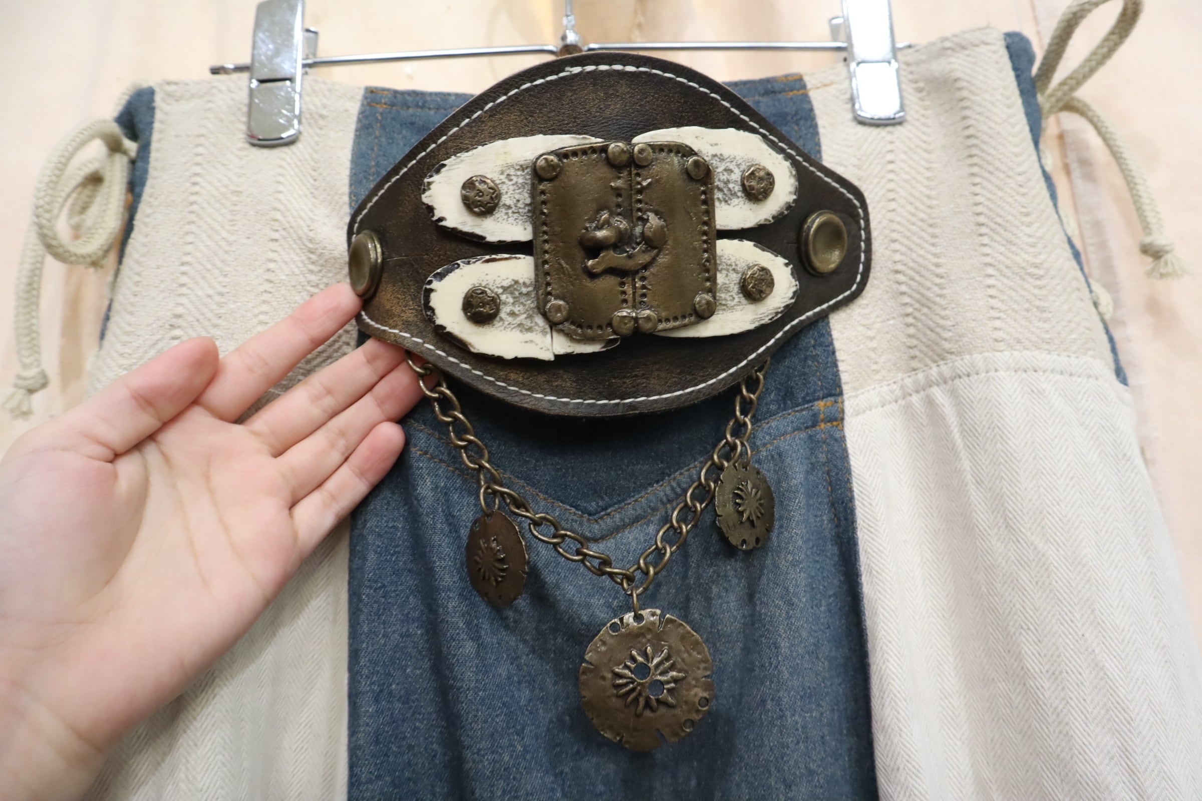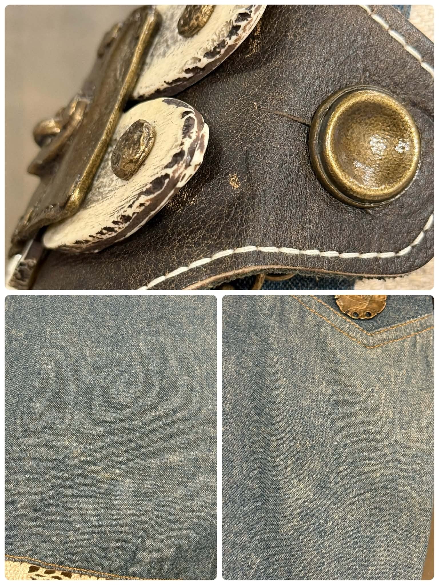 装飾に一部割れている箇所、レザーに一部キズ、ブルー生地に色褪せがございますが、古着の味として着て頂けるかと思います。