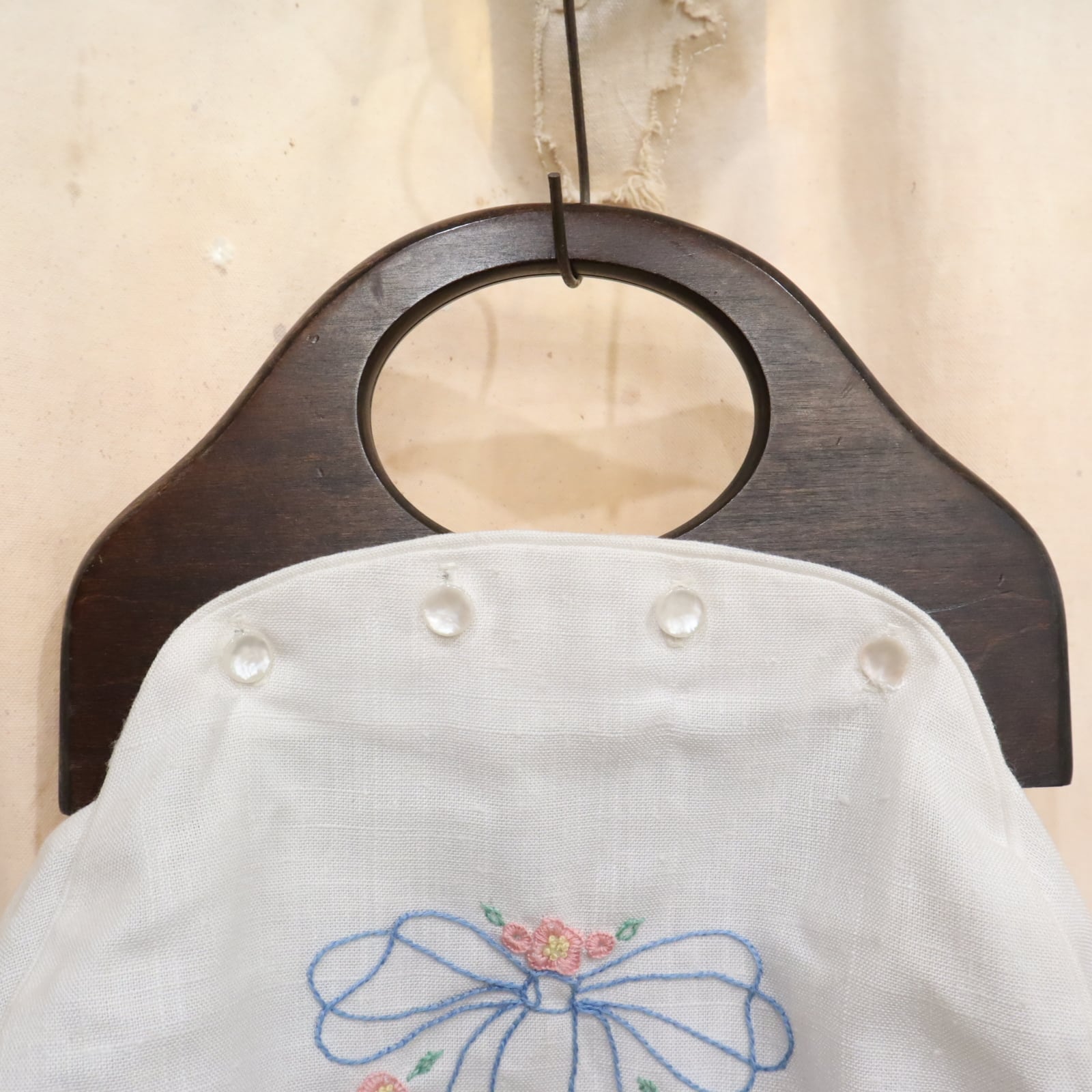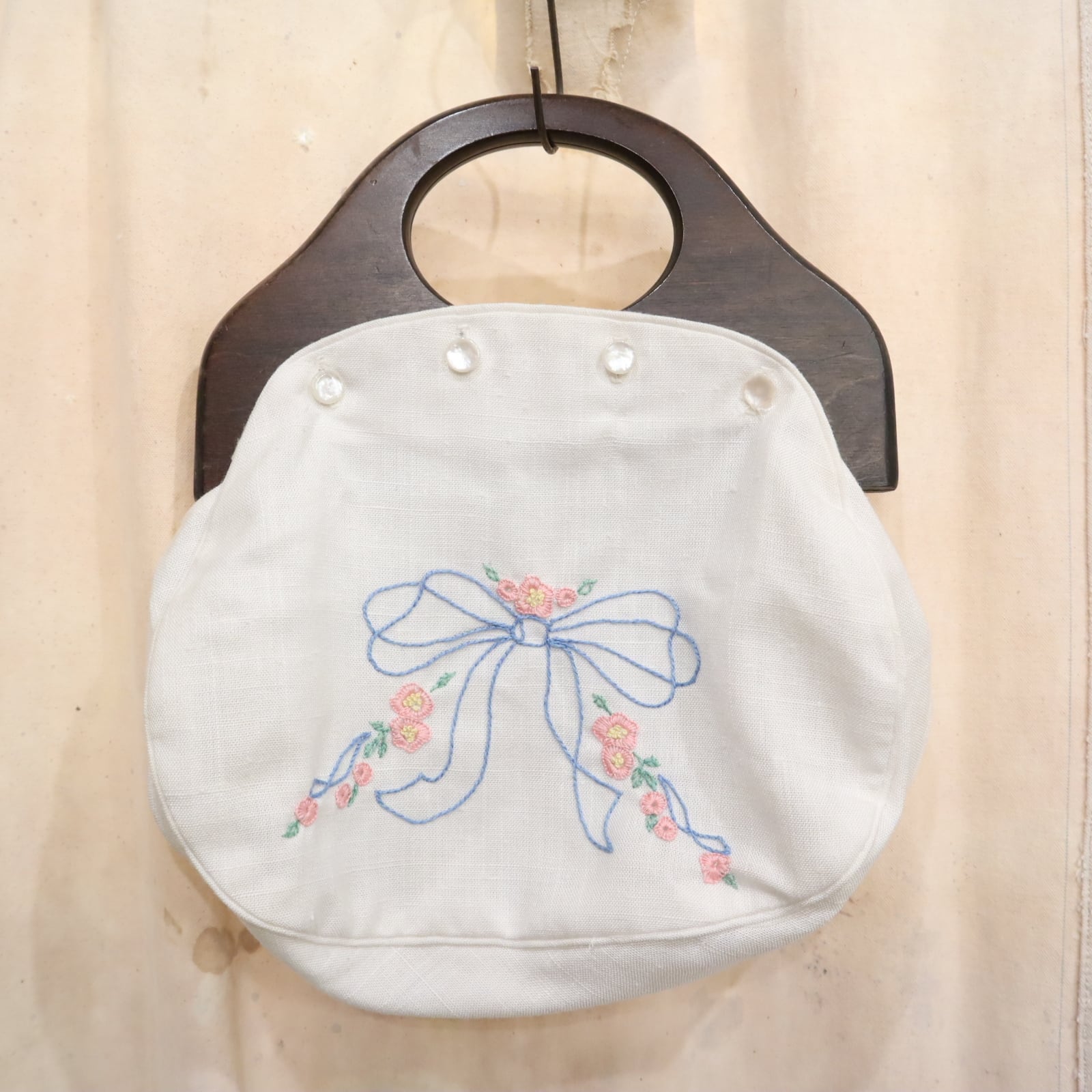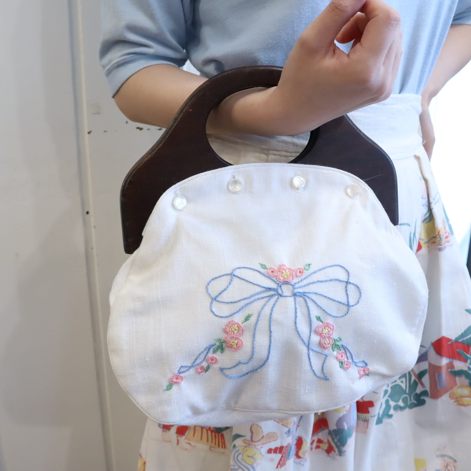 お花とリボンでガーリーな印象がありますが木製の持ち手で大人っぽいハンドバッグです。