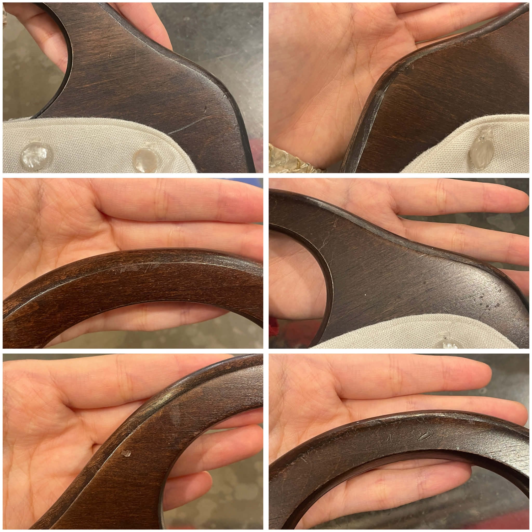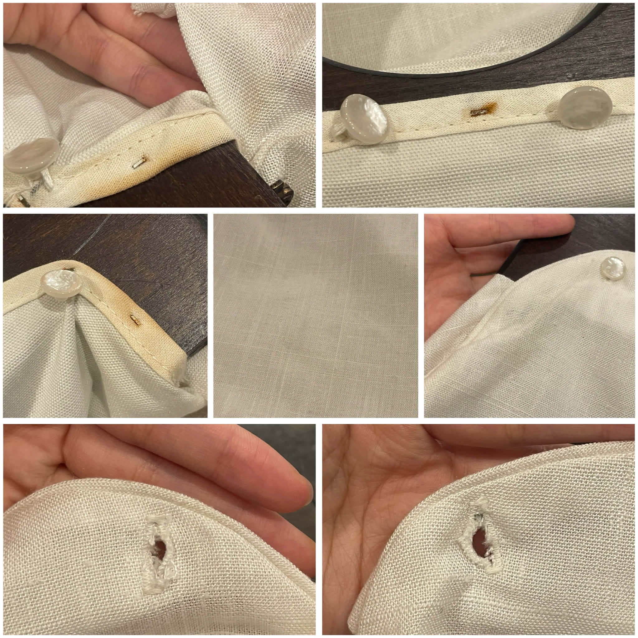 いくつかシミ汚れや木製部分傷、毛羽立ちや錆びからなる汚れ(フロントからは見えません)がございますが、問題なく使用して頂けます。