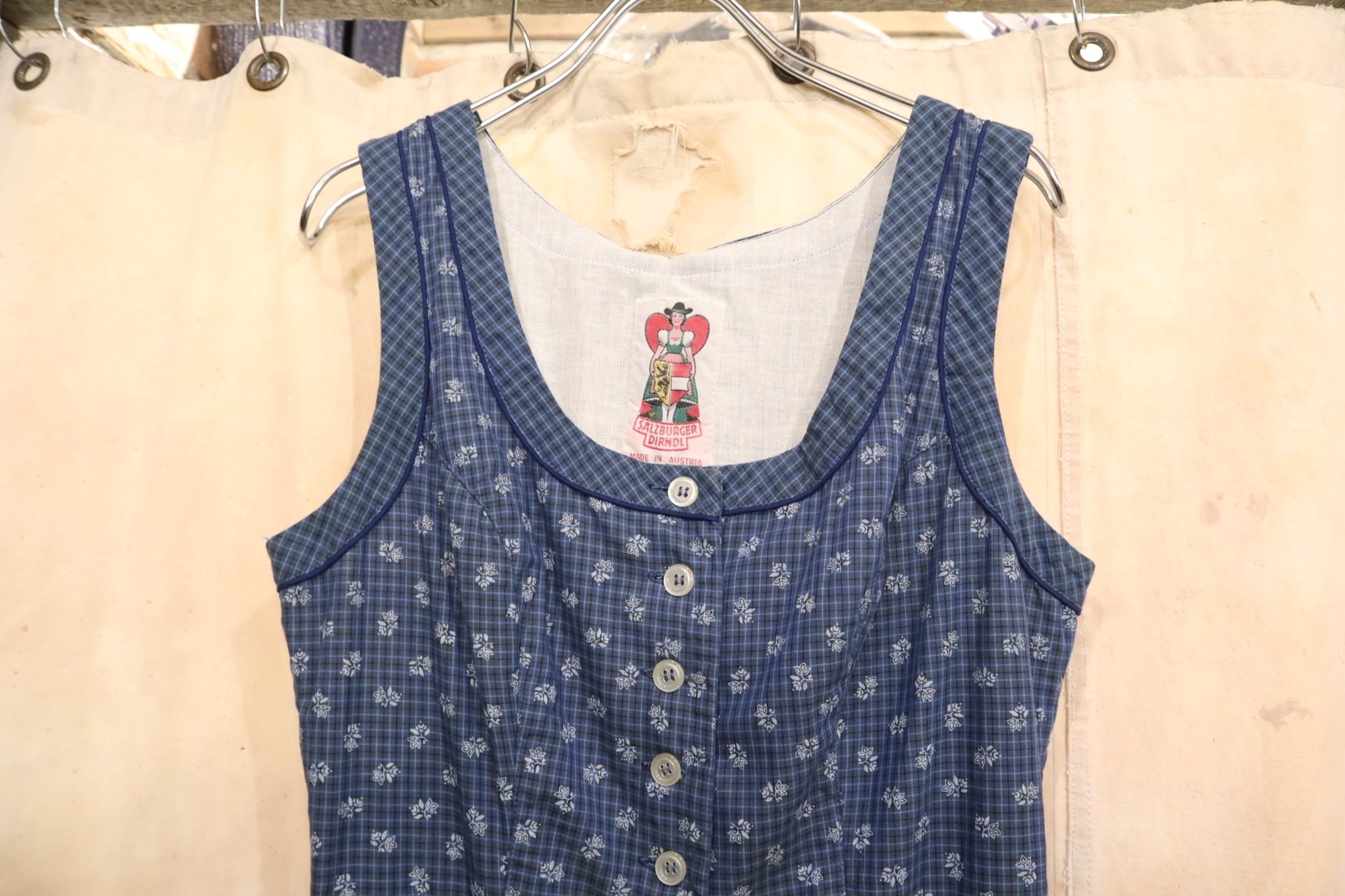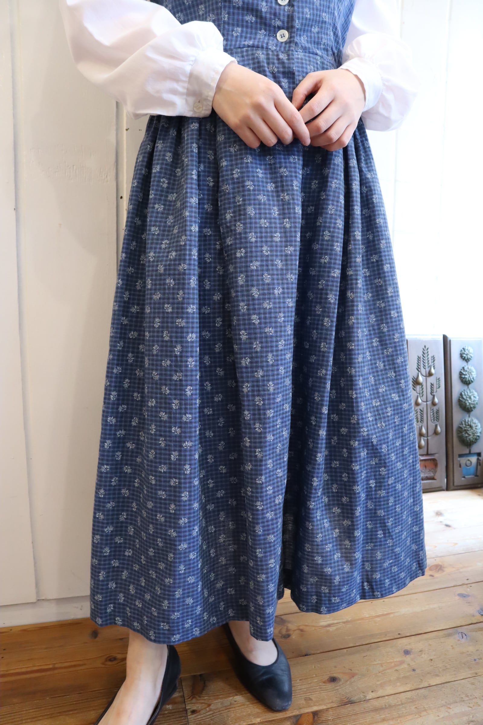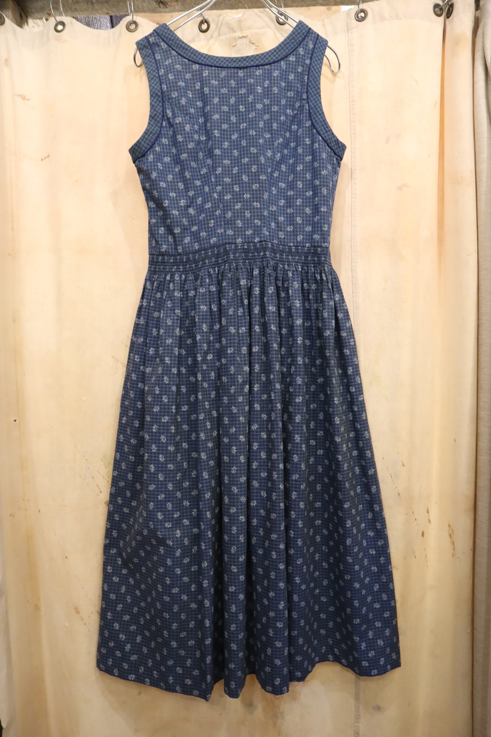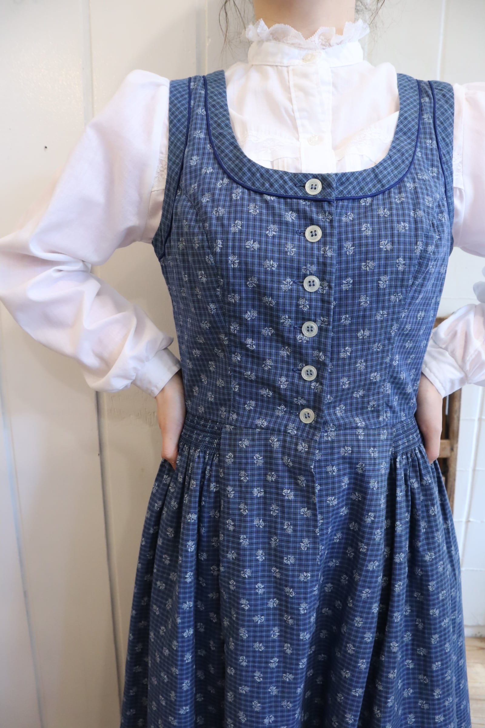 blue×white plaid&leaf sleeveless tyrol dress [l-5184]