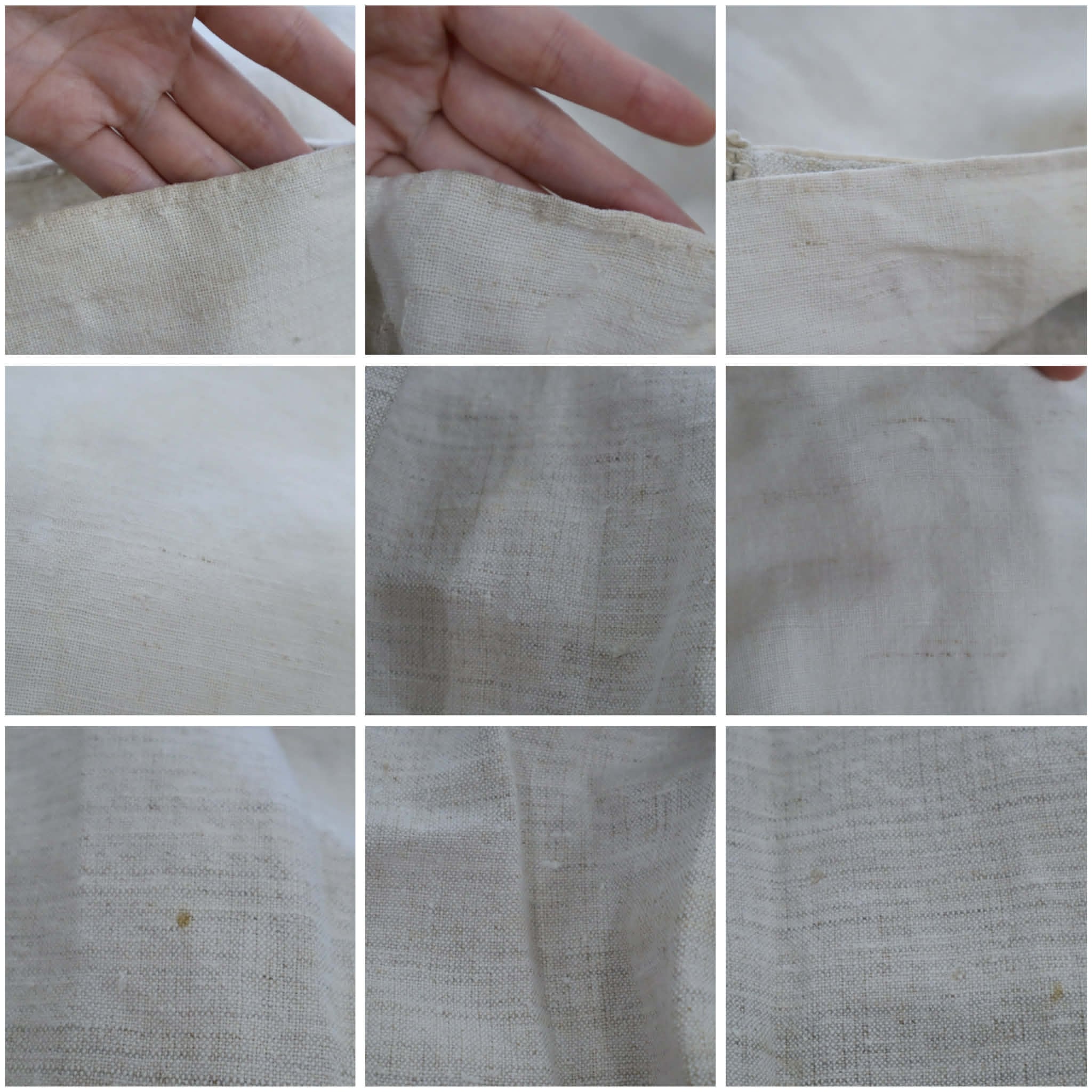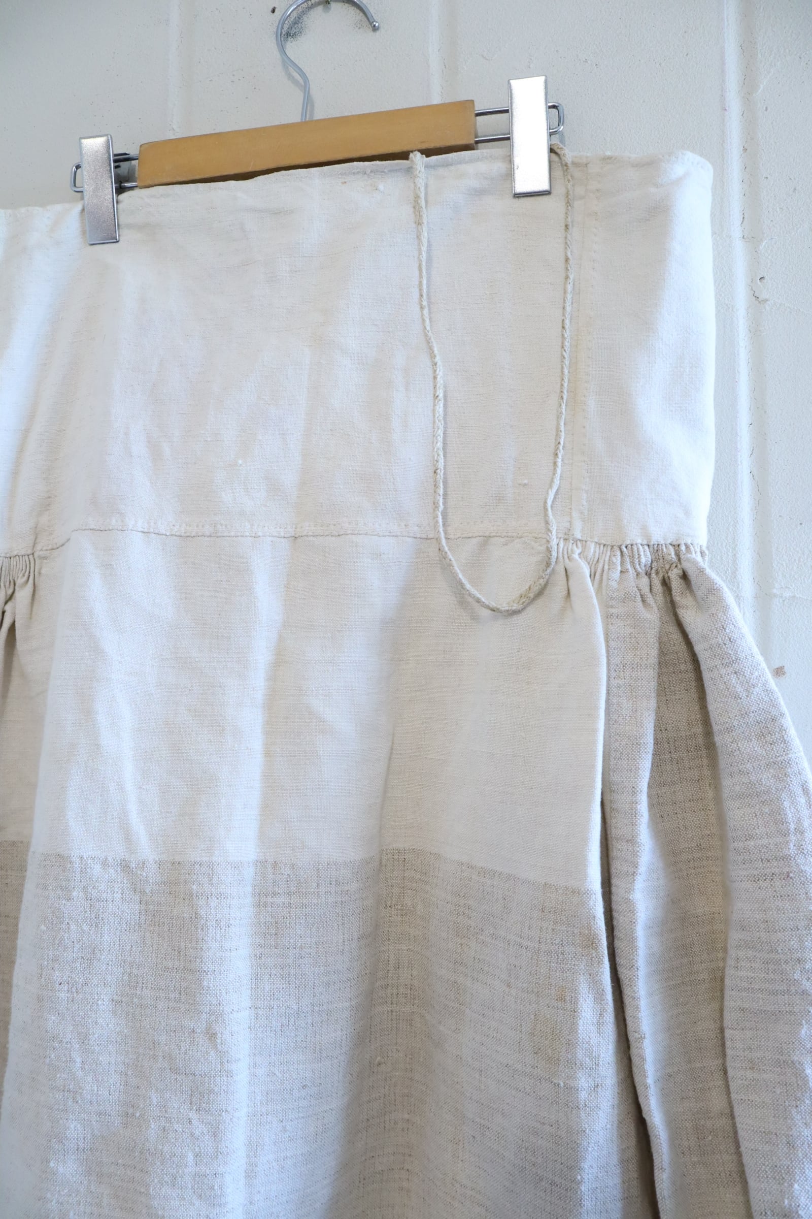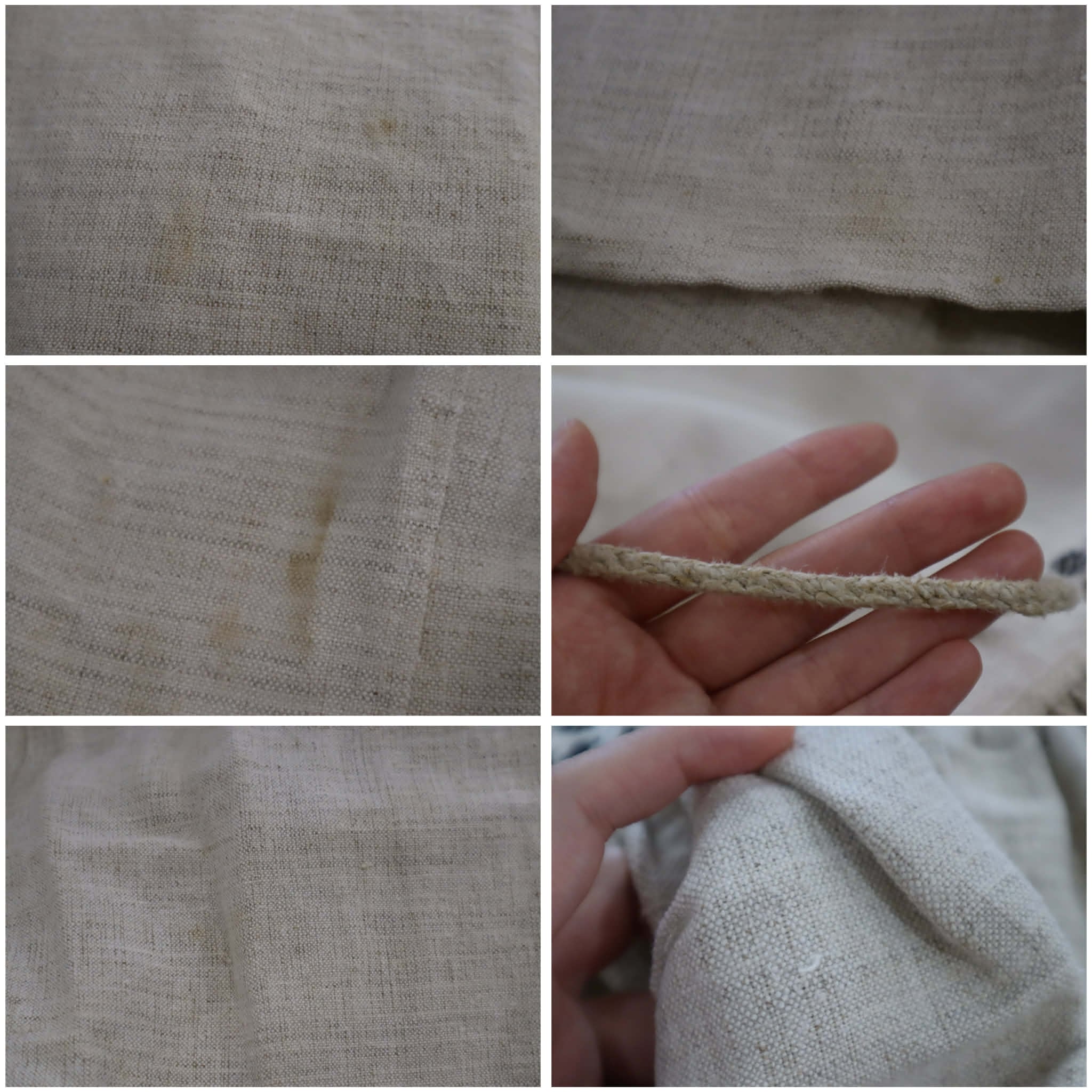 いくつかシミ・汚れ・素材特有のツレや他繊維の混ざり、紐にやや毛羽立ちがございます。