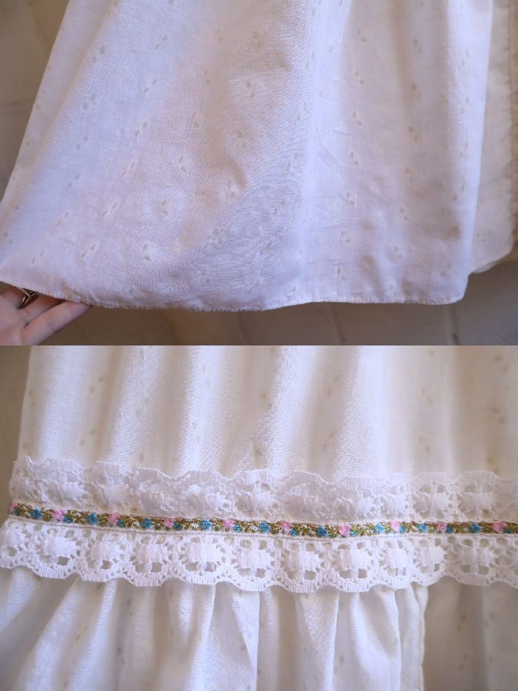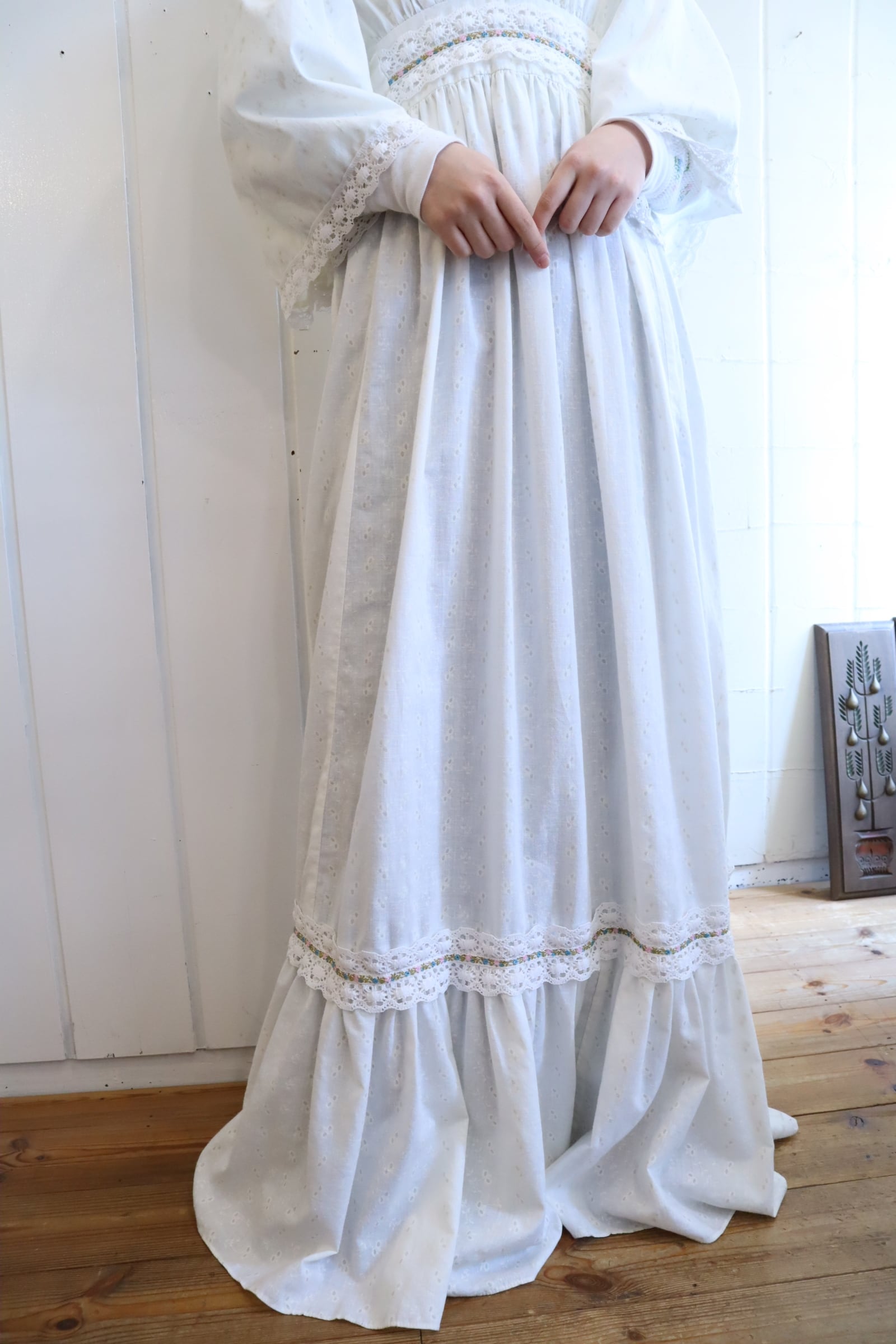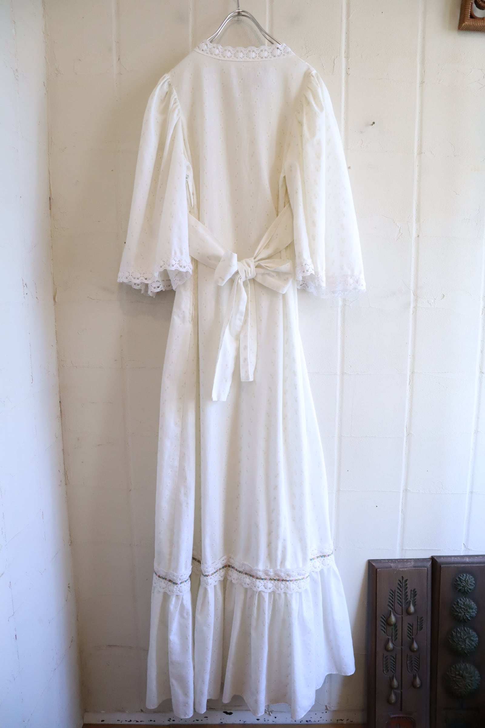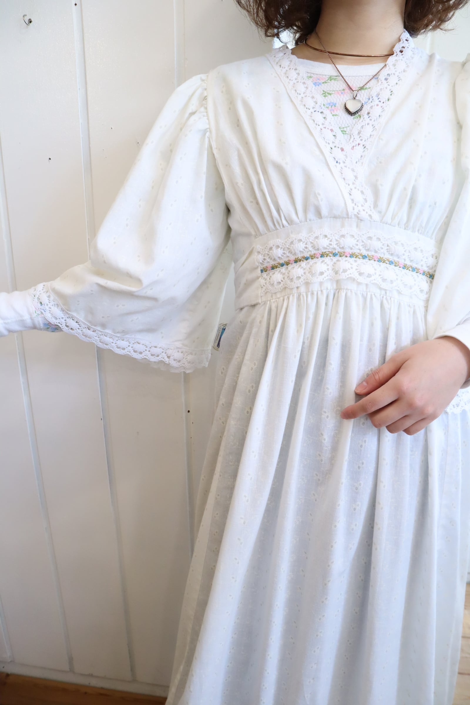70s white lace design cachecoeur neck dress [l-5192]