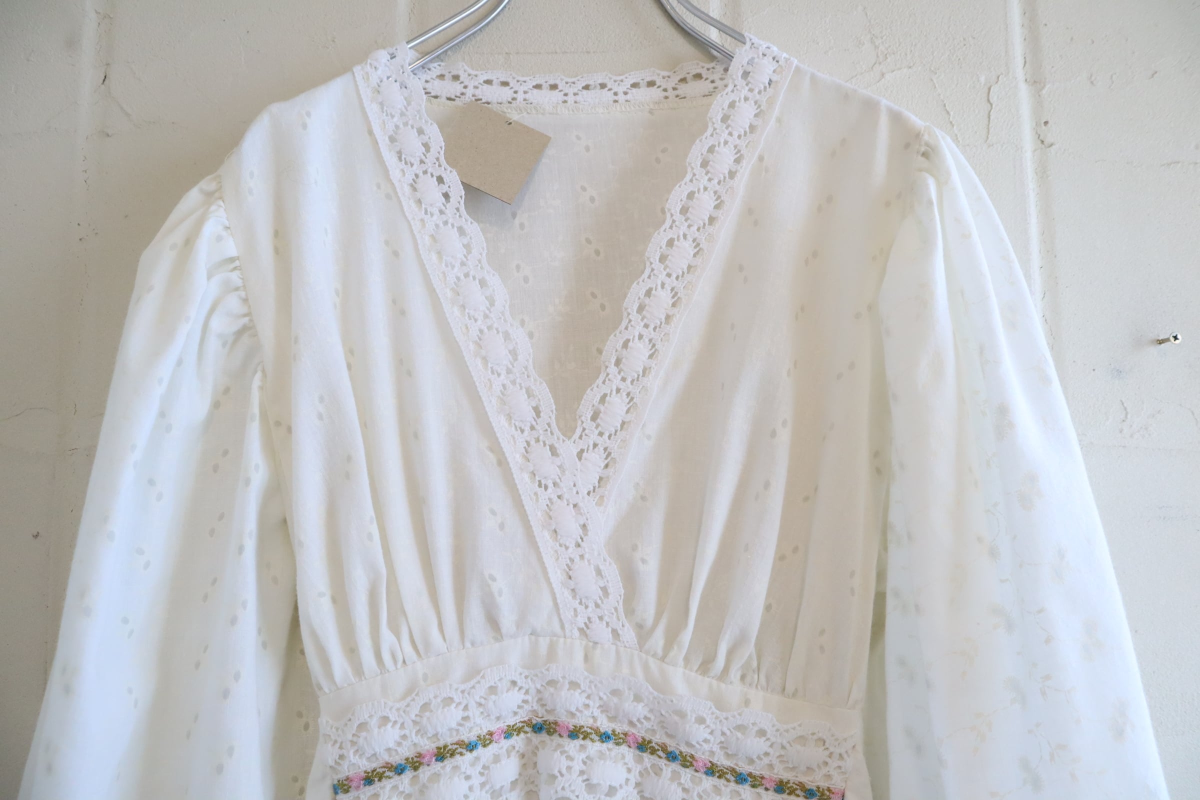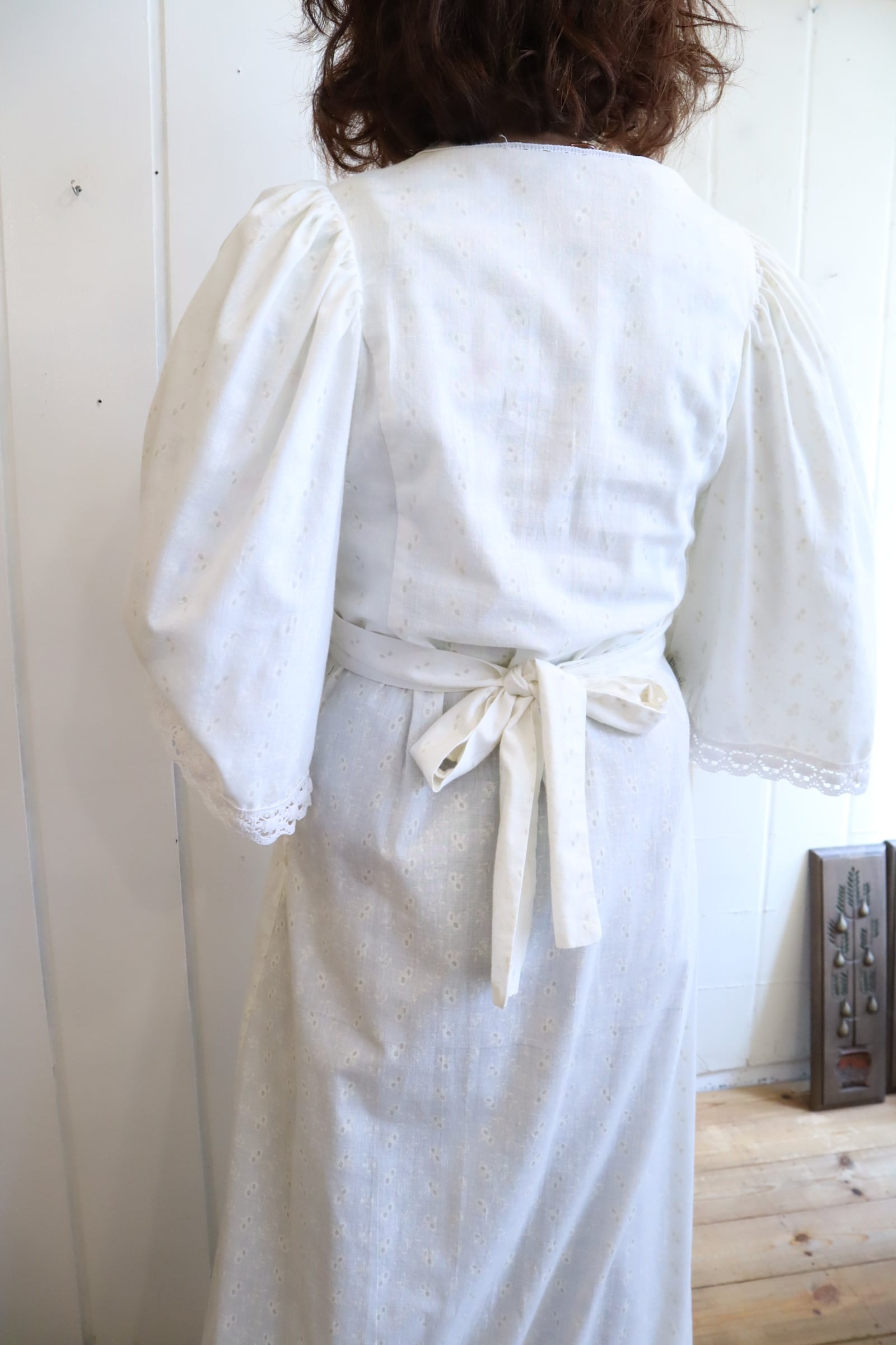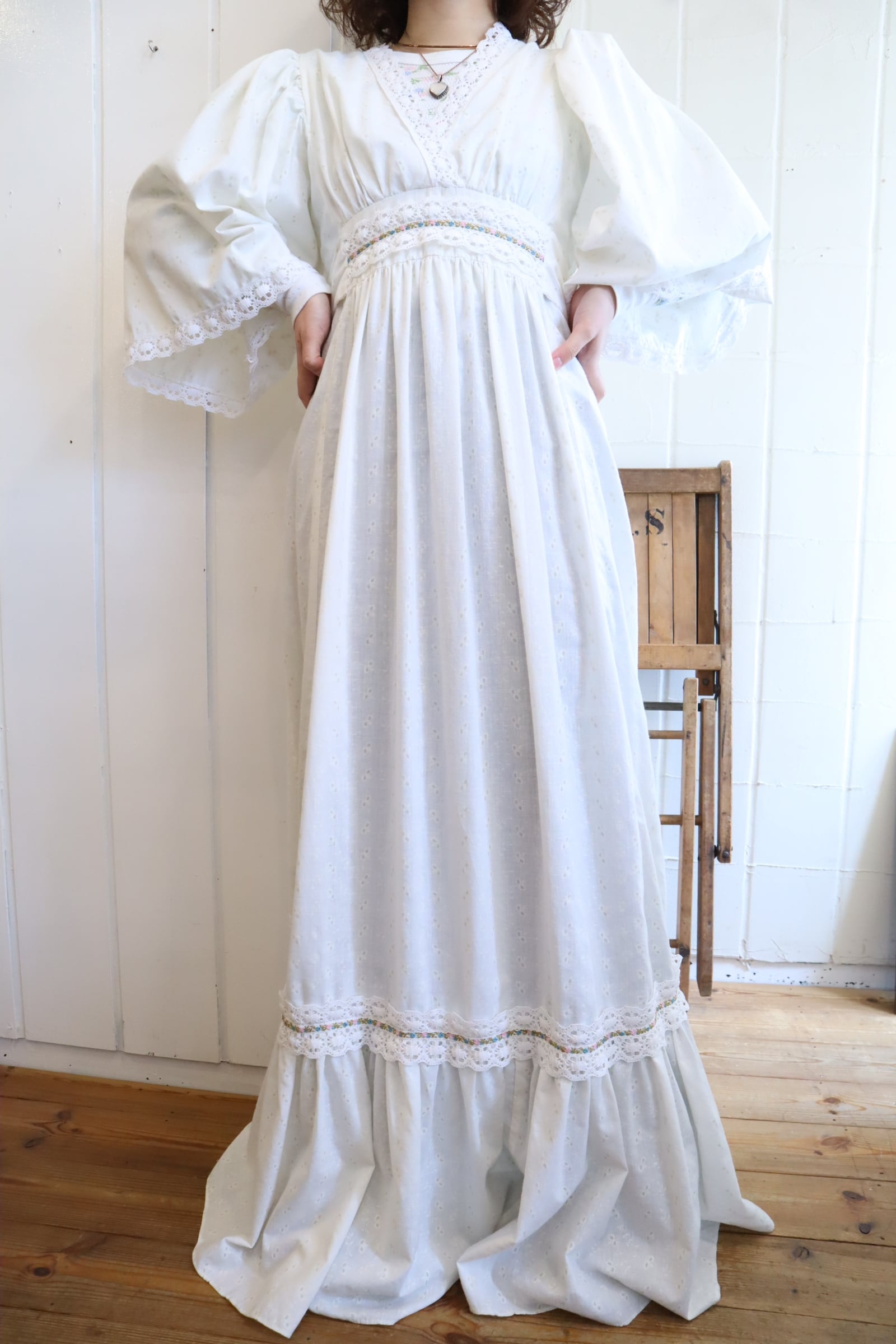 70s white lace design cachecoeur neck dress [l-5192]