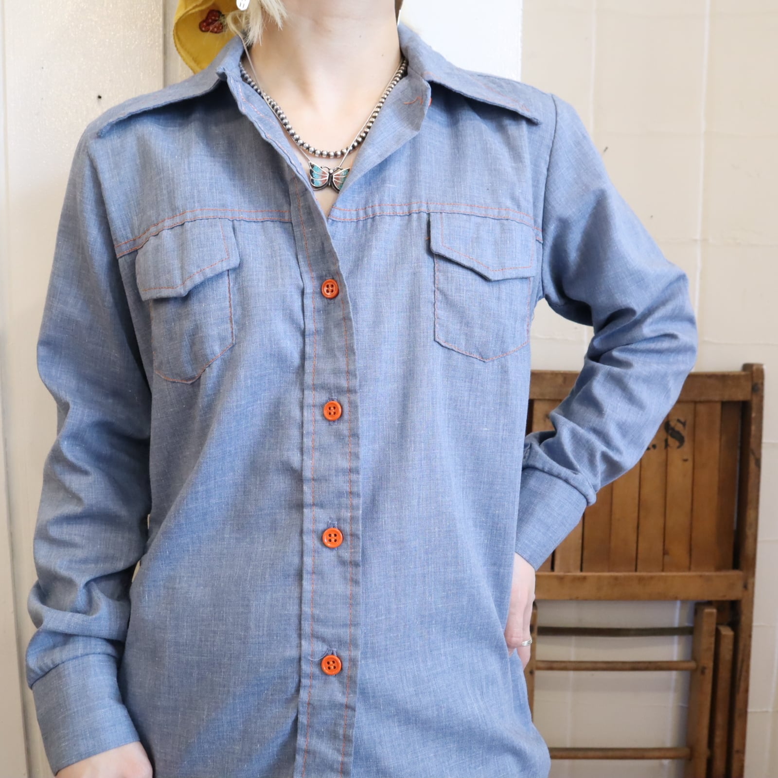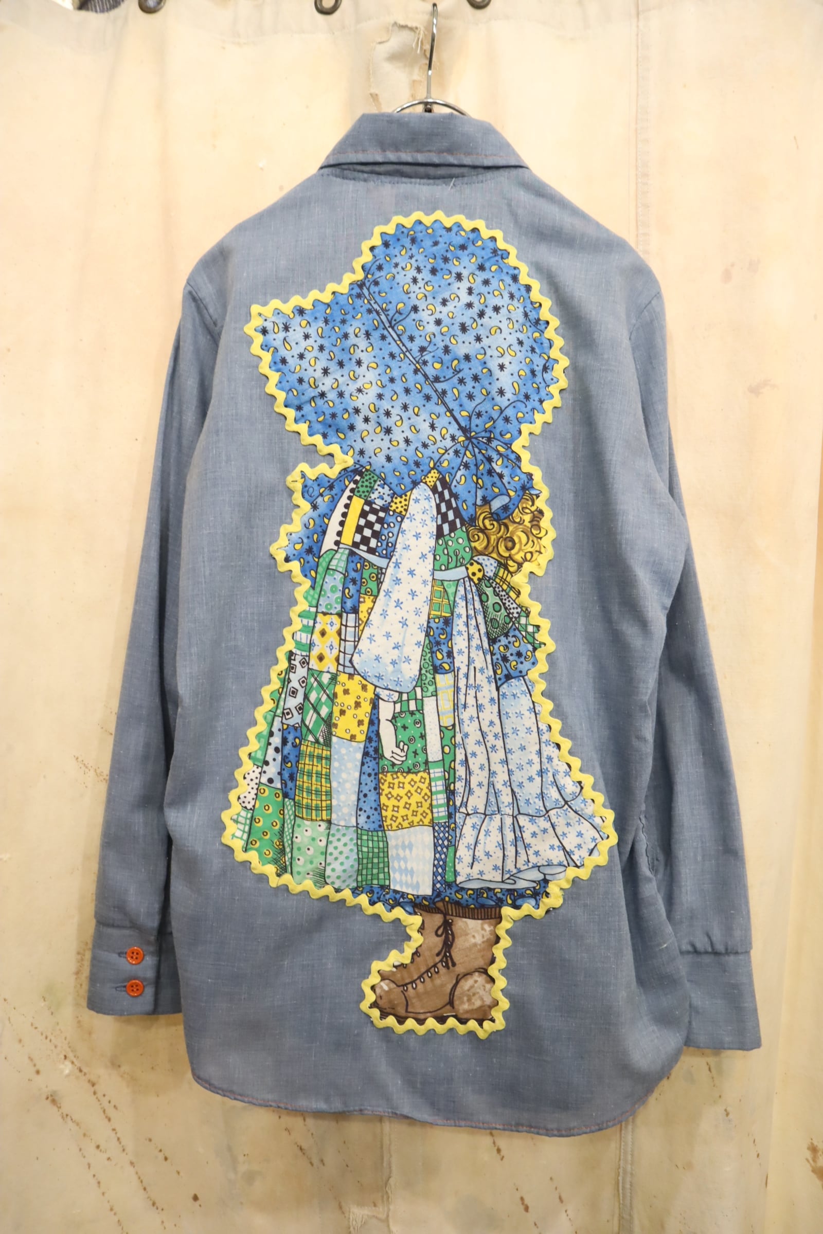 made in USA lightblue×yellow×green girl patch chambray shirt [l-5201]