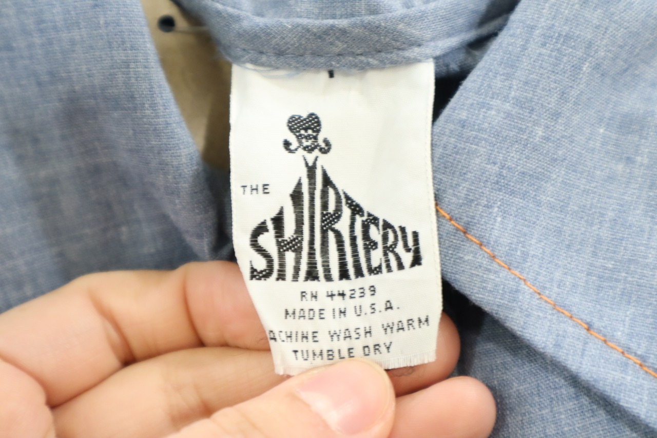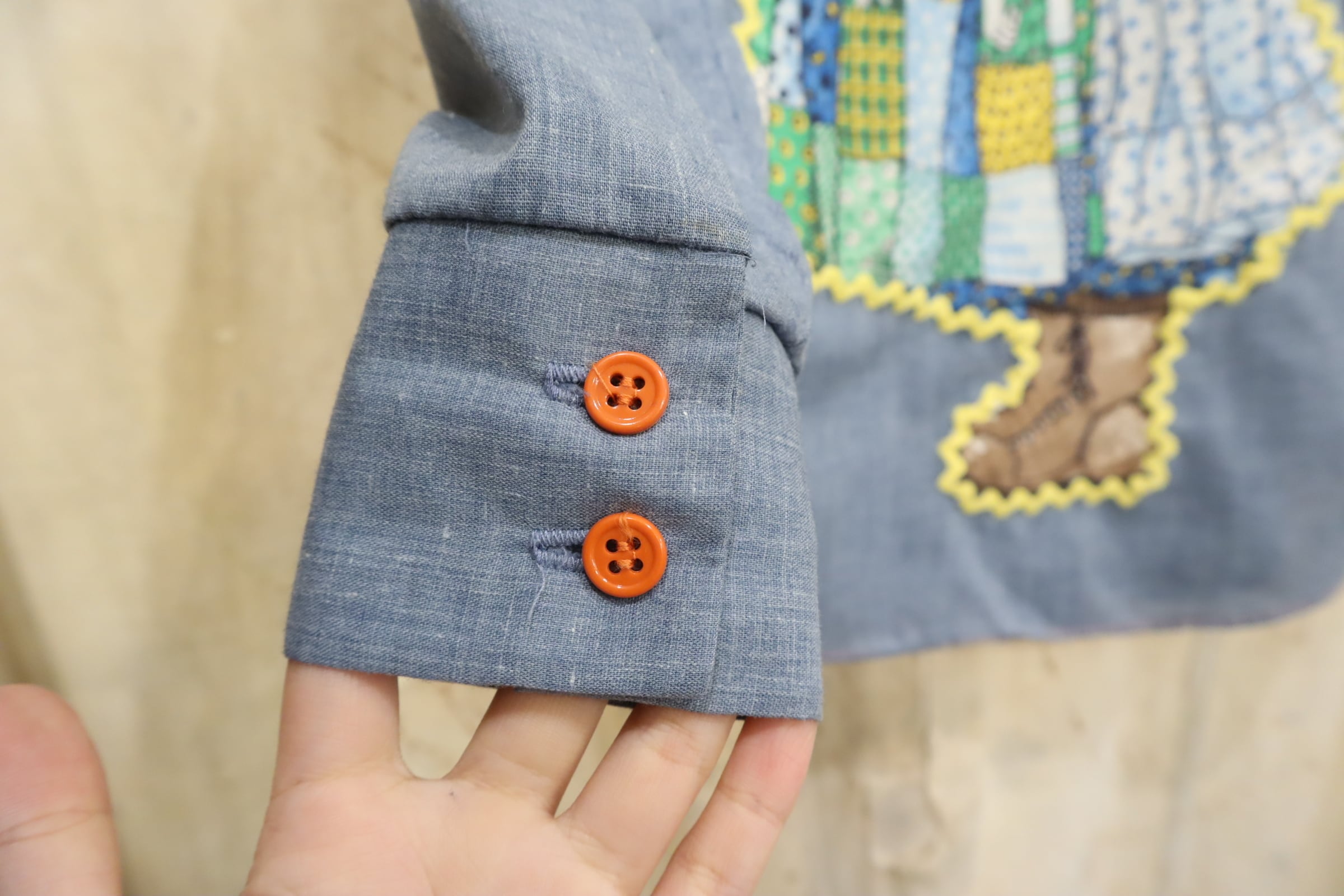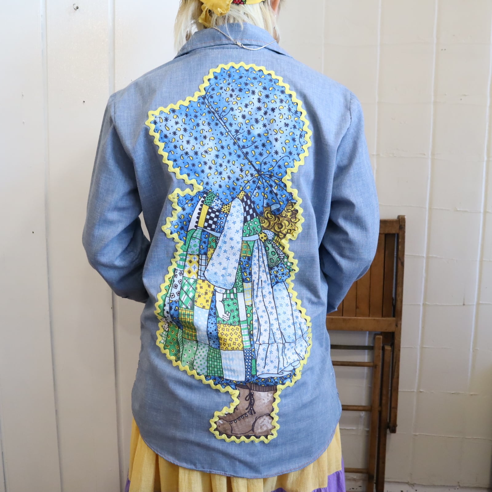 後ろに大きな女の子のワッペンが施されたシャンブレーシャツ。