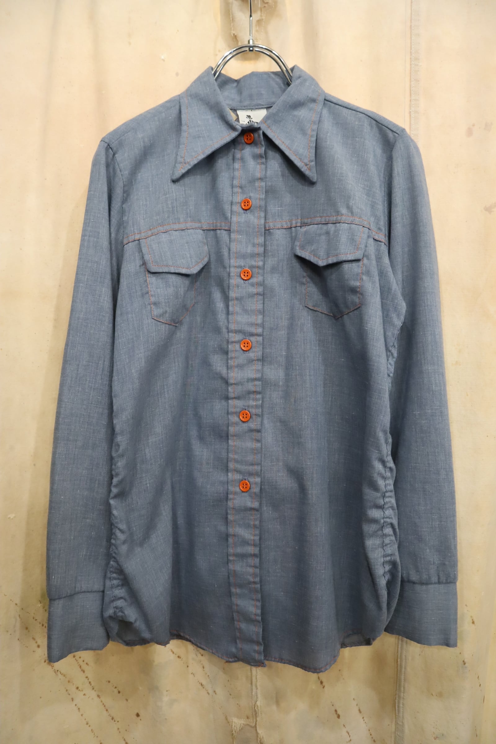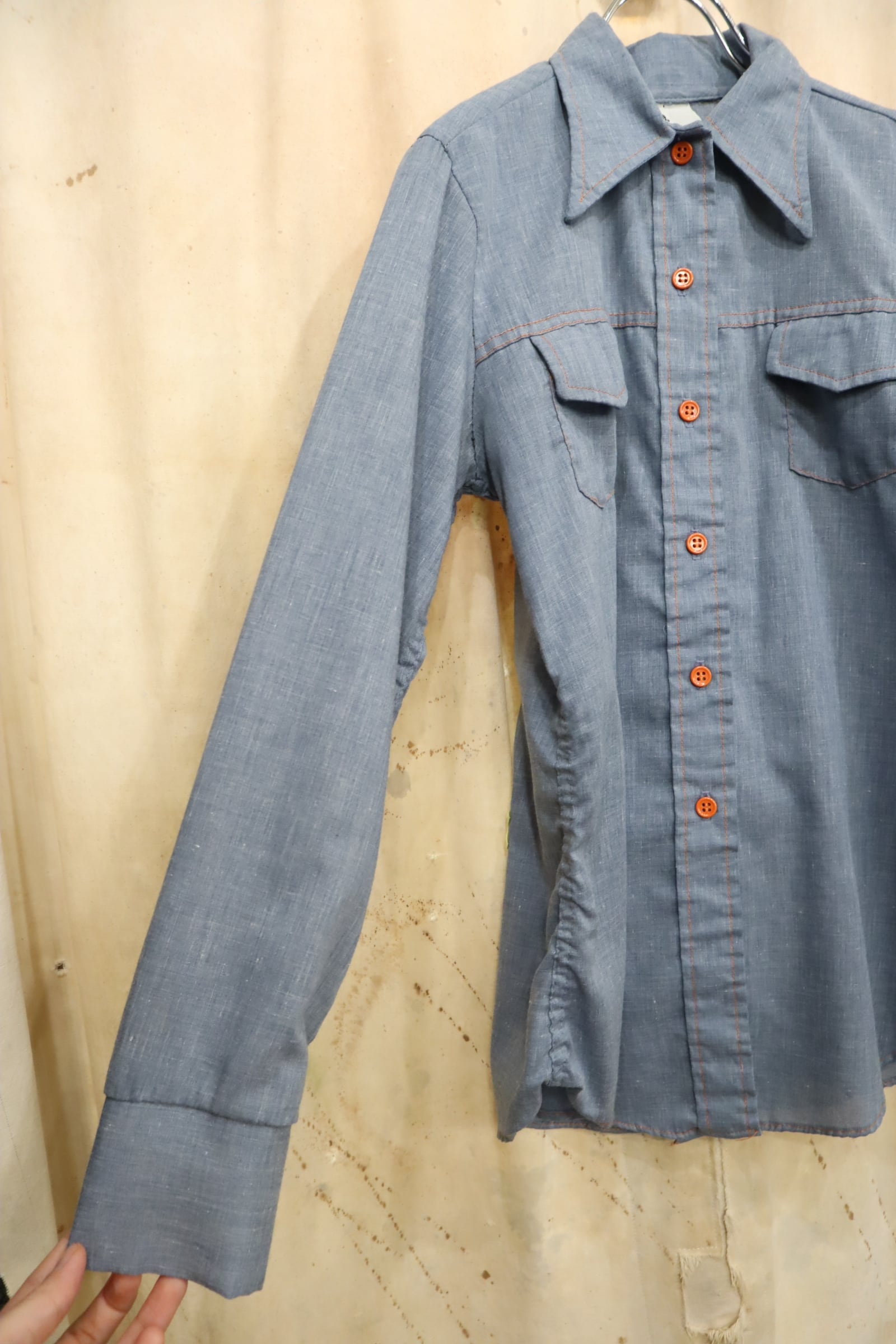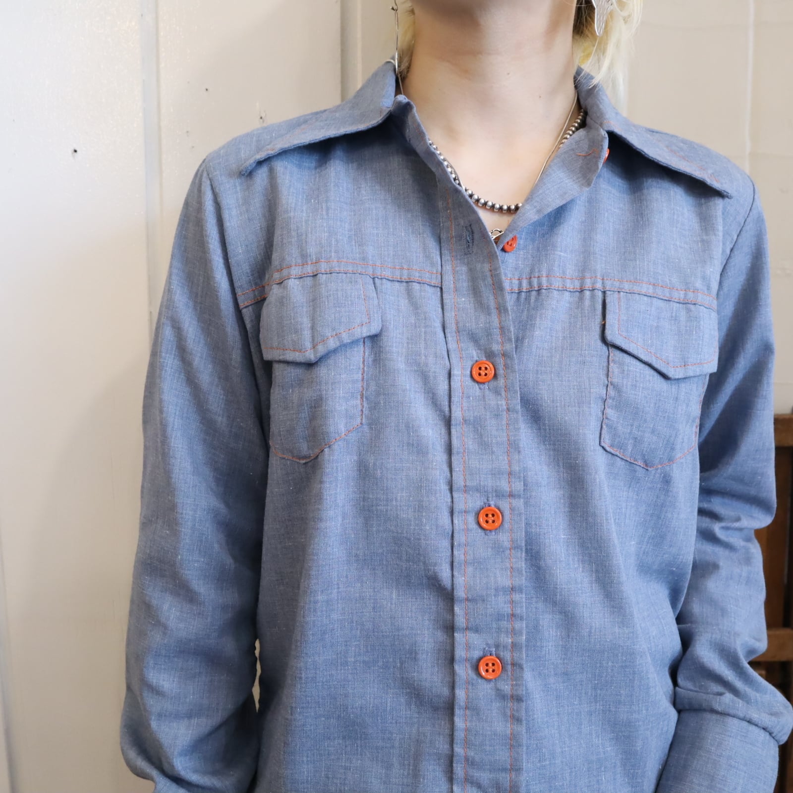 後ろに大きな女の子のワッペンが施されたシャンブレーシャツ。