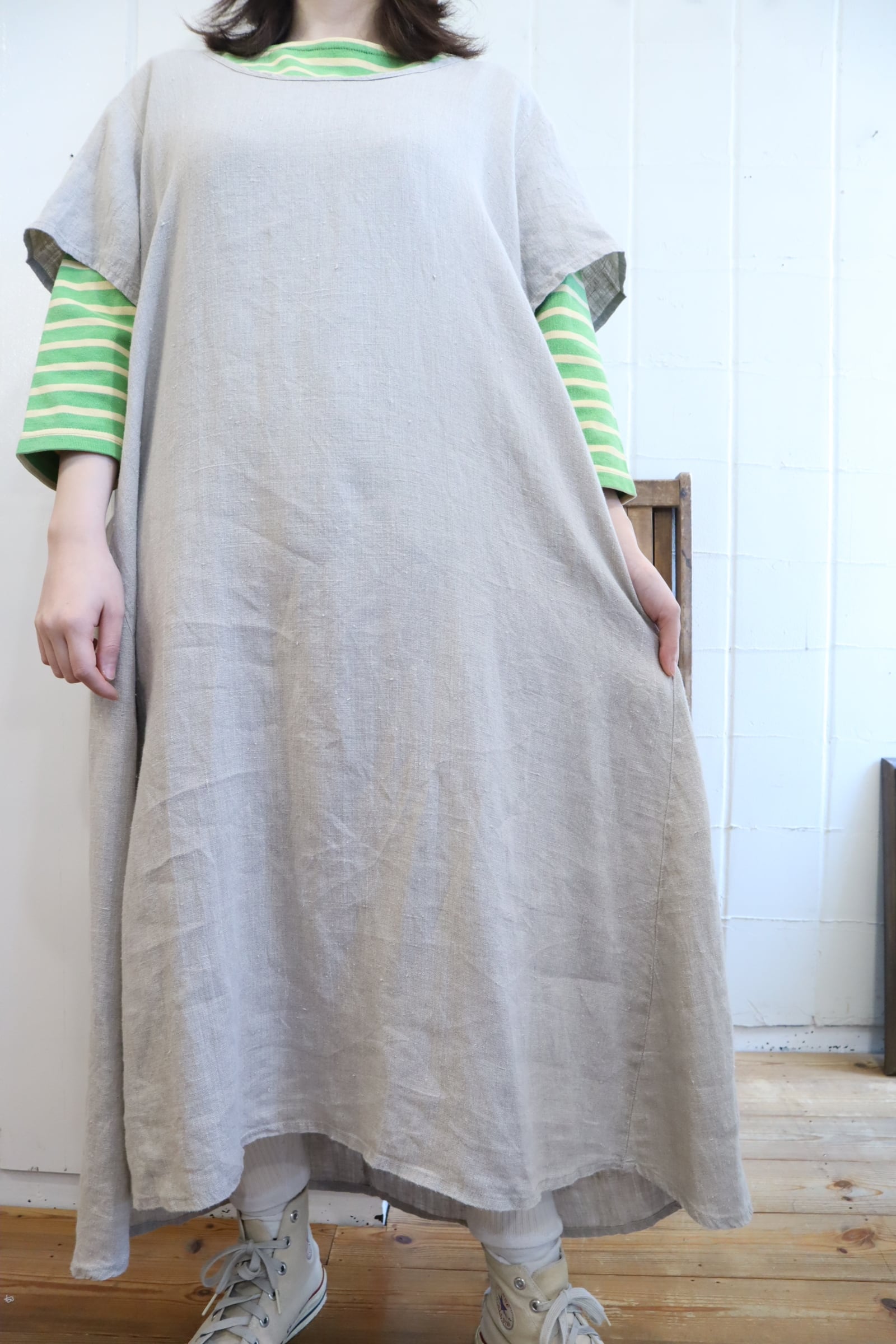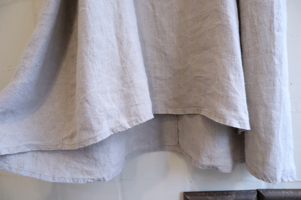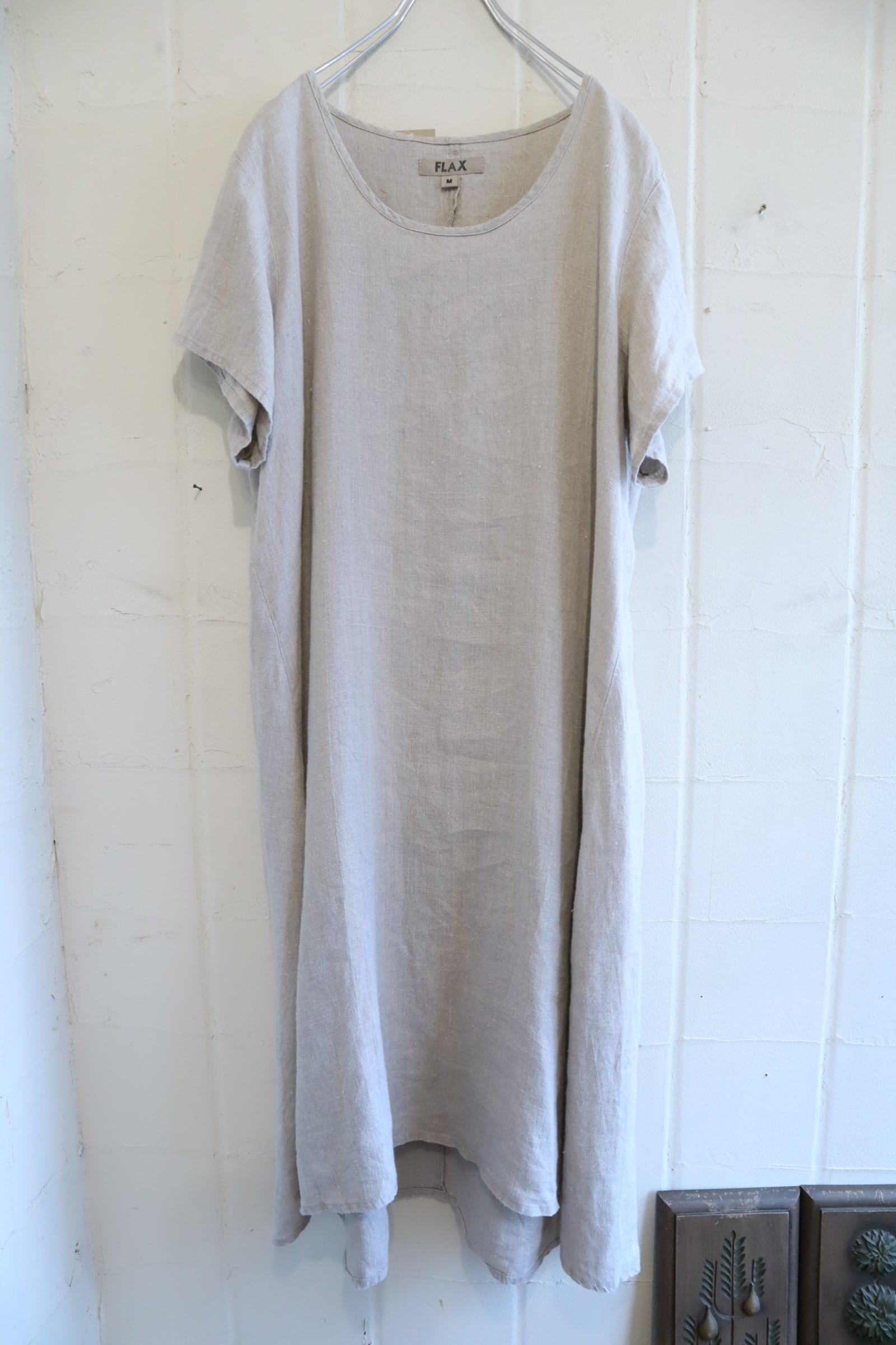 前後ろで長さの違う裾のデザインがユニークなFLAXのドレス。