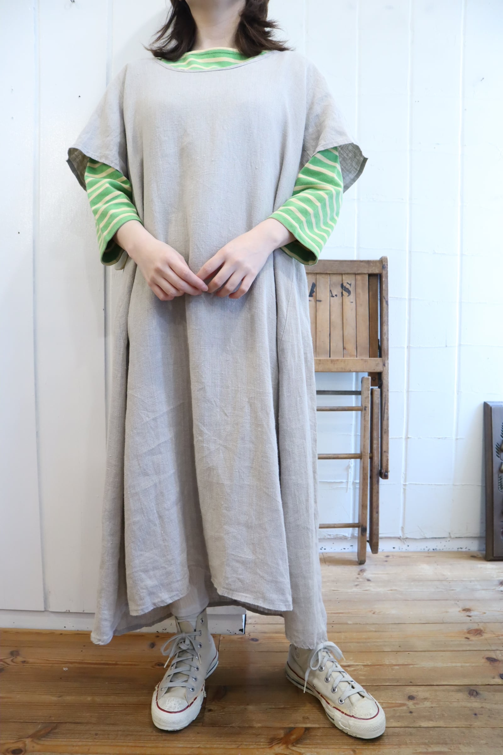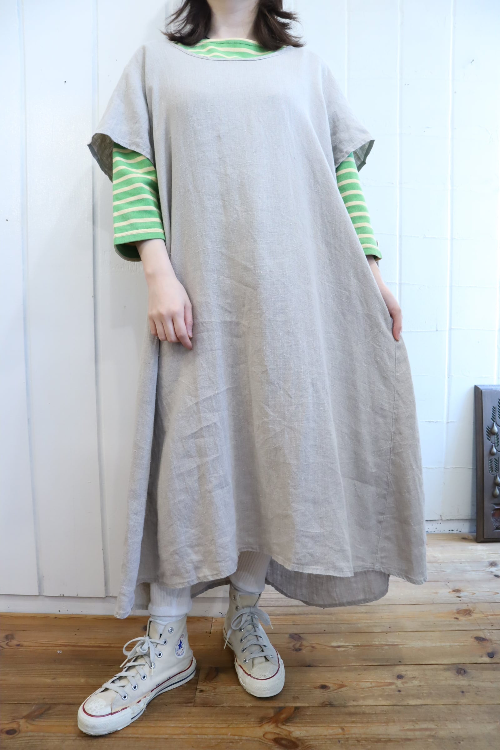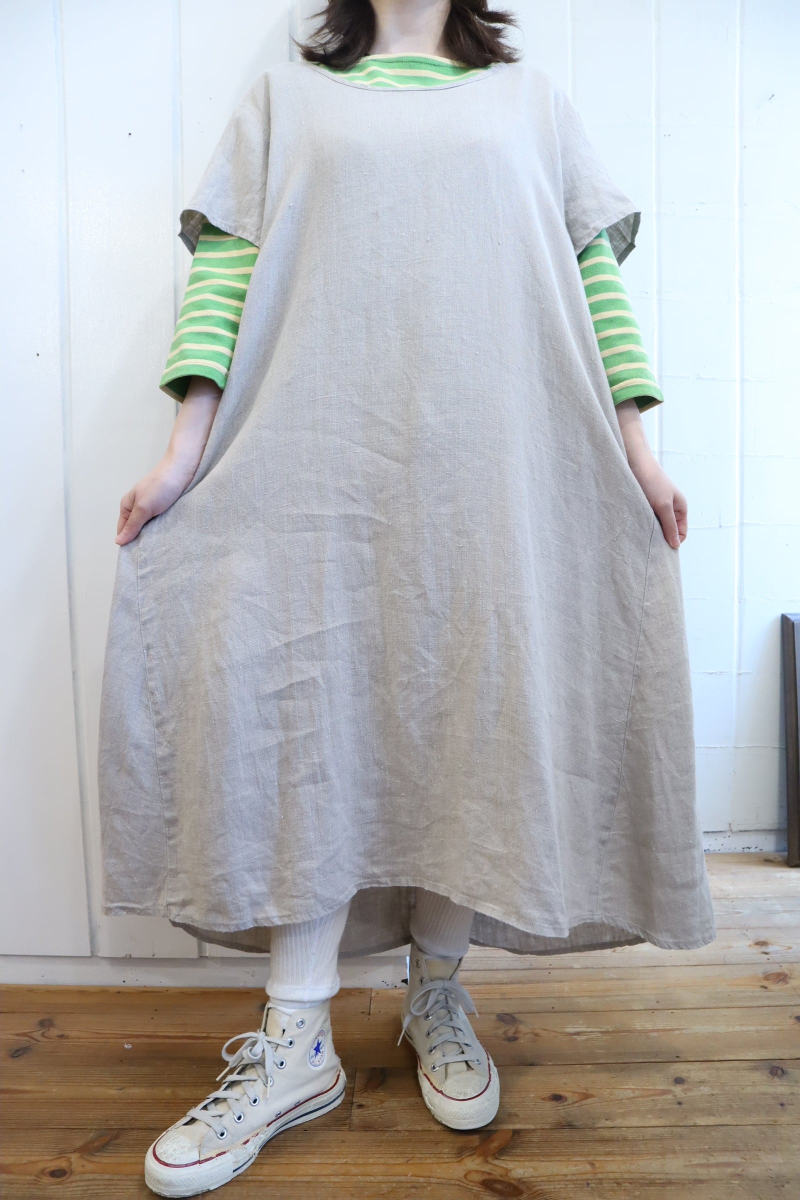 前後ろで長さの違う裾のデザインがユニークなFLAXのドレス。