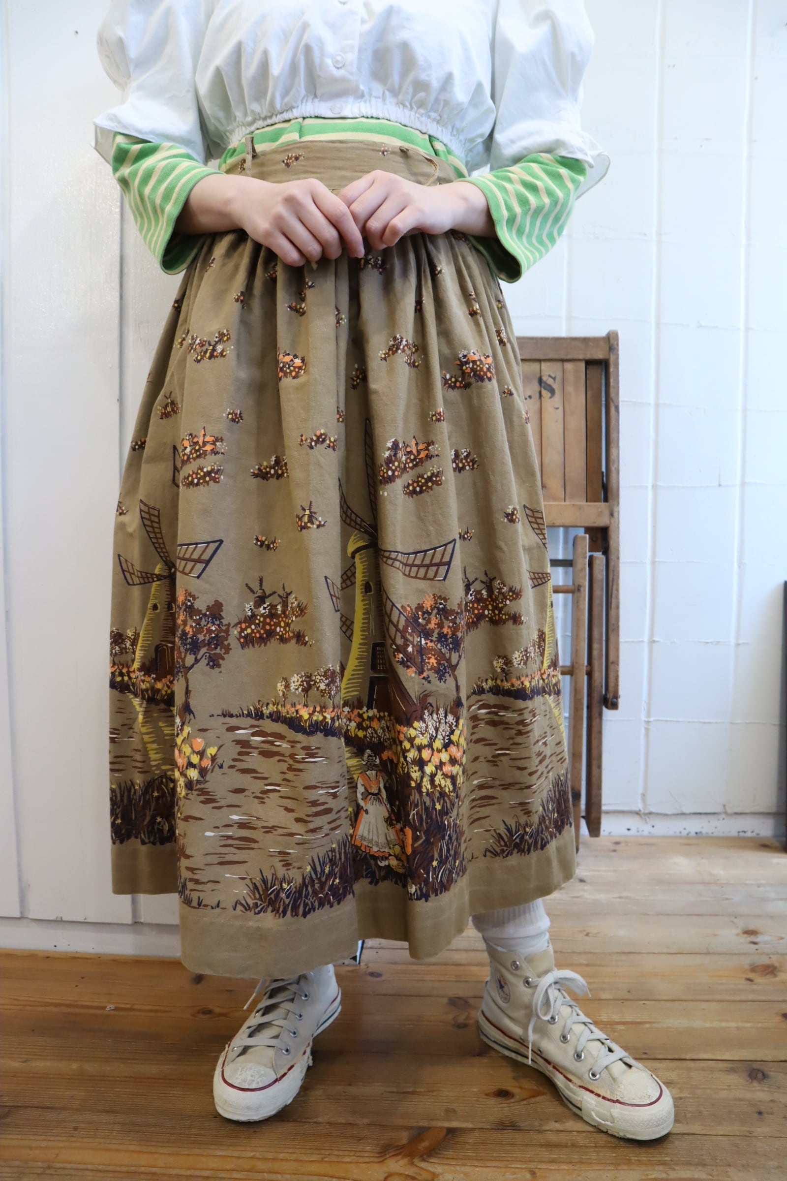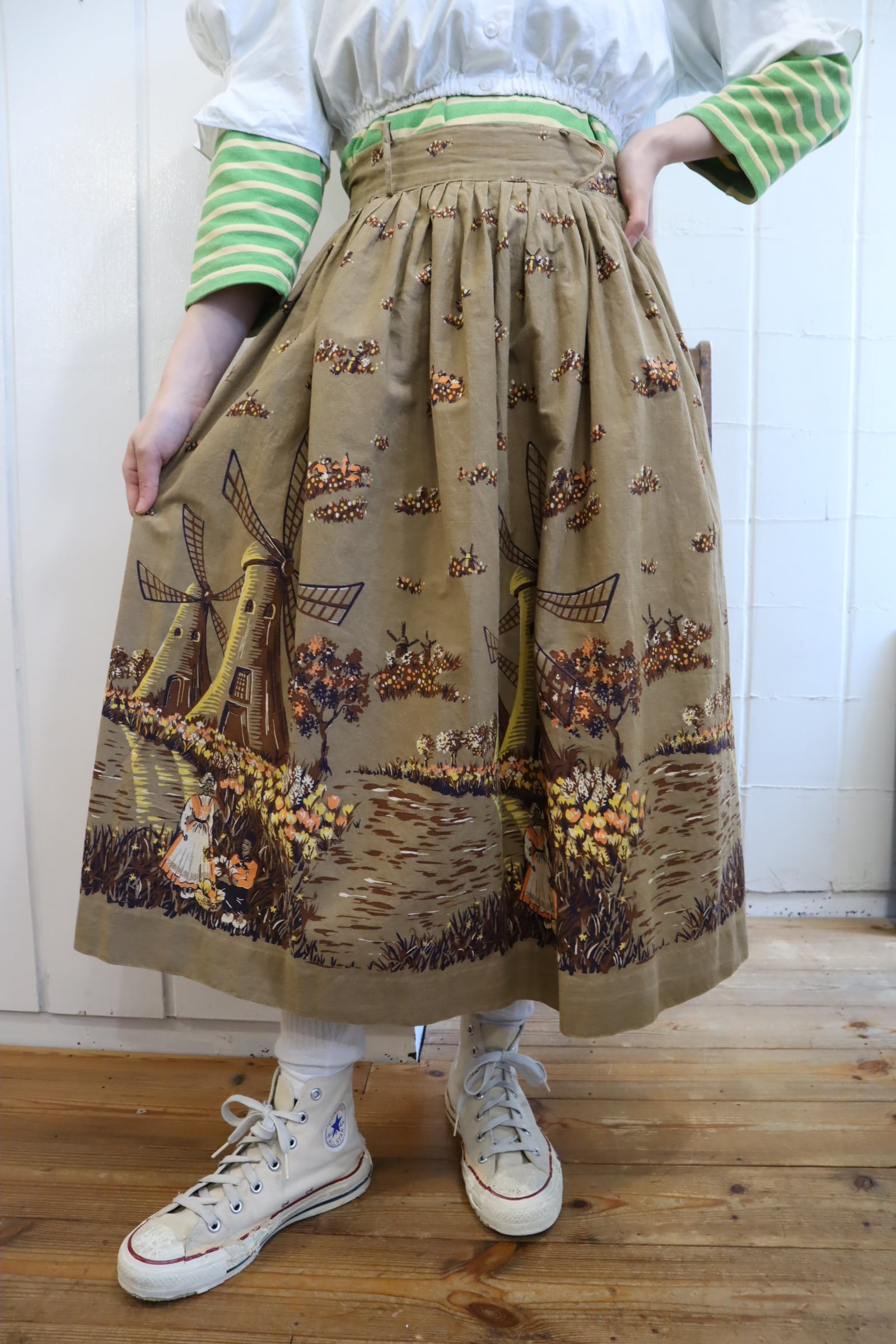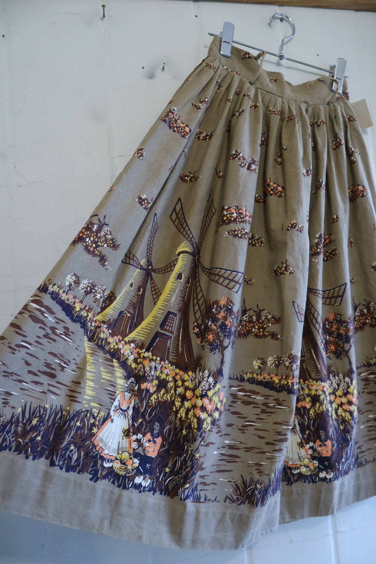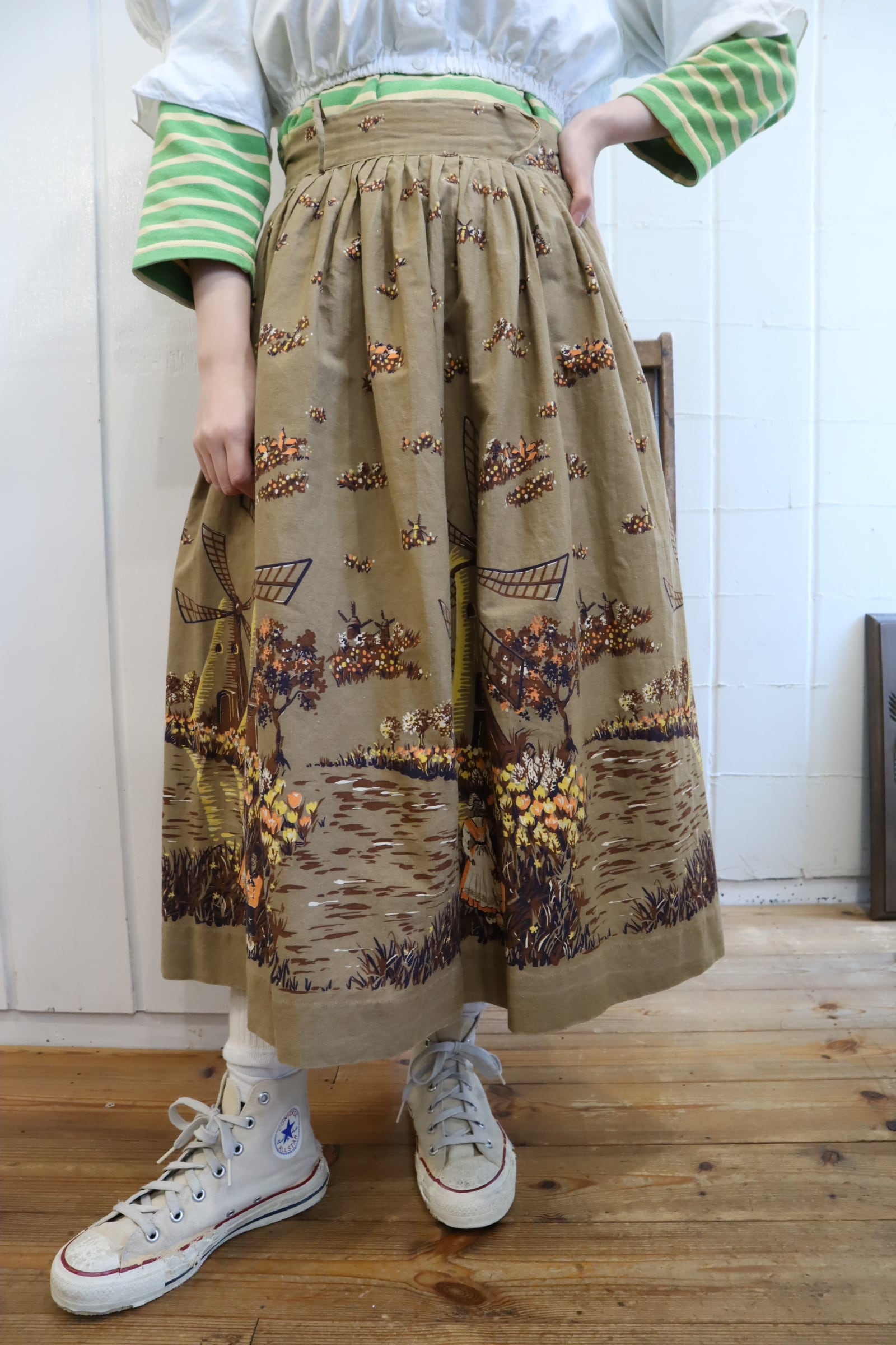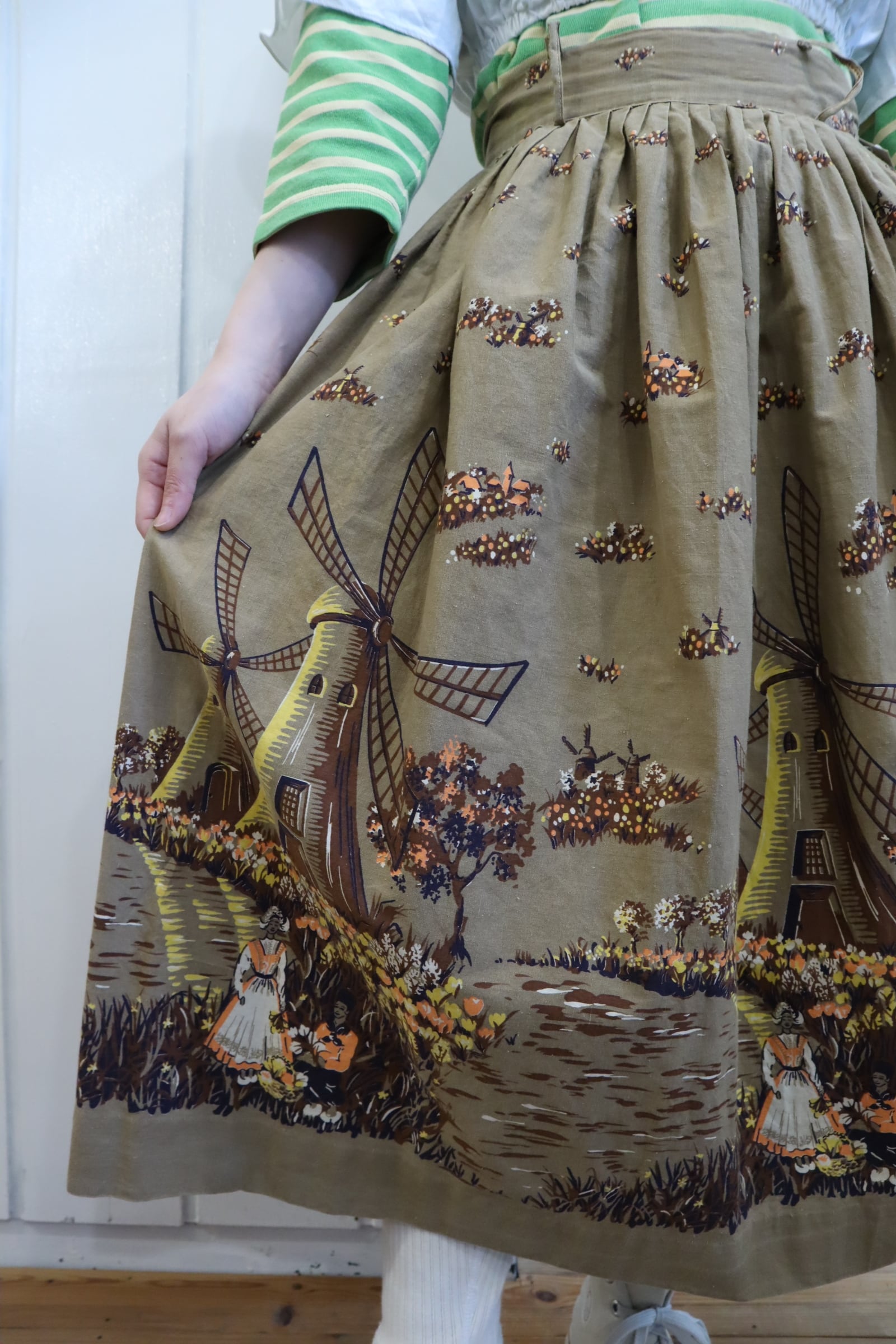 オランダのような風車とお花を摘んでいる女性2人の暖かい情景が素敵なスカート。