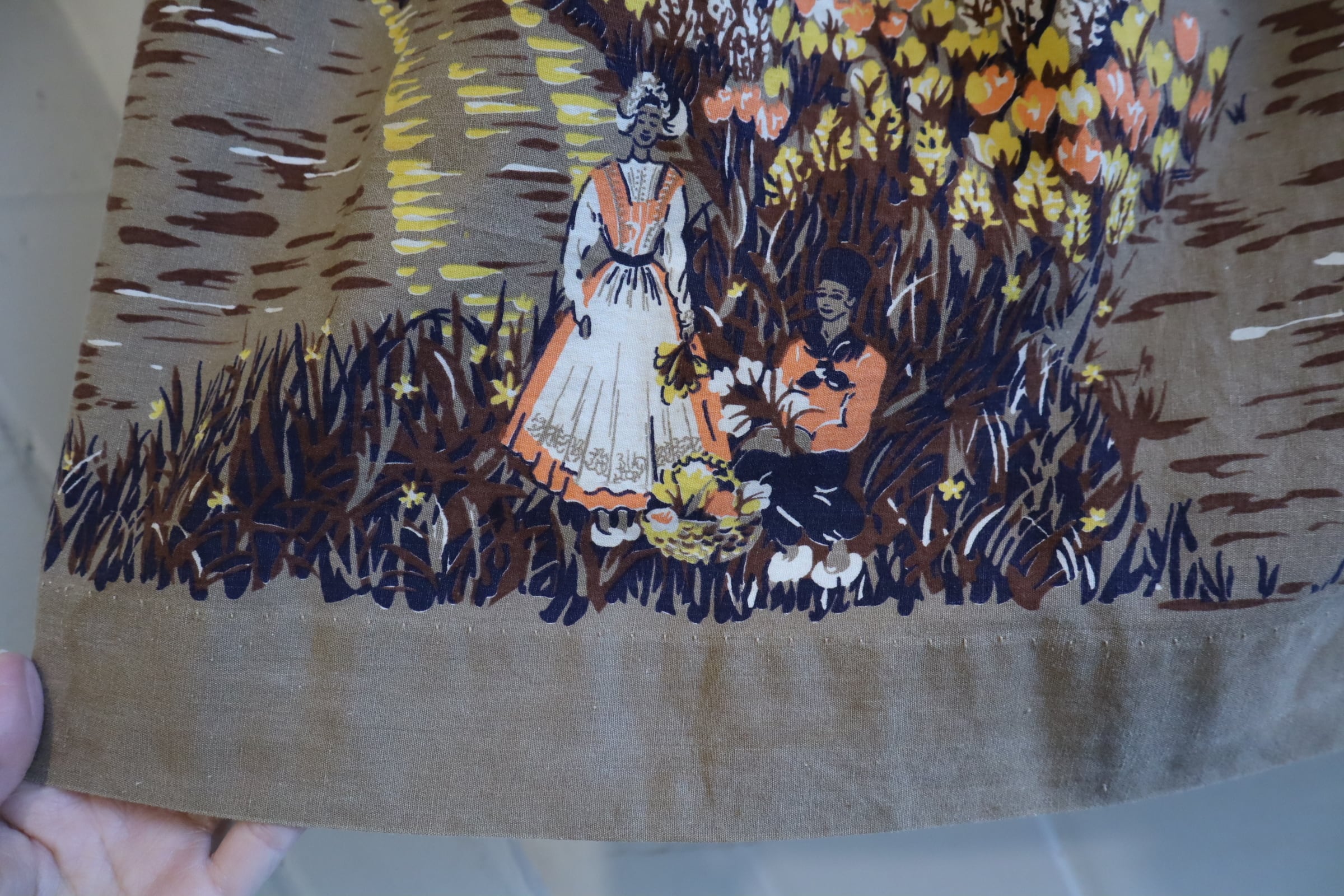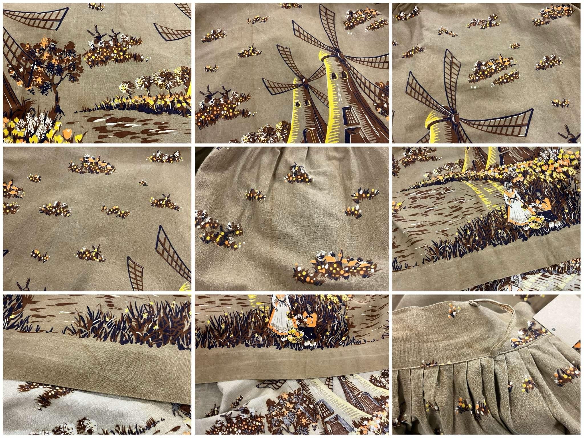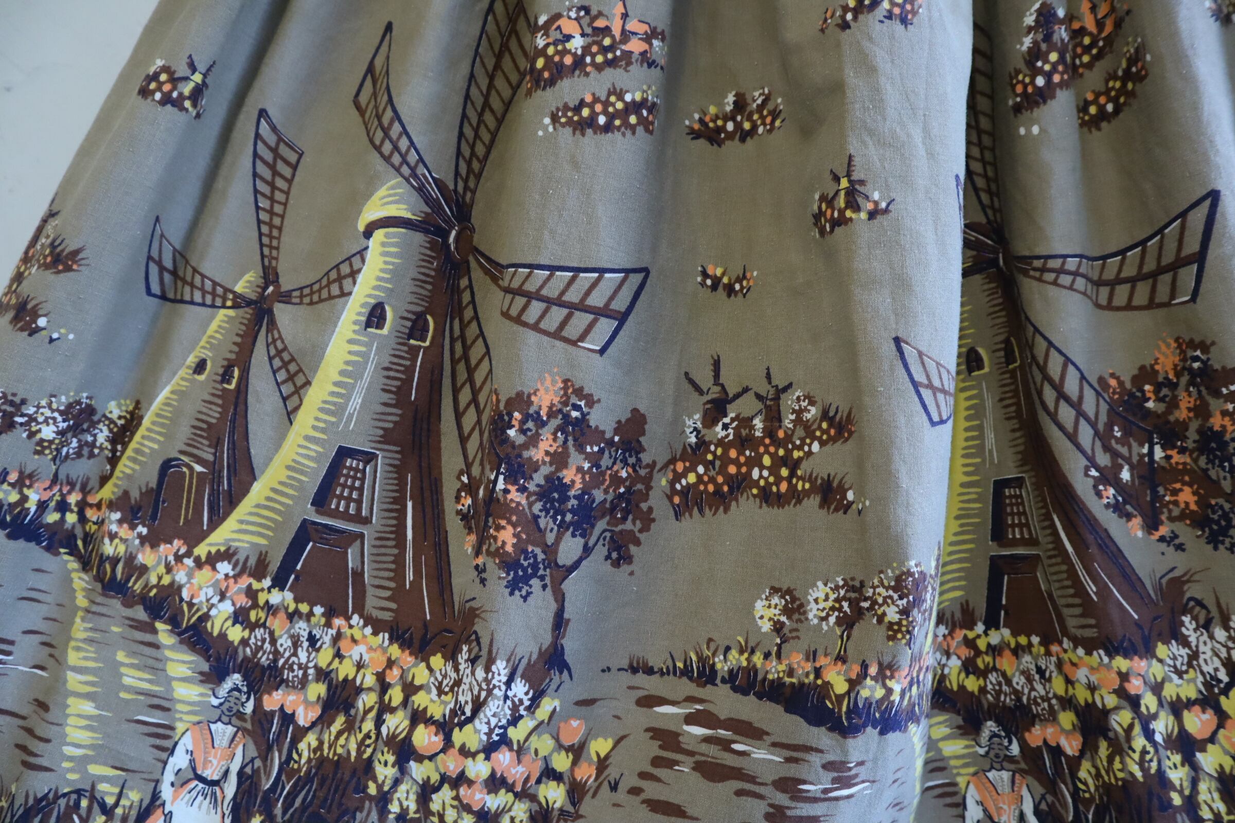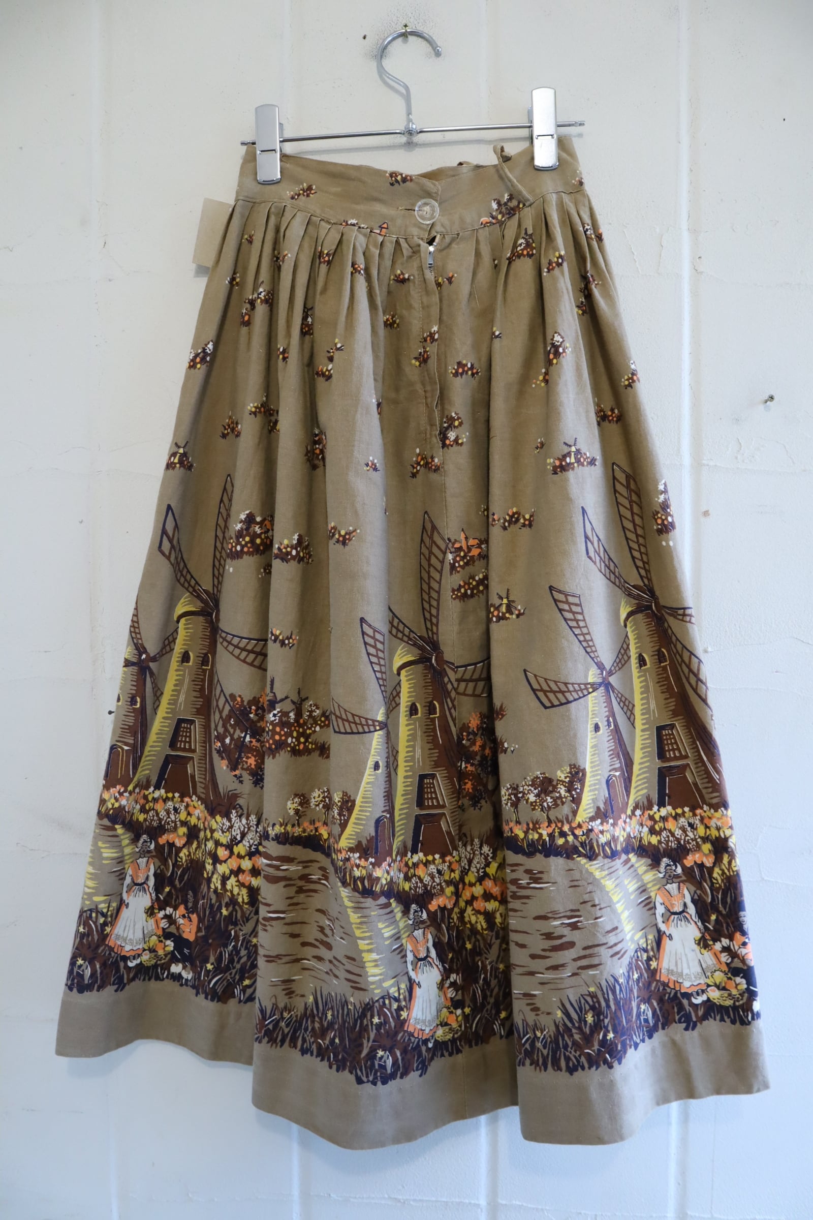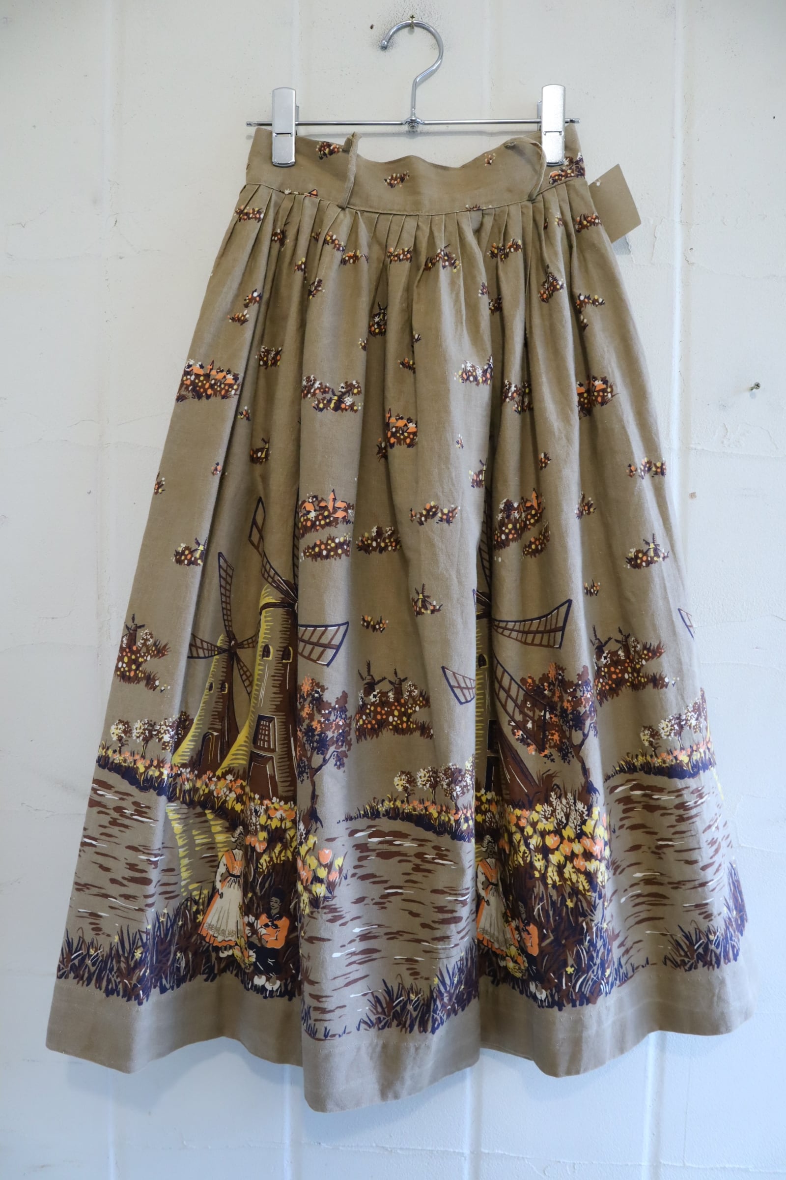 オランダのような風車とお花を摘んでいる女性2人の暖かい情景が素敵なスカート。