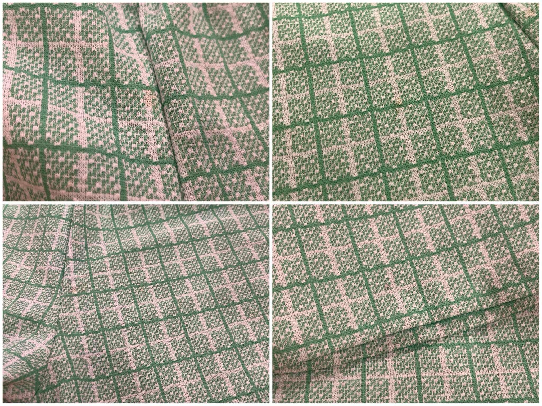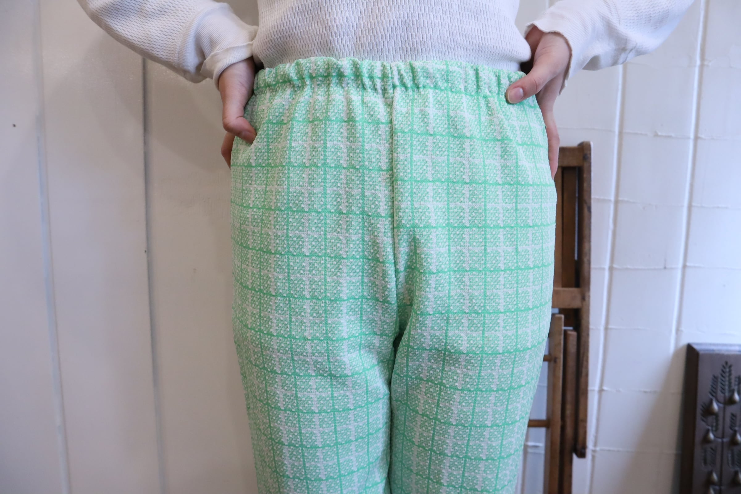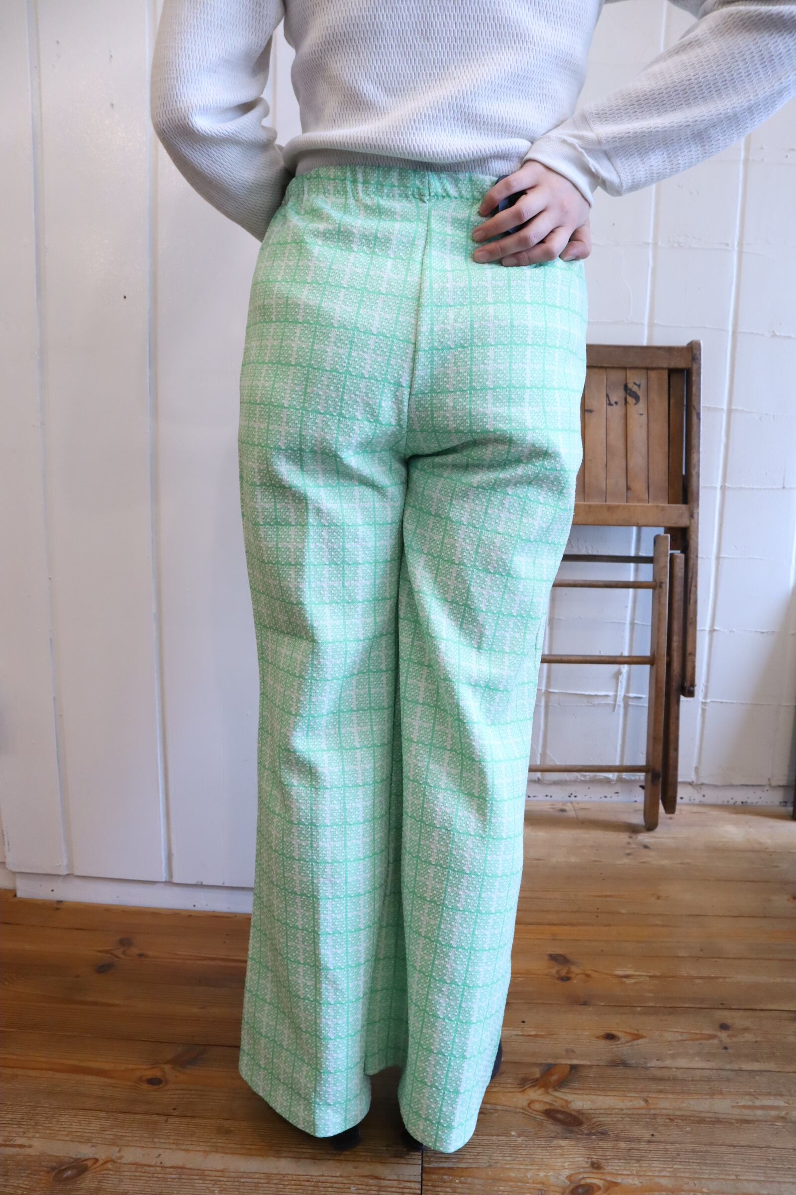 70s lightgreen×white plaid polyester easy pants [l-5242]
