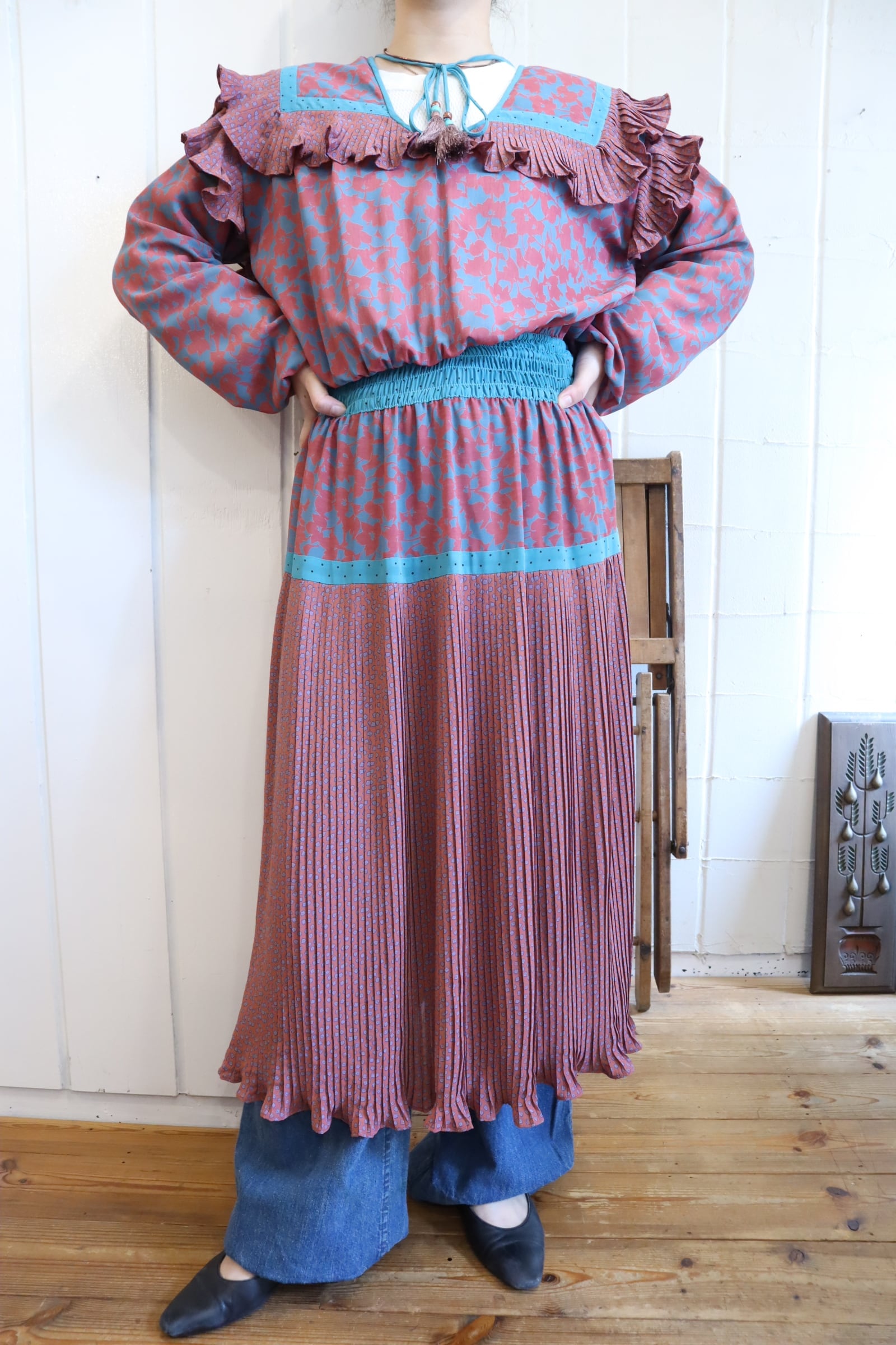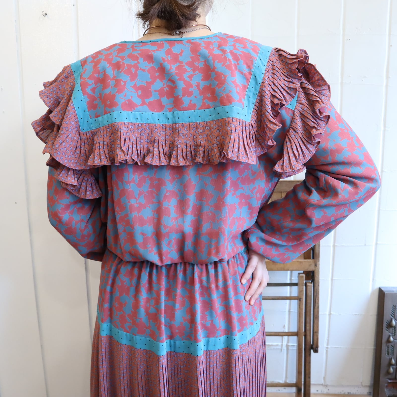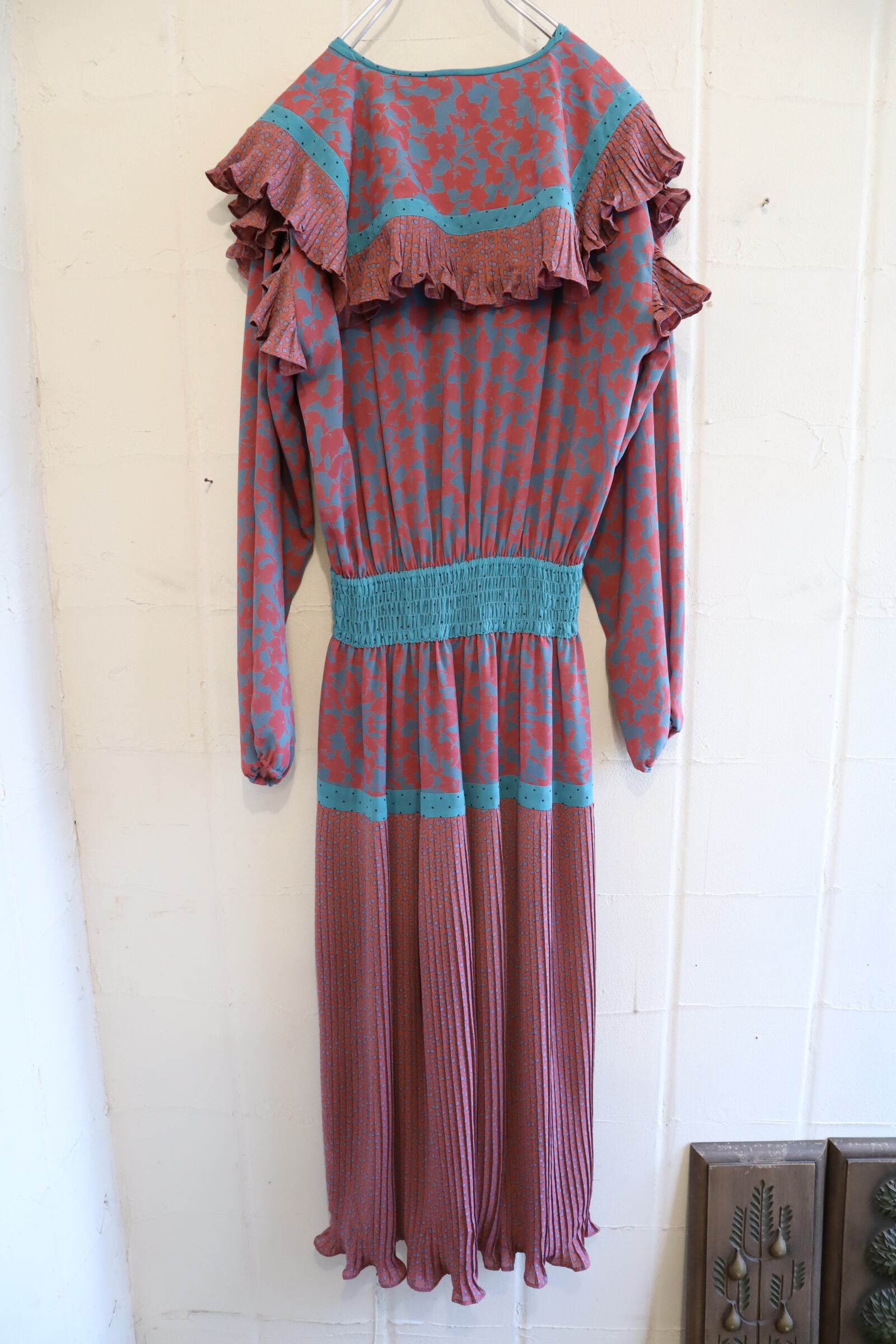 80s Diane Freis dullred×bluegreen geometric dot dress [l-5245]