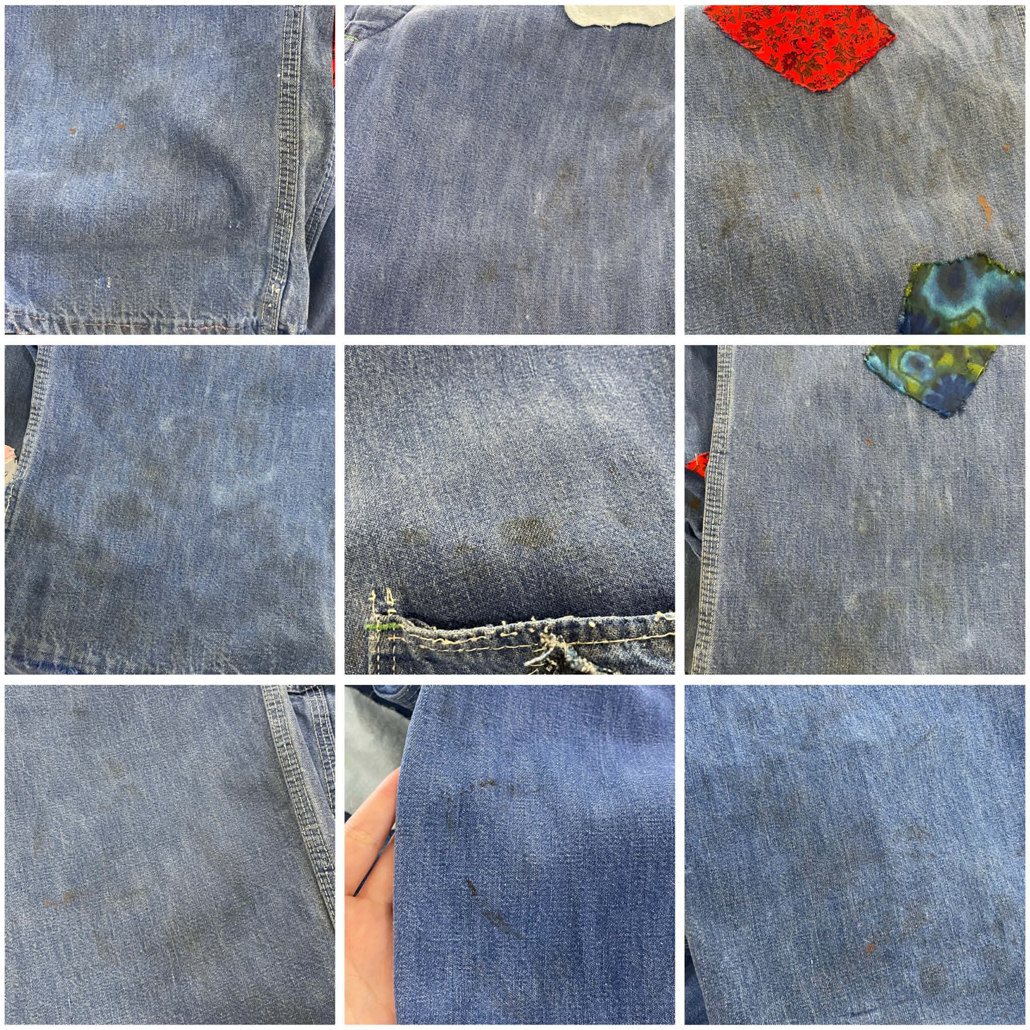 また全体的にシミや汚れ・デニム特有の色落ちや擦れ・ステッチホツレ・穴や破れがございますが、味として着ていただけるかと思います。(似たようなダメージ画像は一部省略しております。)