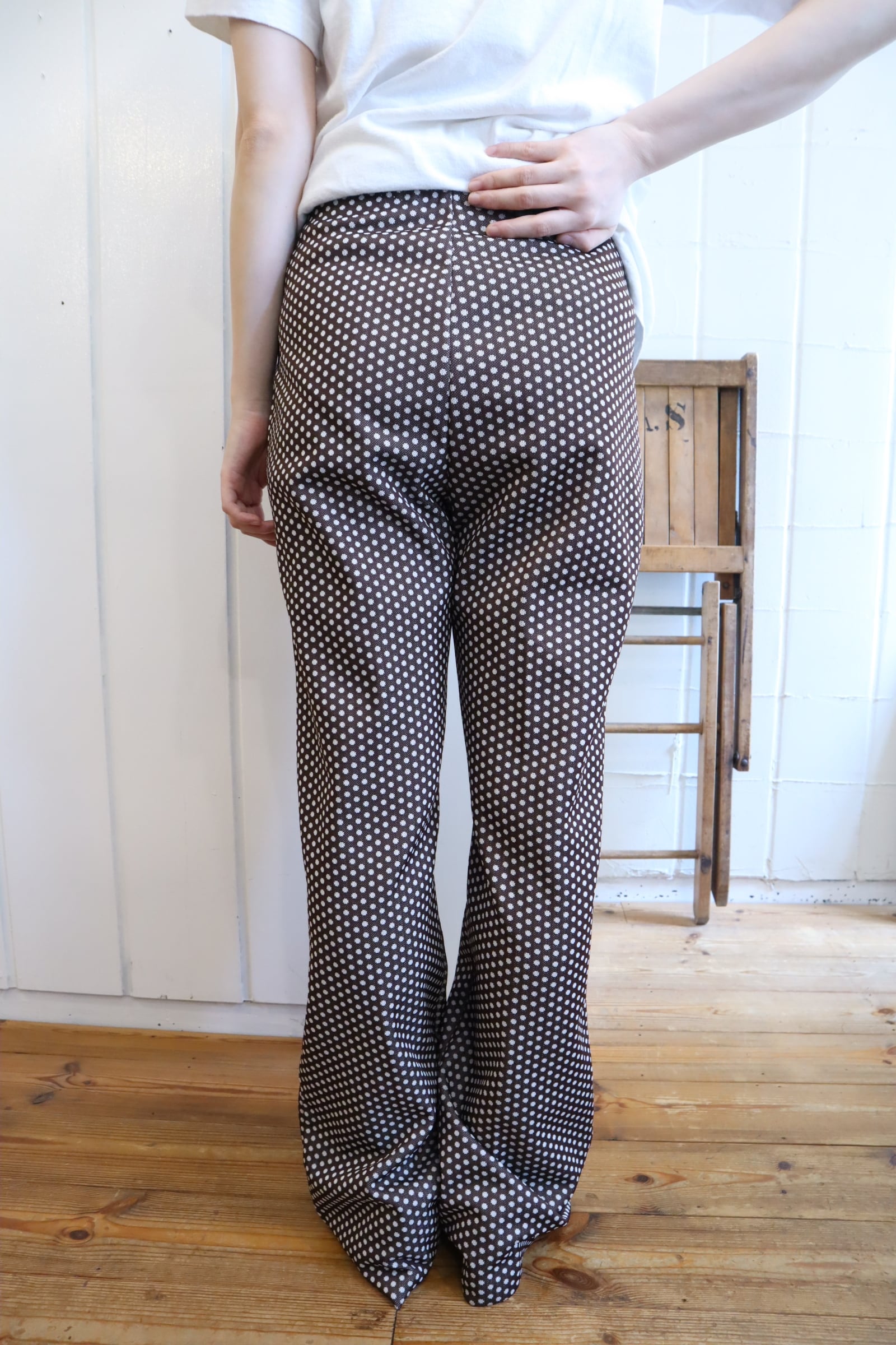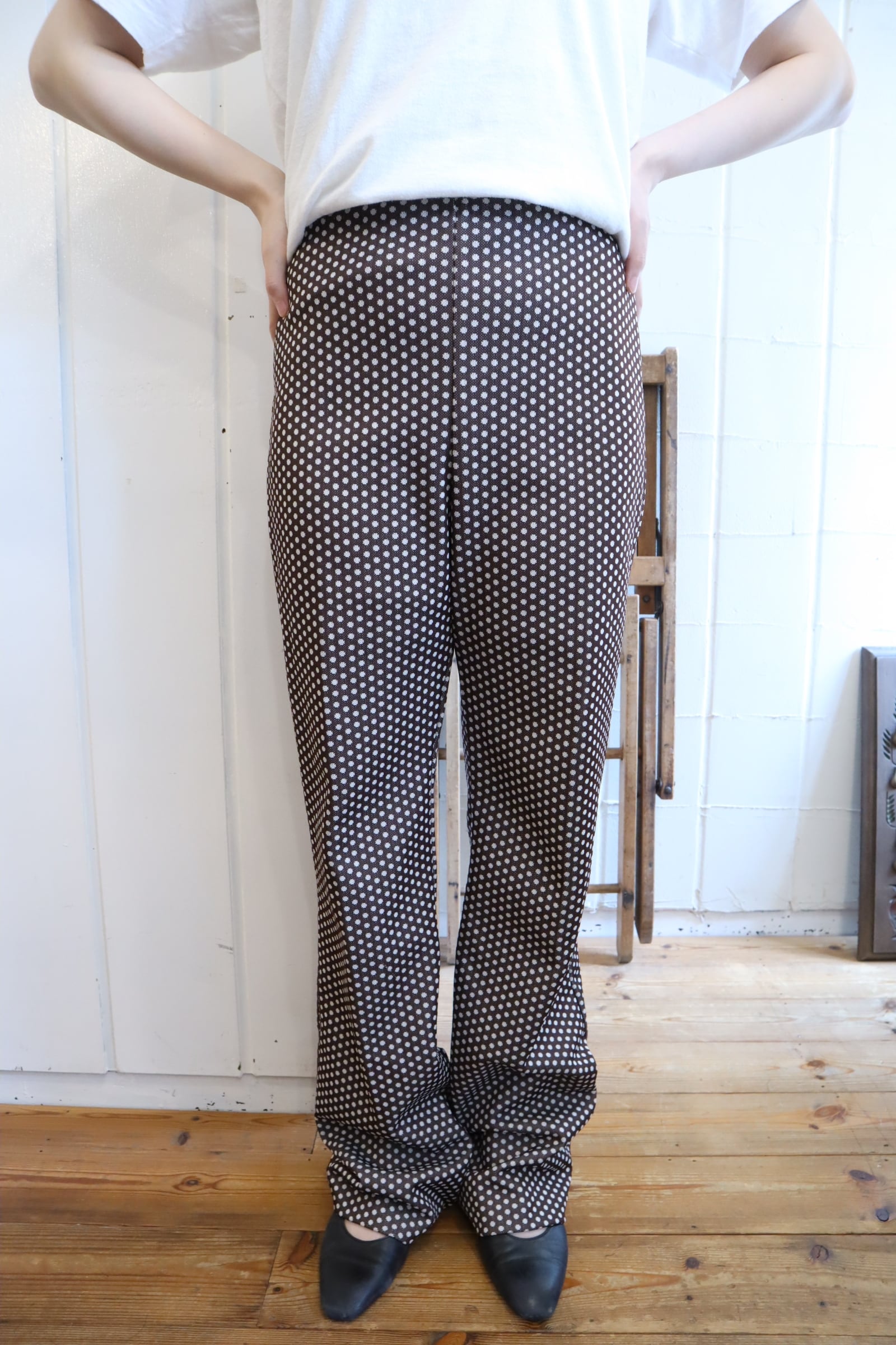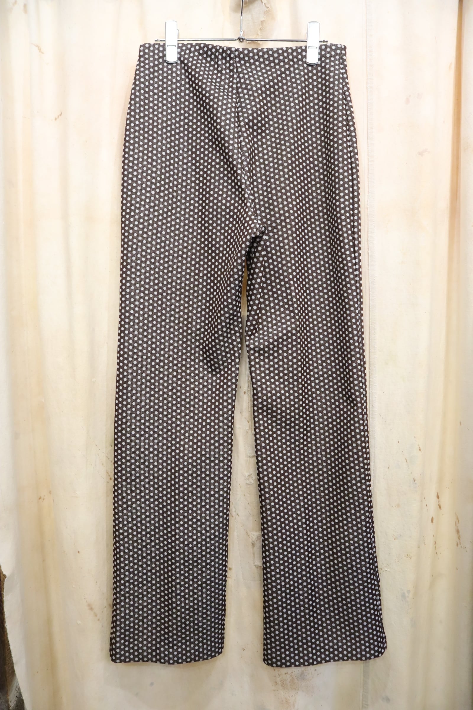 70s brown×white dot polyester pants[l-5274]