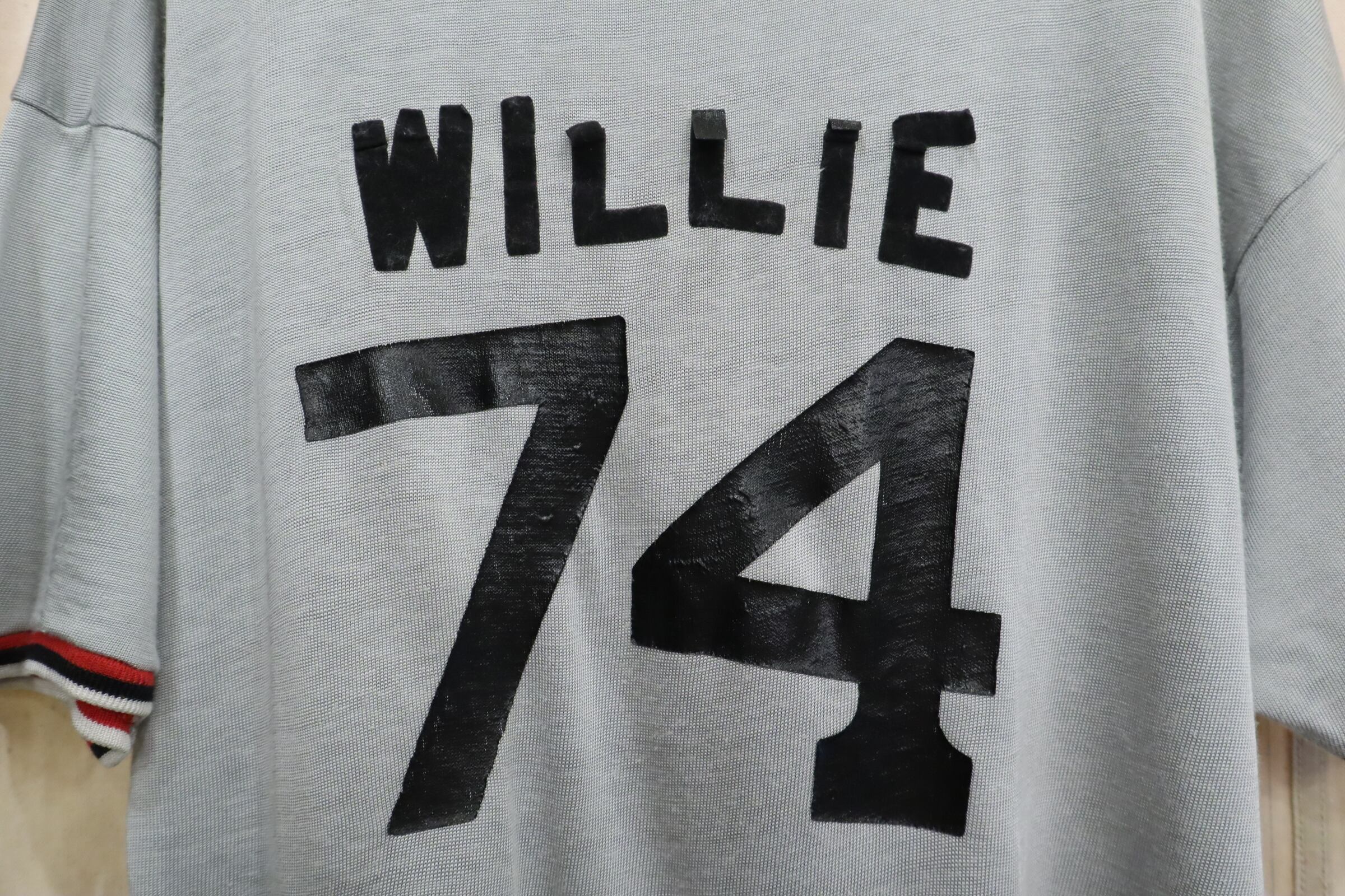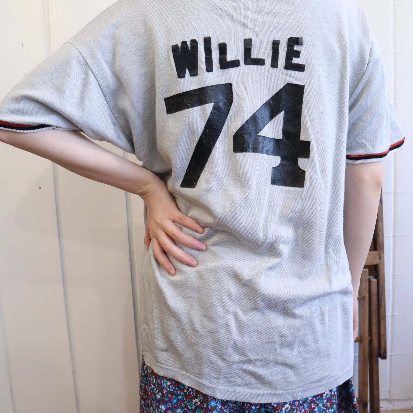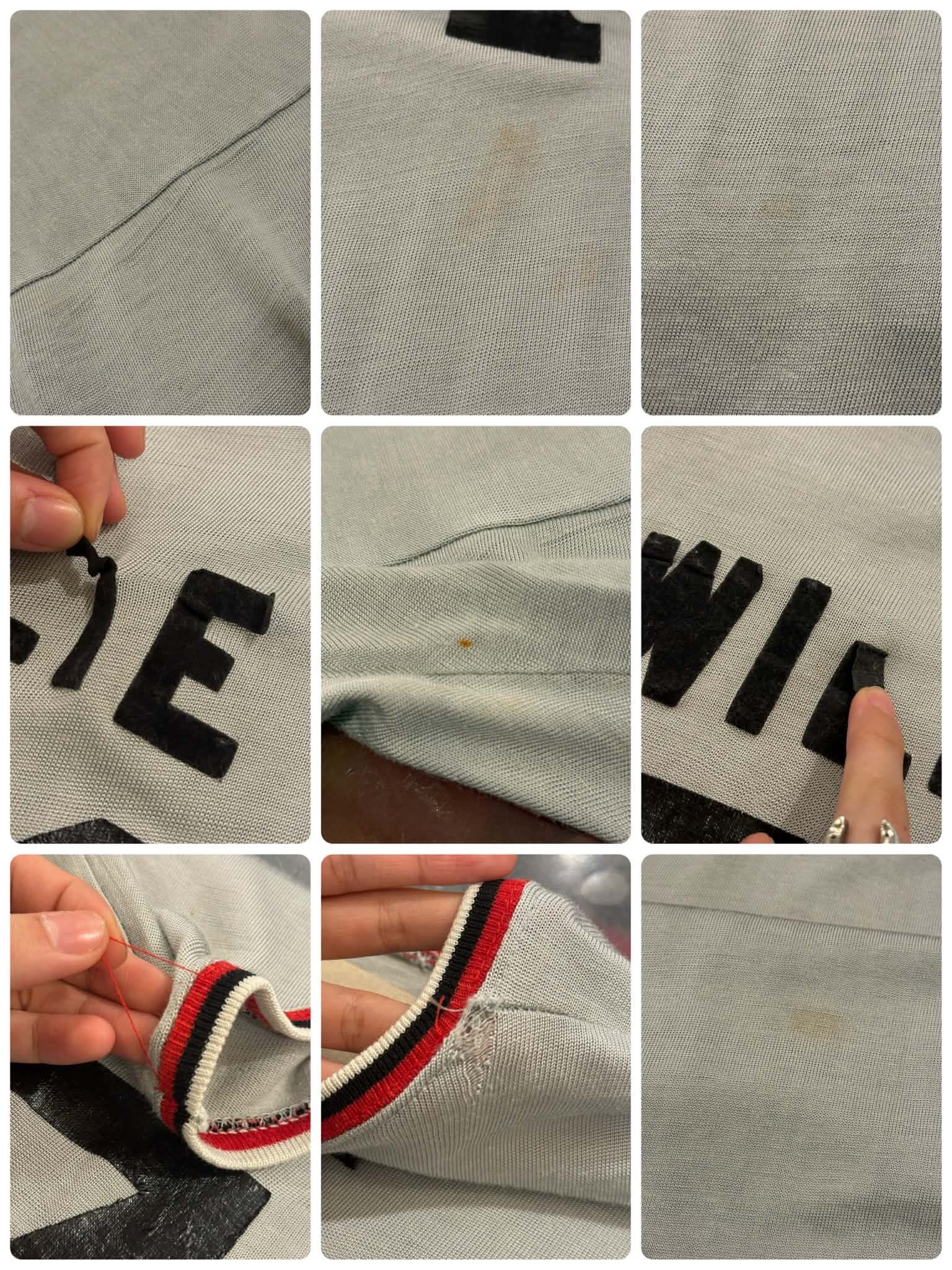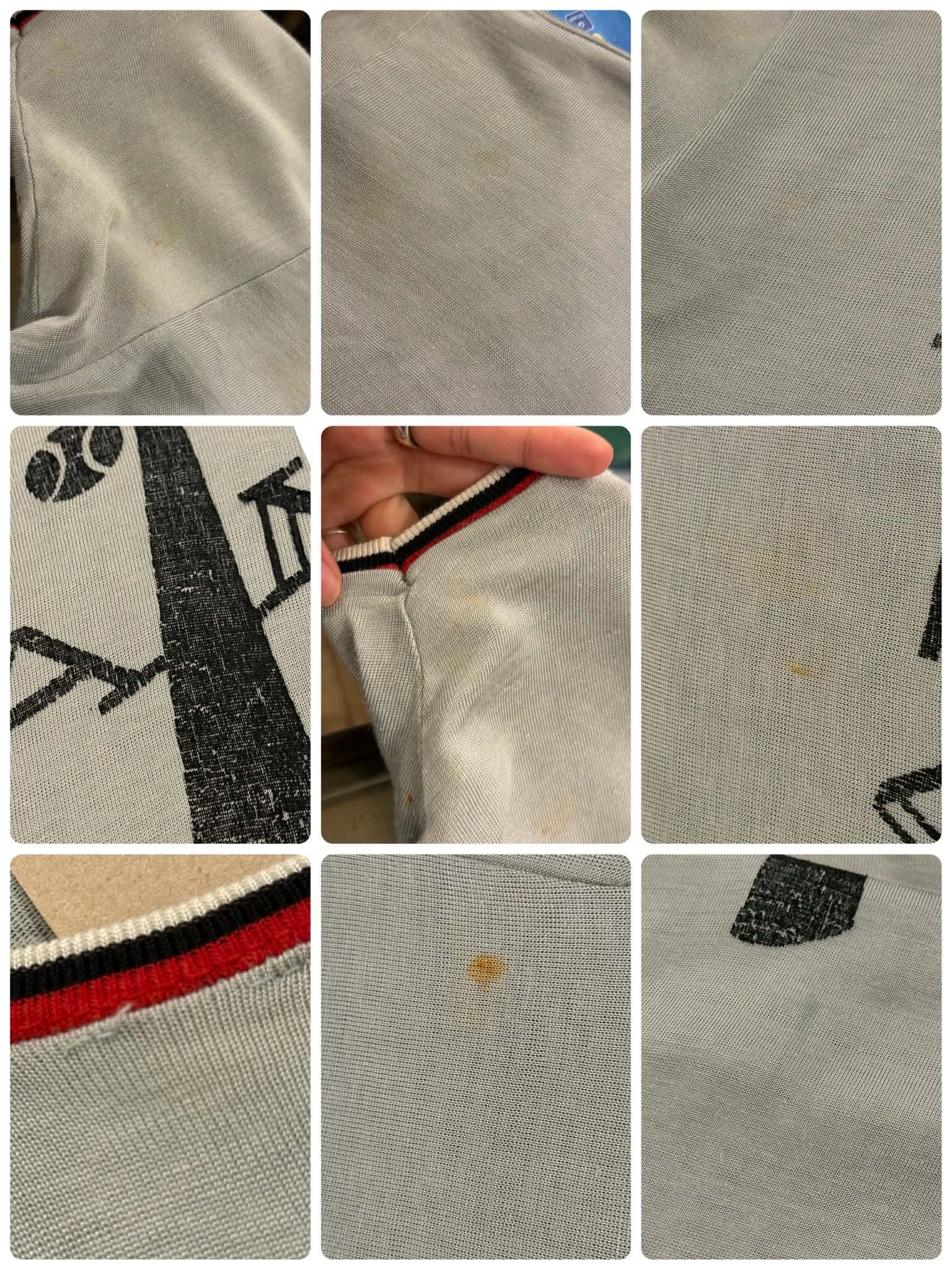 全体的にシミ汚れや汚れ、プリントひび割れやネームフロッキーパッチの剥がれがございますが、古着の雰囲気として着て頂けるかと思います。