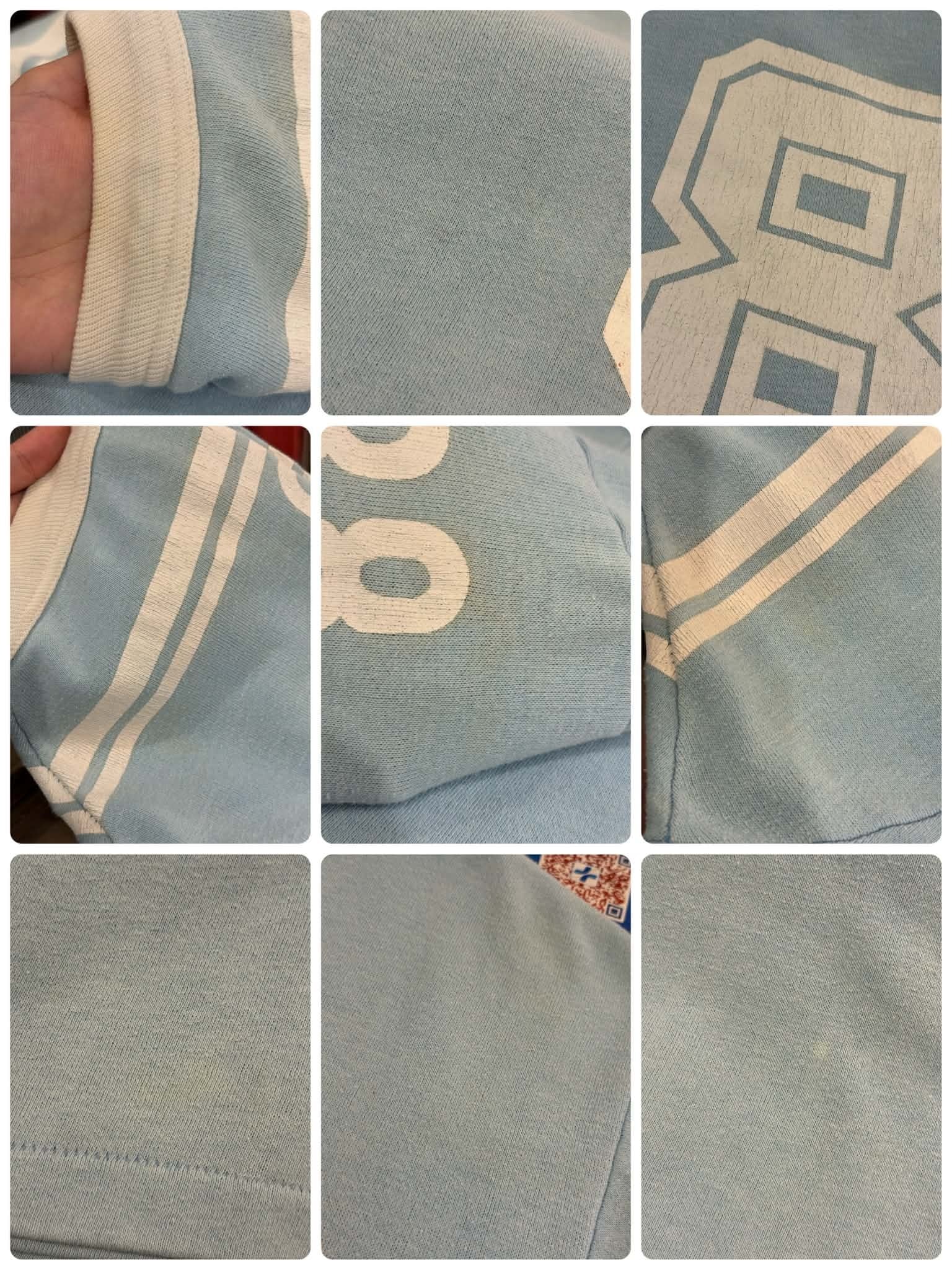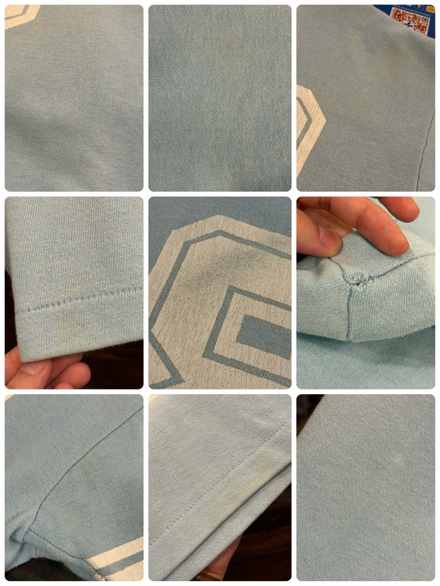 ボディにいくつかシミ・色褪せ・一部ホツレ、プリントにひび割れ・薄れがございますが、いずれも古着の味として着て頂けるかと思います。