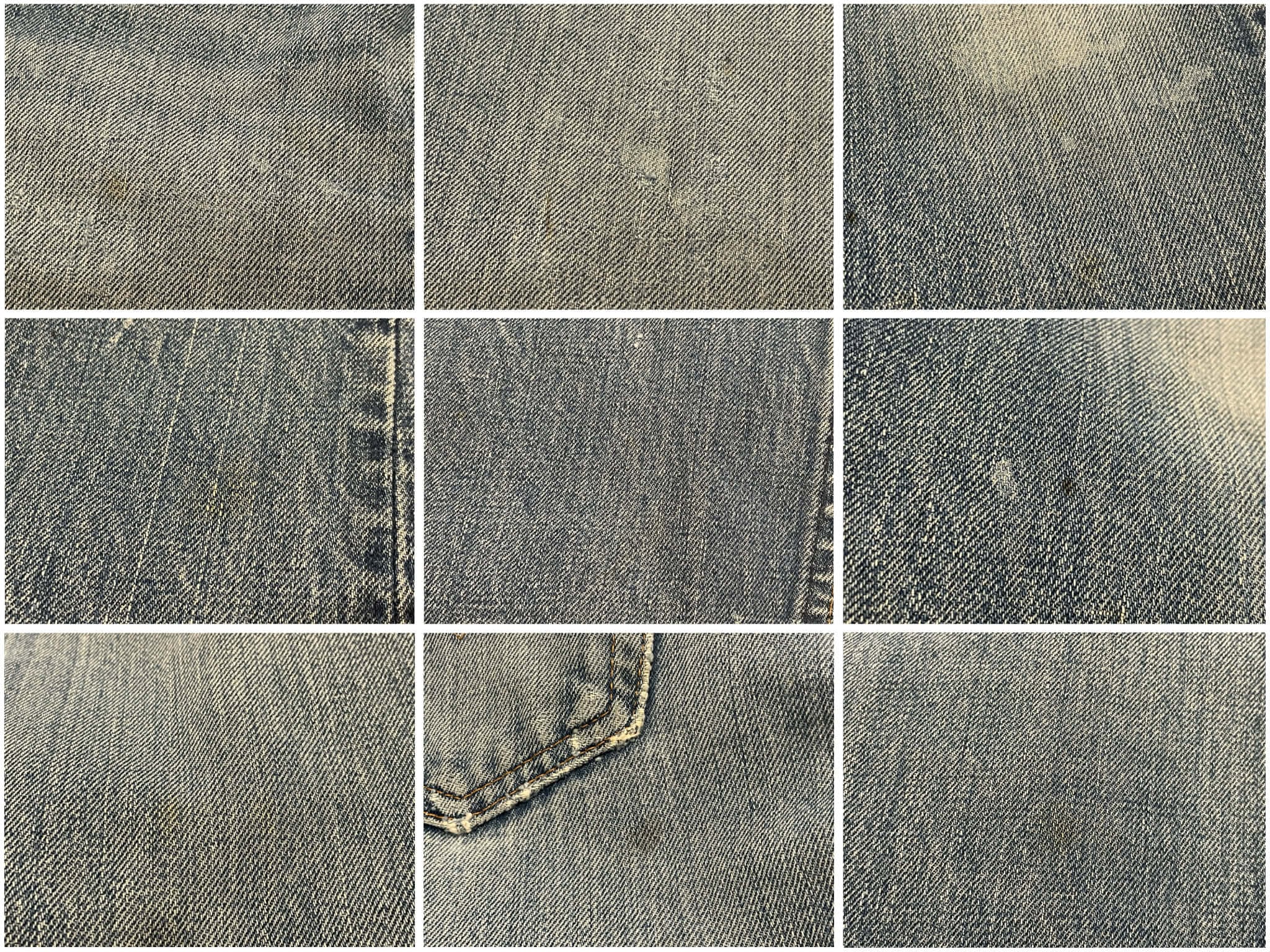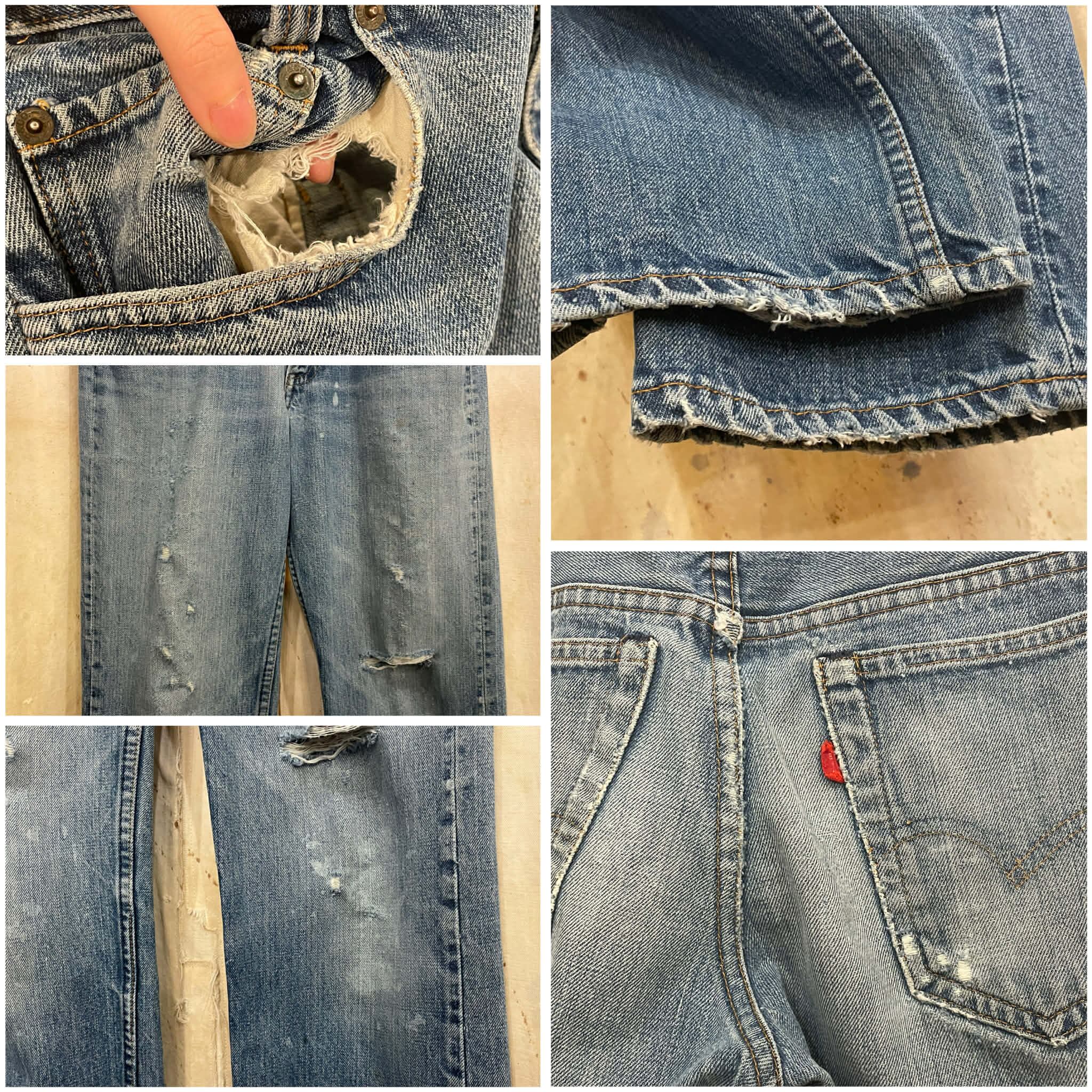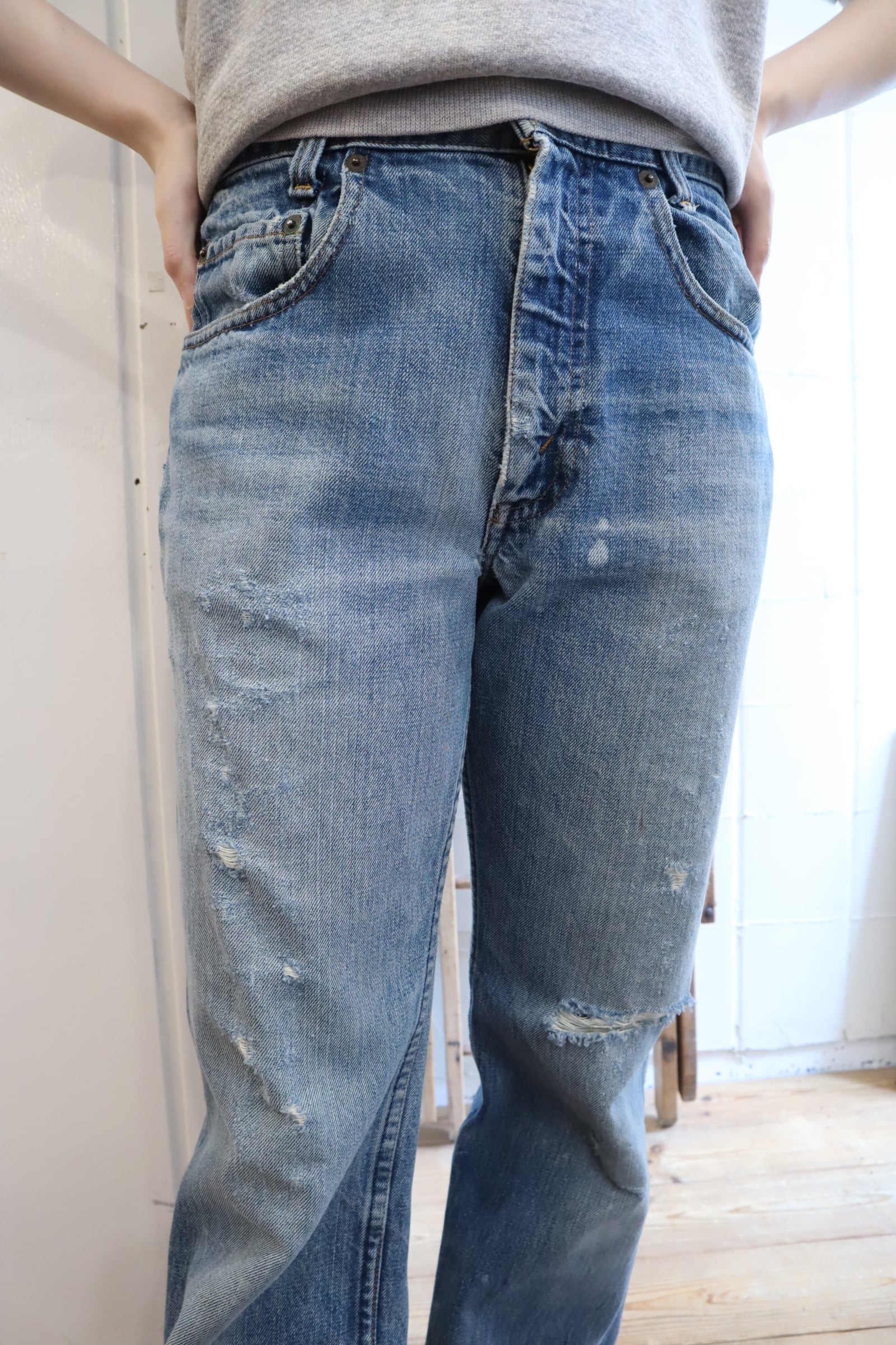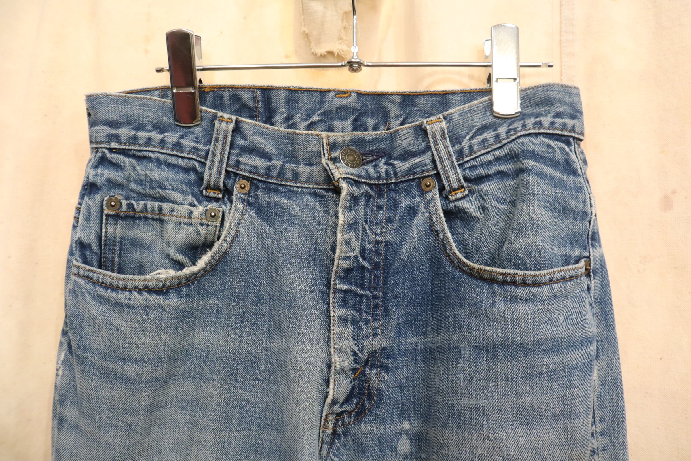 全体的にシミ汚れや破れ、毛羽立ちなど雰囲気のあるダメージデニムです。