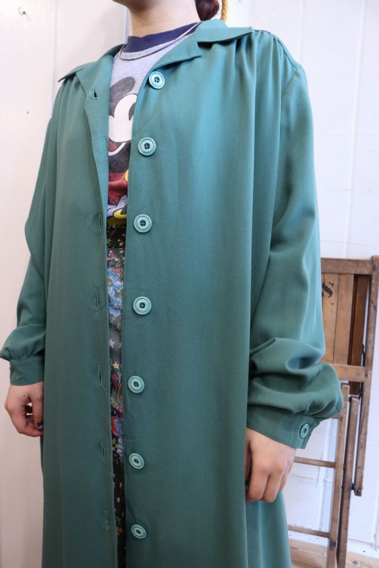 クリーミーなグリーンカラーが可愛いロングシャツです。