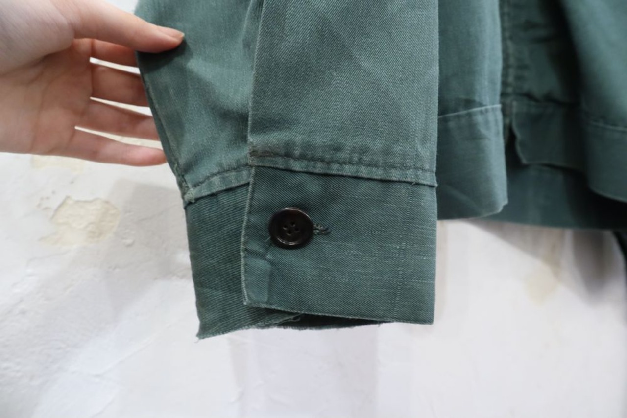 右袖のボタンが付け替えられており、後ろ身頃裾あたりにベルトが付いていたような跡がございます。