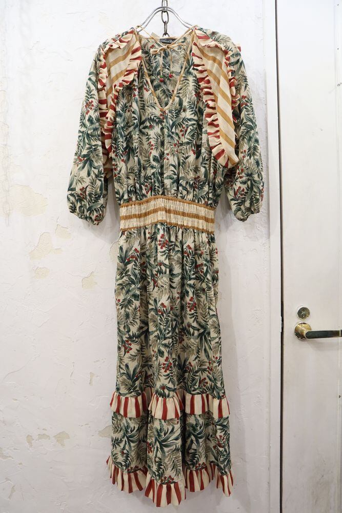 "Diane Freis" cream × green × red flower & leaf pattern long sleeve dress [k-18]