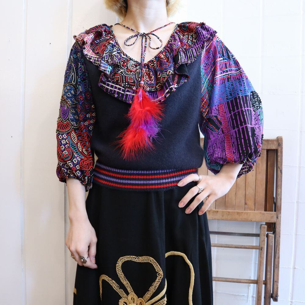black × red × blue flower frill & beads long sleeve tops [k-20]