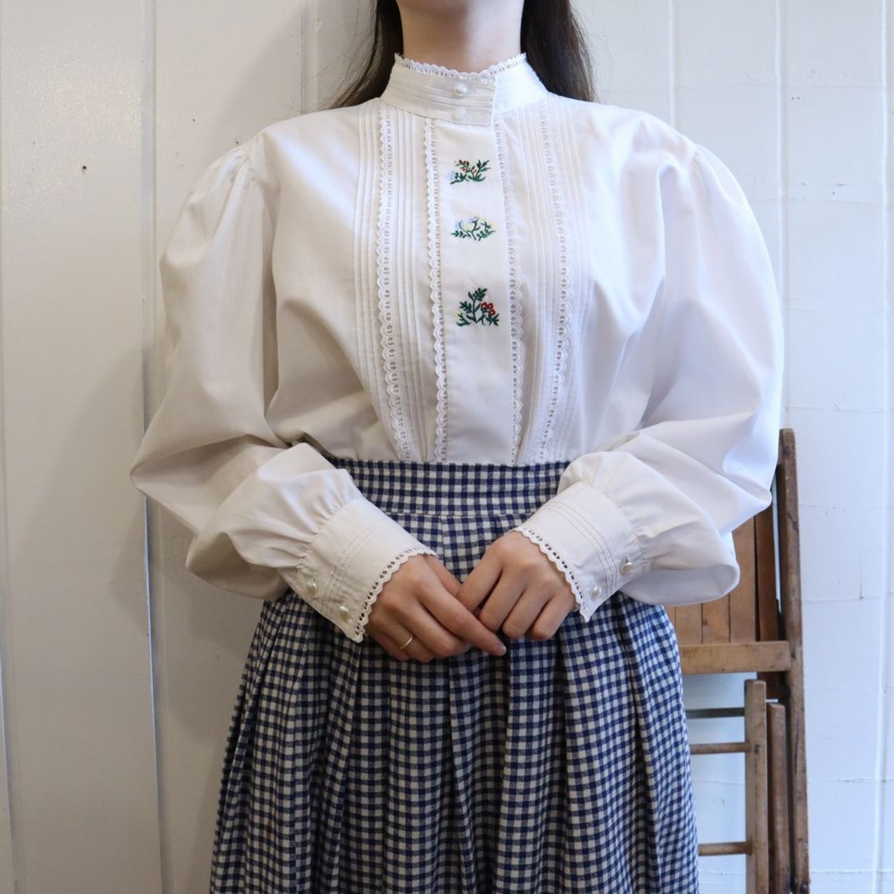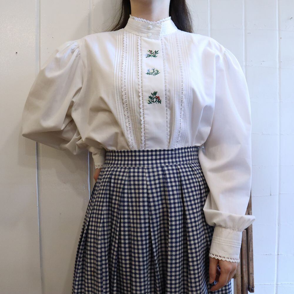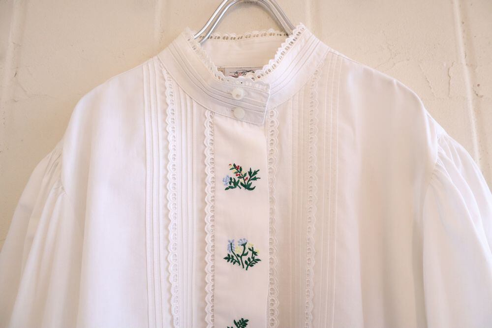 white flower embroidery pin tuck long sleeve blouse [l-52]