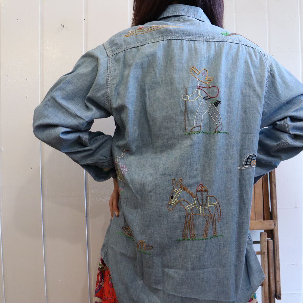 メキシコモチーフの刺繍が可愛いシャンブレーシャツです。