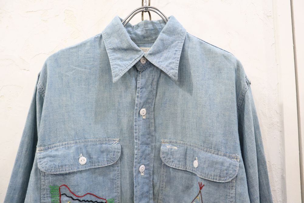 70s ”BIGMAC” light blue × colorful embroidery chambray shirt [k-64]