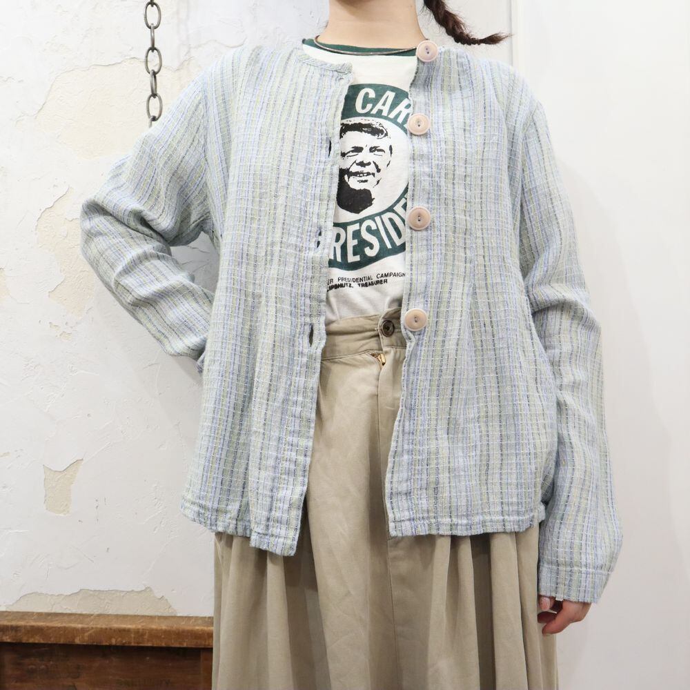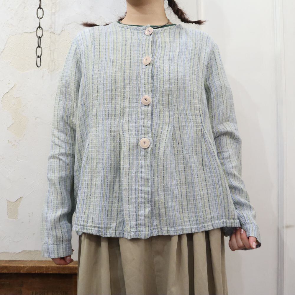 ”FLAX” light blue × light green stripe long sleeve linen shirt [k-114]