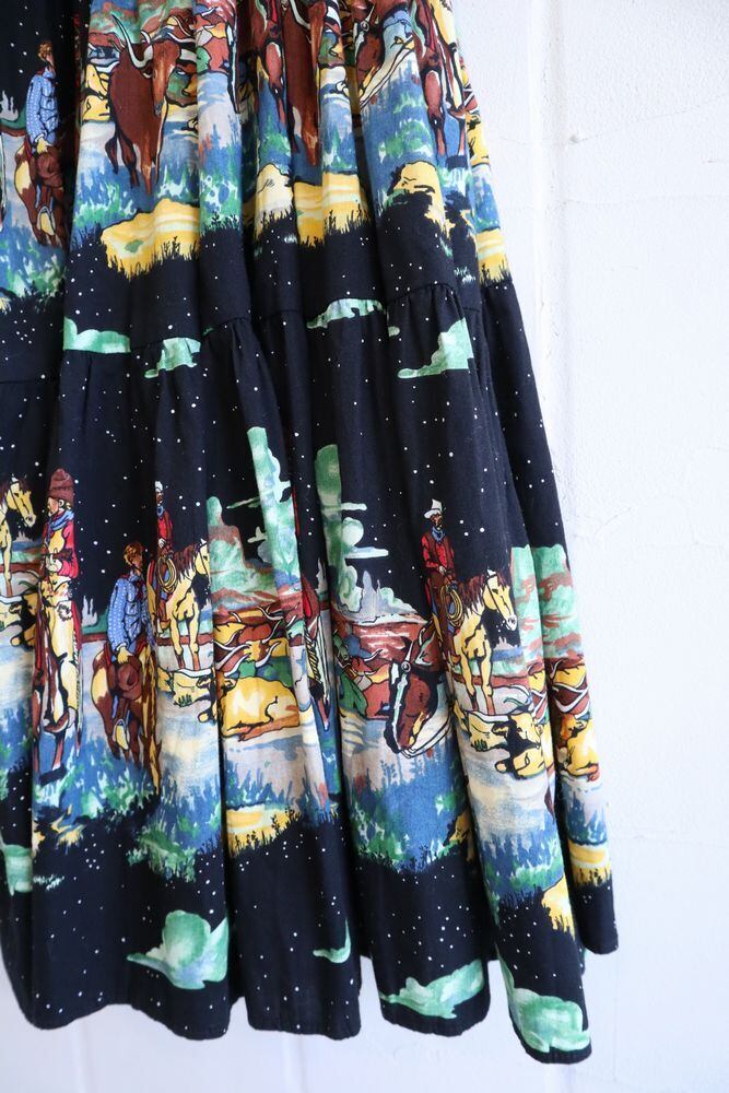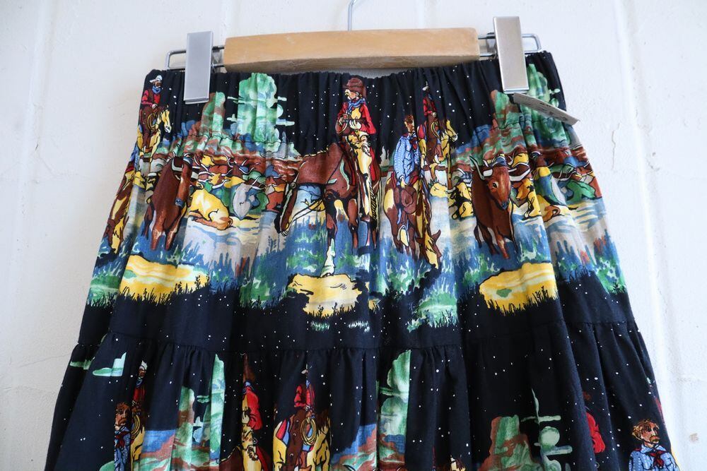 カウボーイと馬や牛柄が可愛いティアードスカートです。